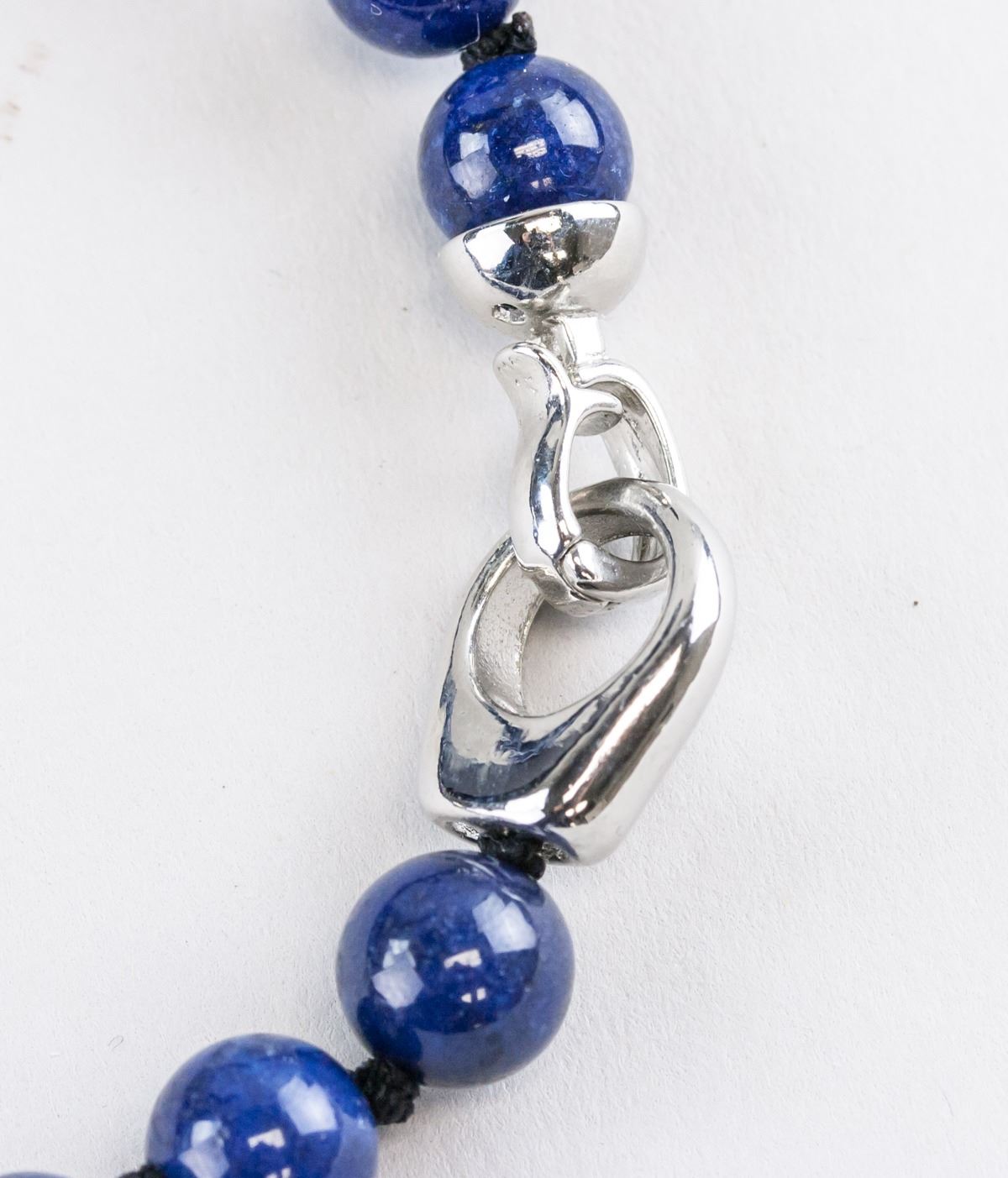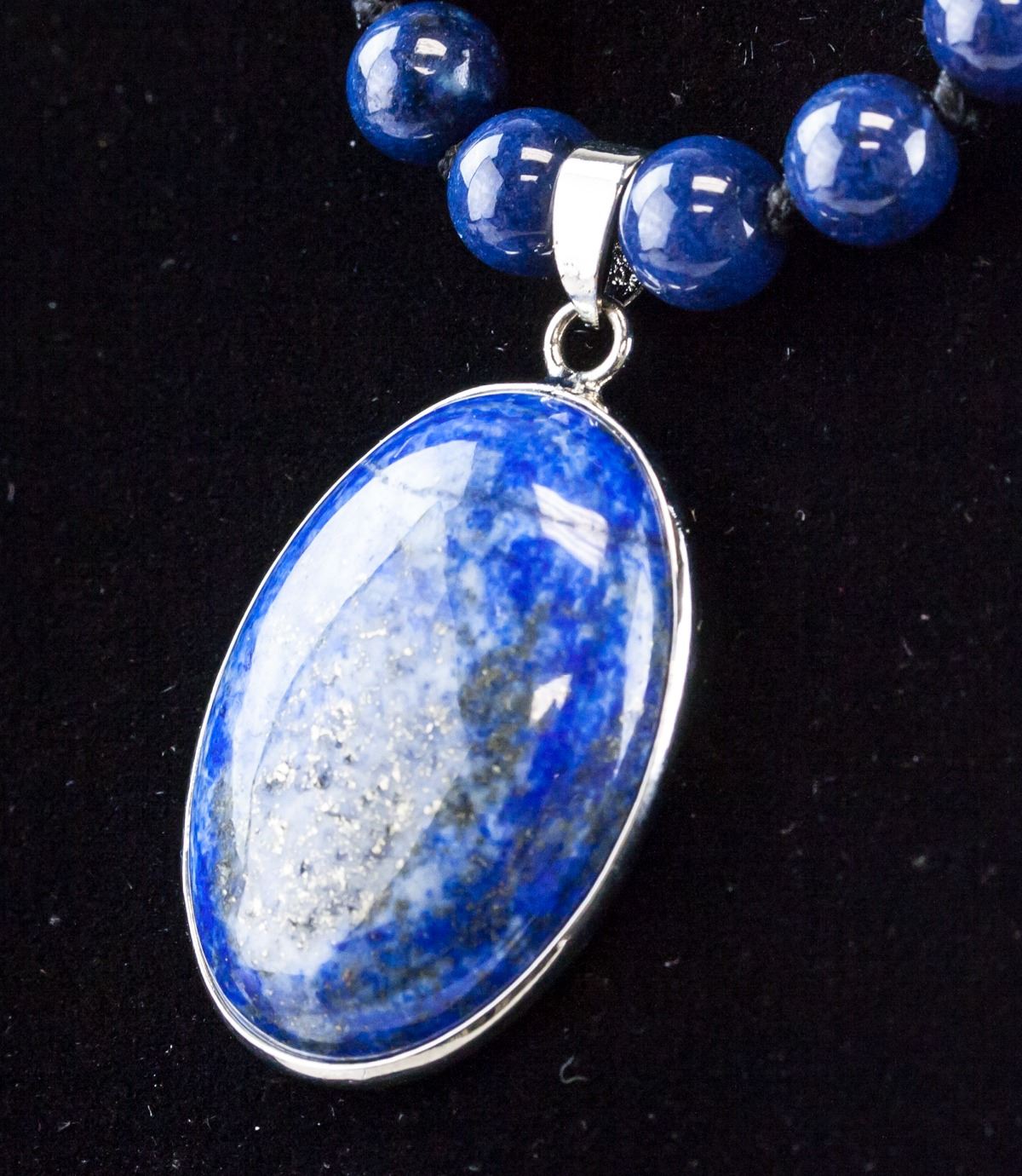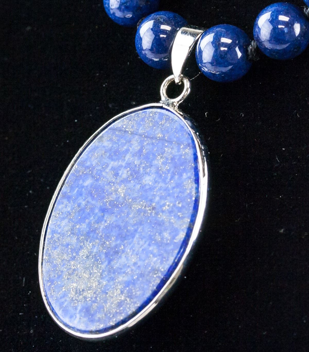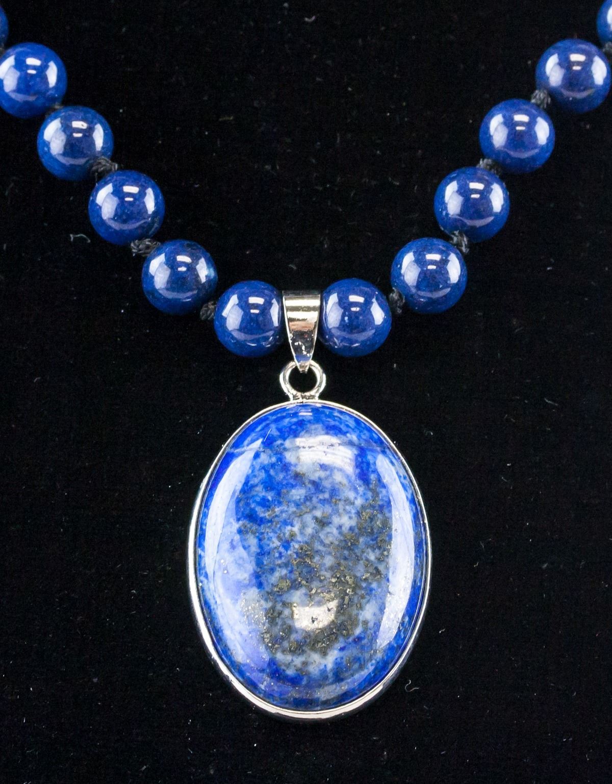 Chinese lapis pendant and necklace. Pendant set with oval shape lapis. Of round lapis beads. 6.5 x 2.5 x 14 cm, 59 grams