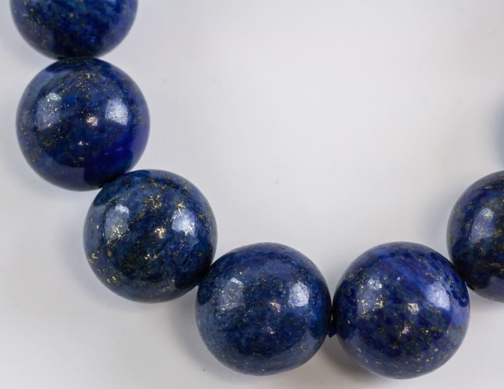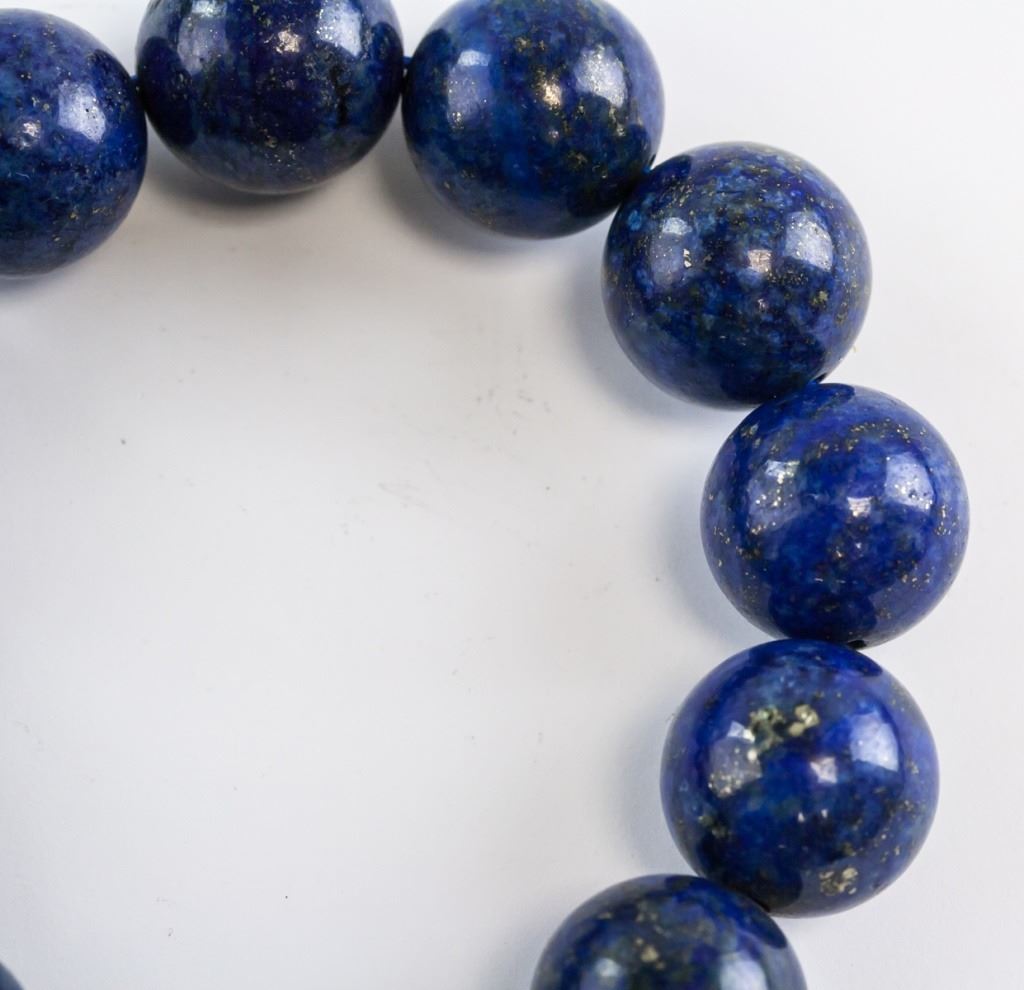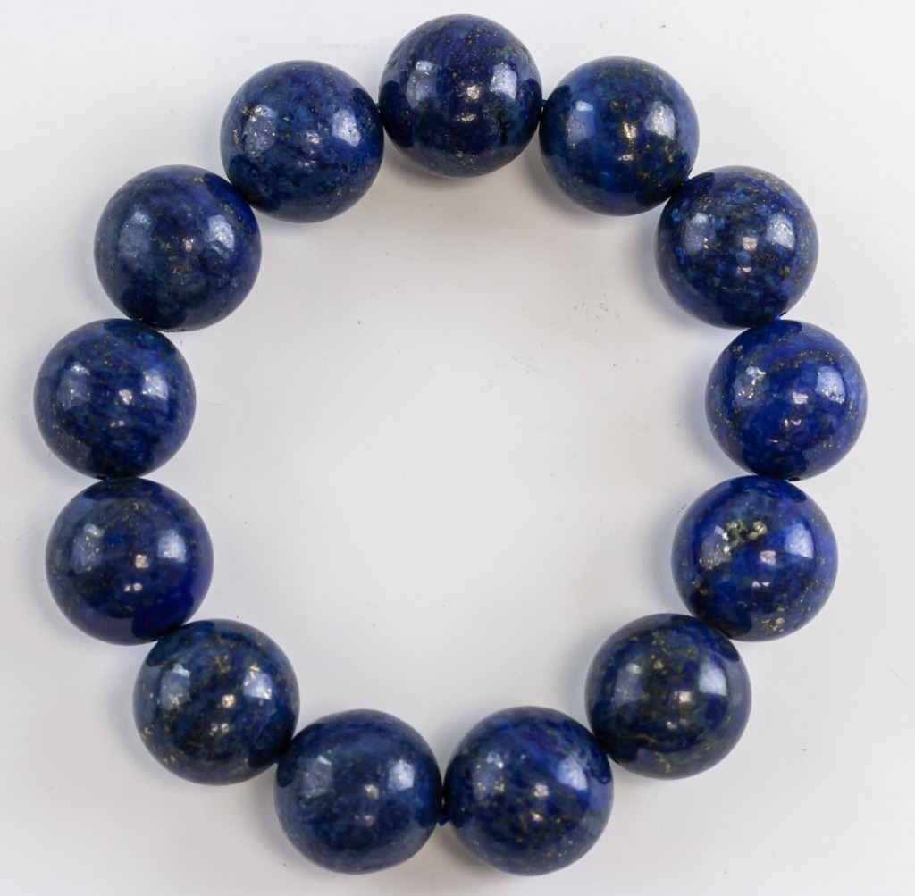 Chinese lapis bracelet. Of deep blue tone. Of round beads. Inner diameter: 7 cm. Outer diameter: 9.25 cm. 113 grams.