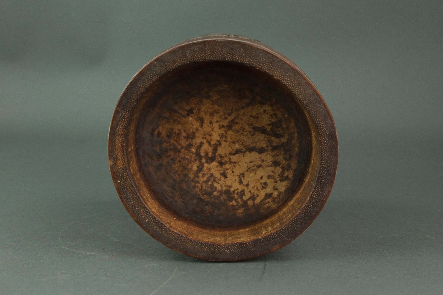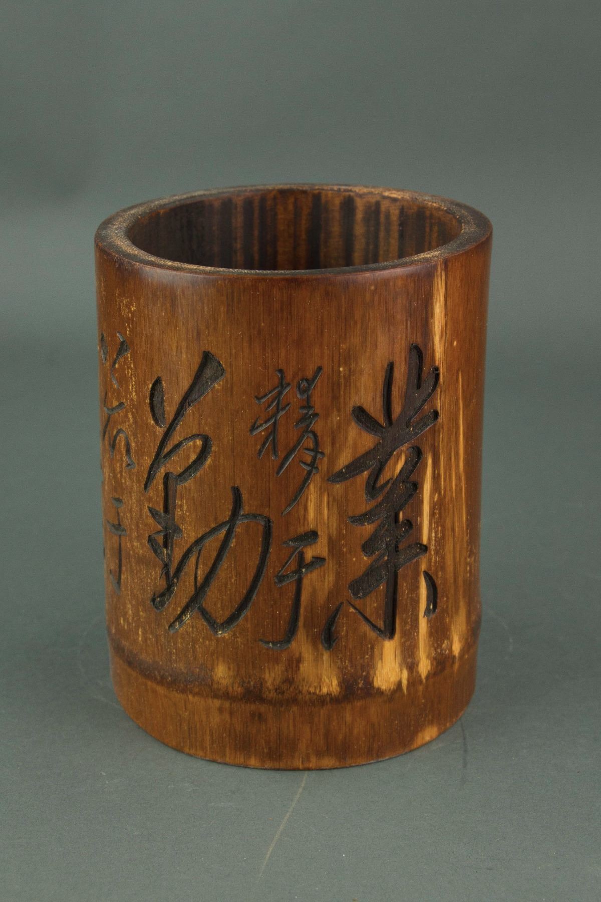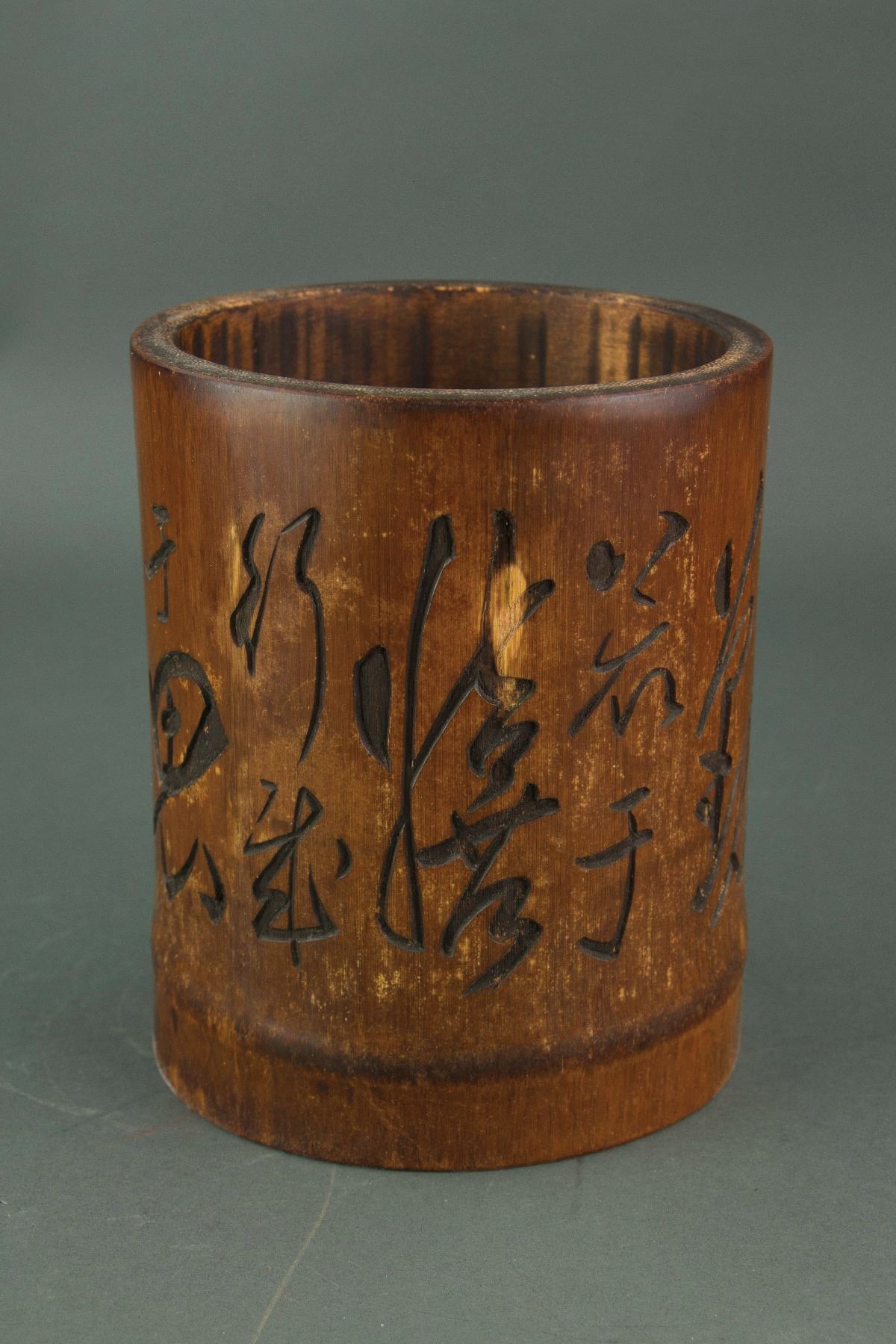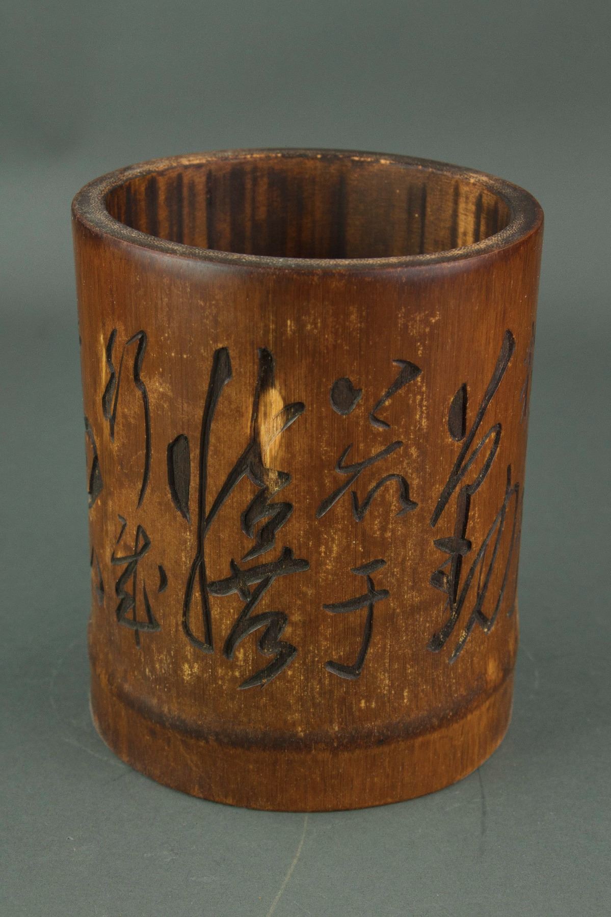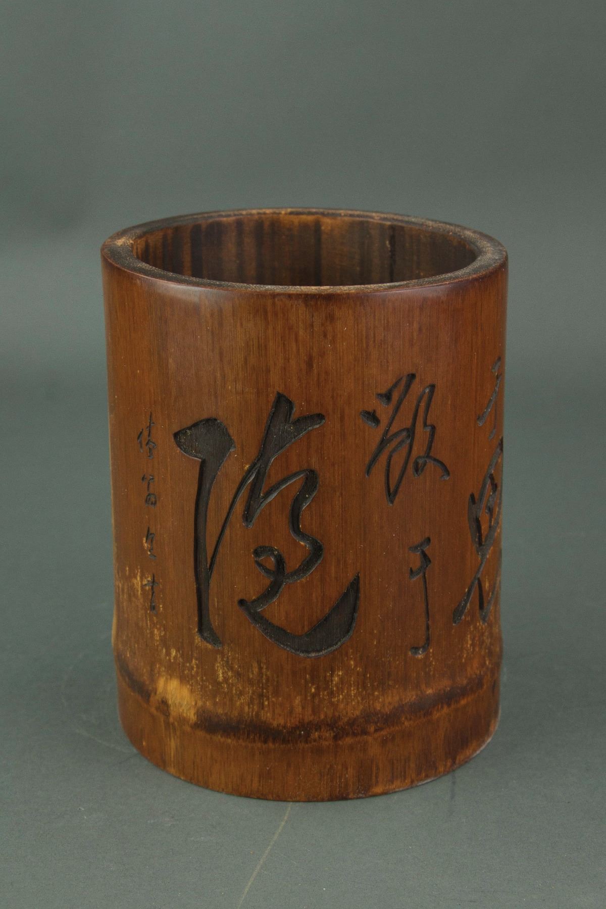 Chinese large bamboo brushpot; of cylindrical form; incised with cursive calligraphy script; H: 17 cm, W: 13.5 cm, 589 grams