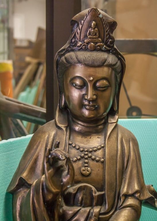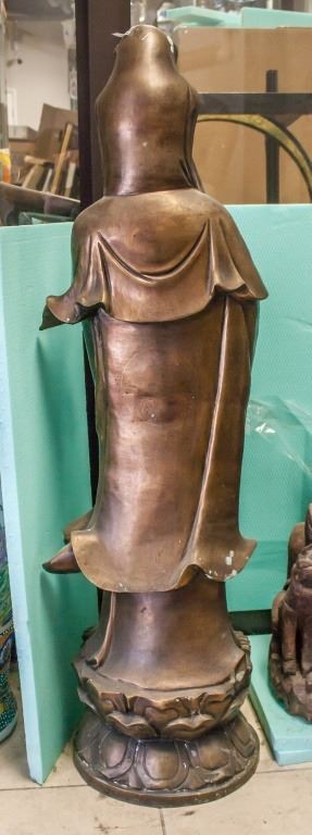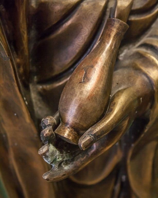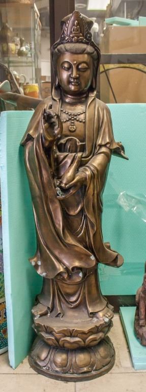 Chinese bronze Guanyin. Standing on lotus, with one hand raised and the other carrying a small vase.