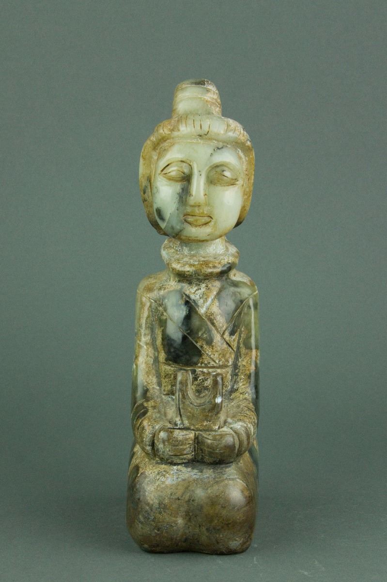 Chinese large celadon jade figure; Tang style; carved in form of a kneeing woman figure; the stone of pale celadon and spinach green tone with opal calcification on surface; H: 27 cm, W: 7 cm, L: 10.5 cm, 2826 grams