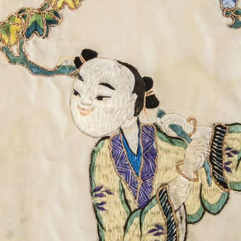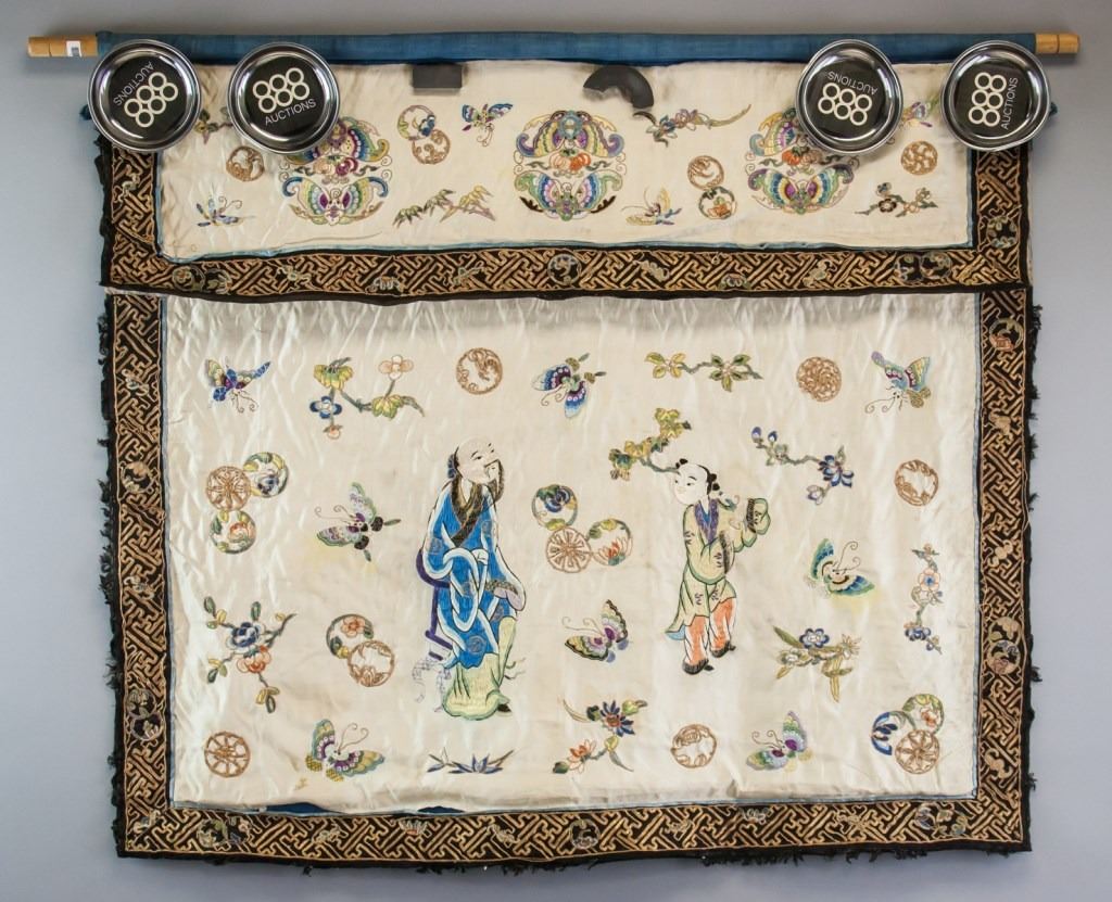 Chinese embroidery. Featuring imperial scene. With wood hanging stick. 18/19th century or later. 38 x 89 cm (30.5 x 35 inches).