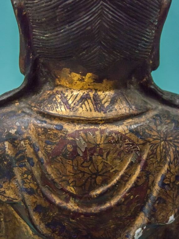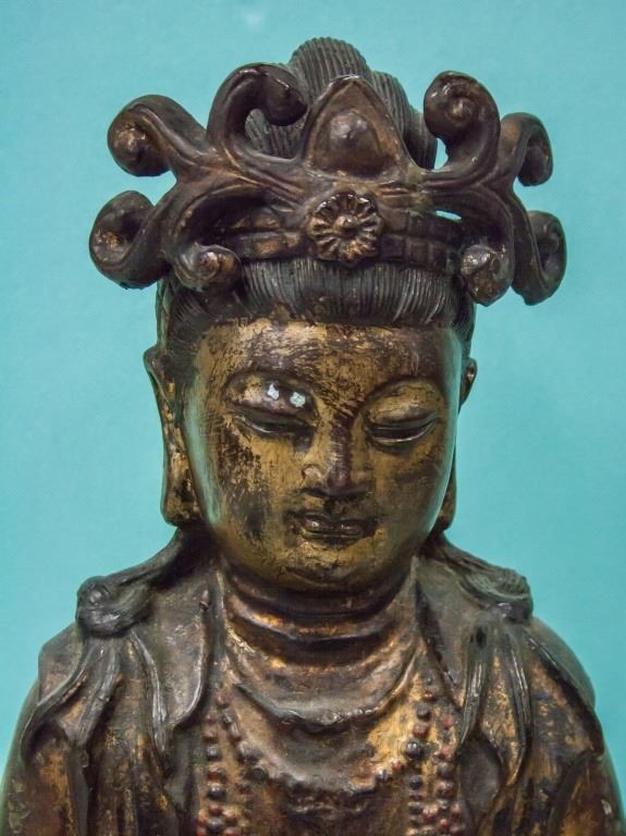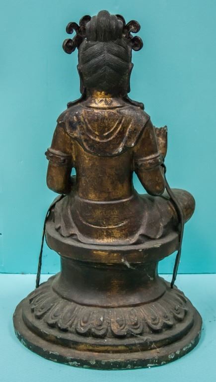 Chinese gilt Buddha statue. Of brown tone with flecks of remaining gold. Seated with one leg curled in and one resting on the ground. 17th century or later. 89 cm x 38 cm.