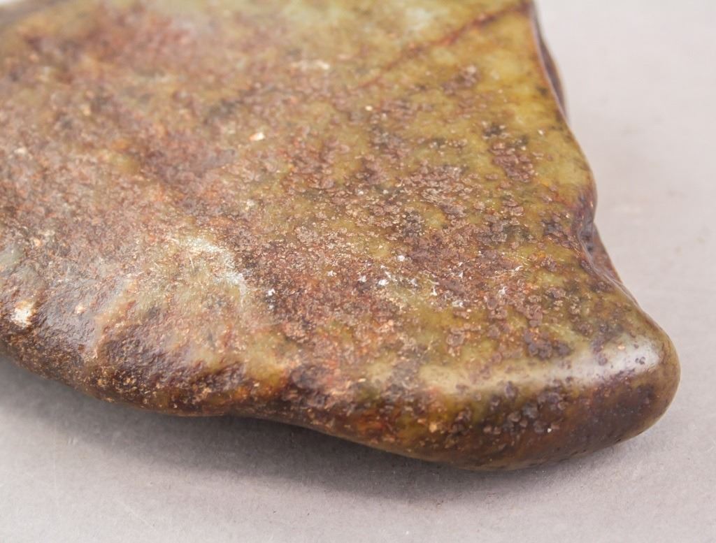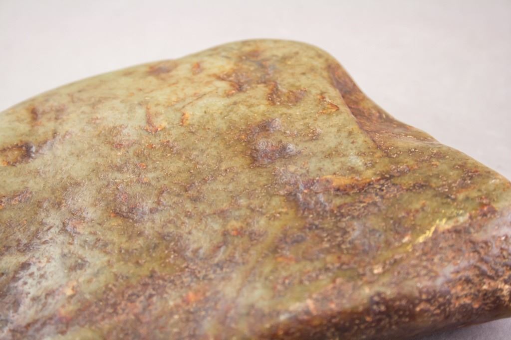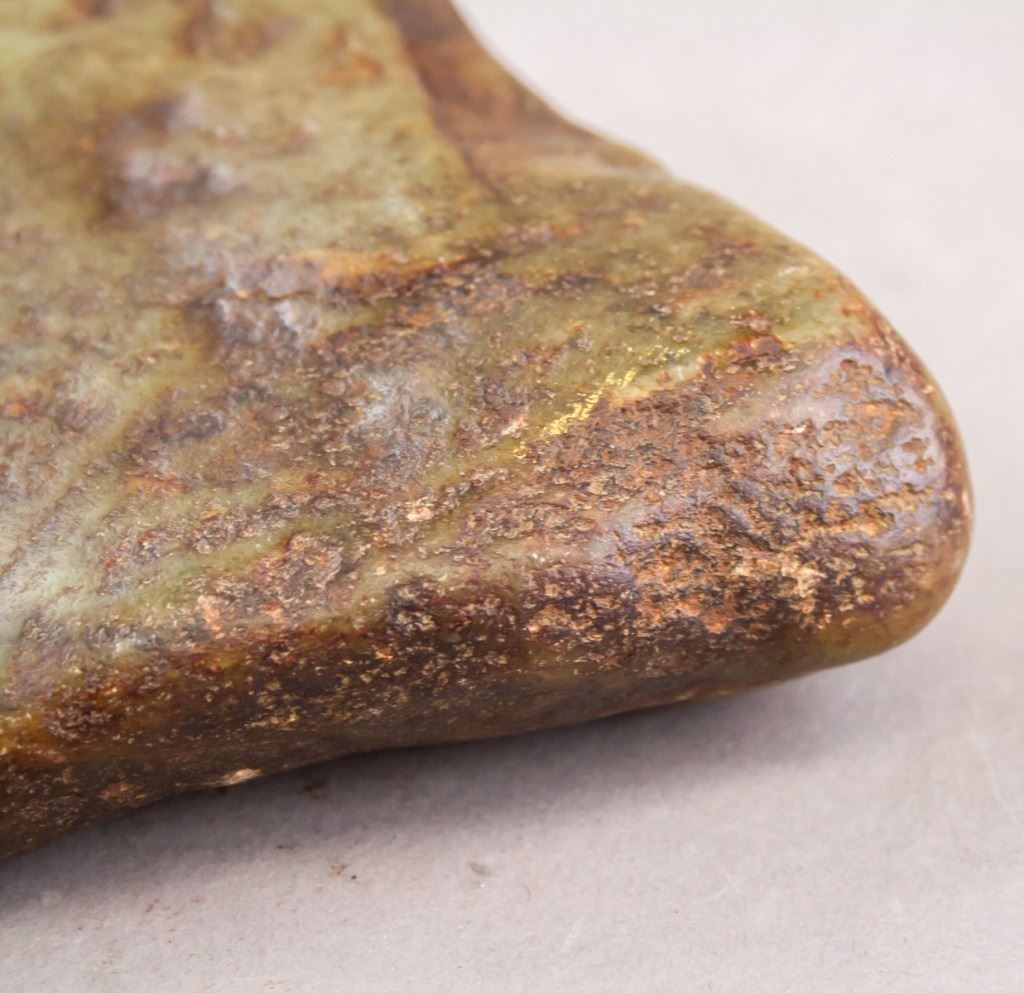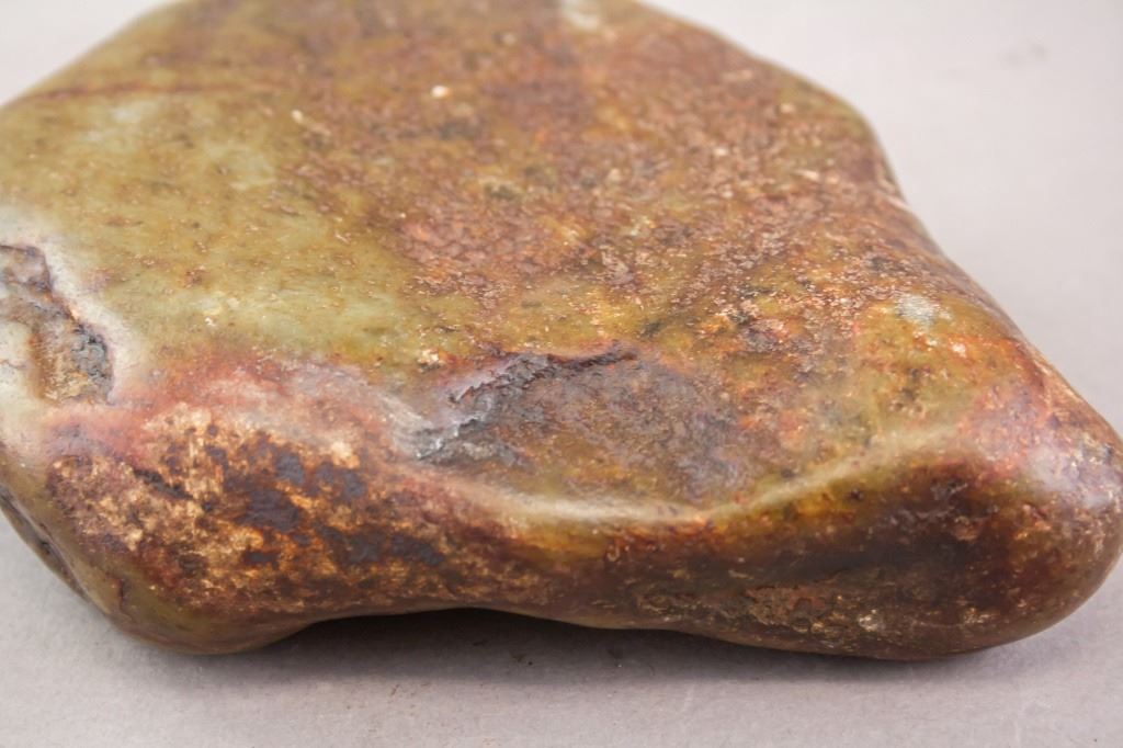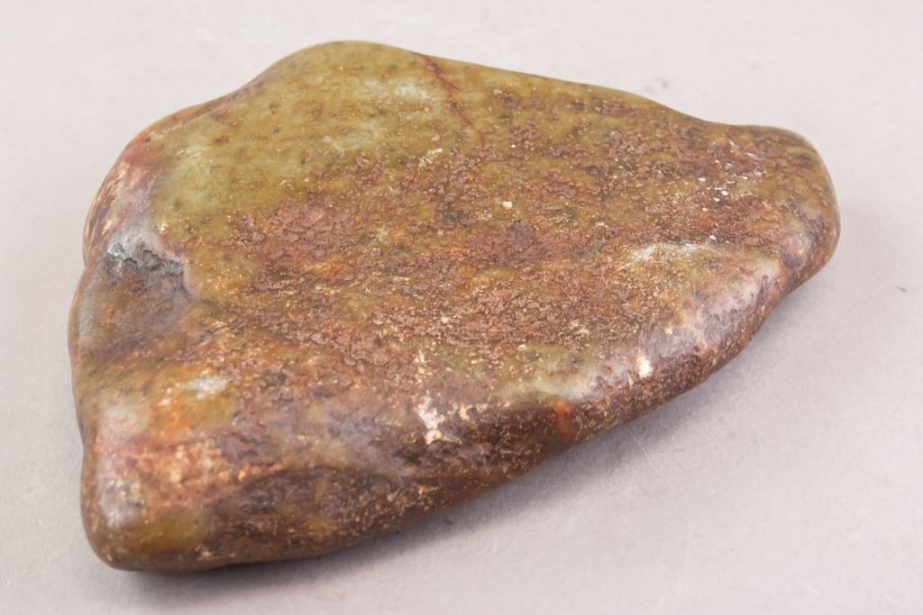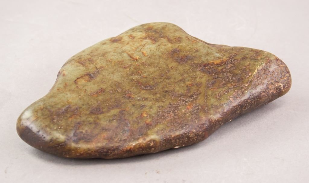 Chinese jade nephrite boulder. Of green and brown tone. Of natural shape. Polished. 13 x 20 cm. 1,534 grams.