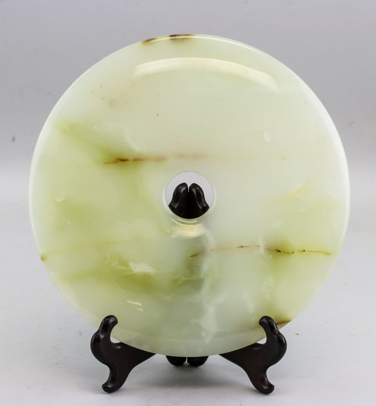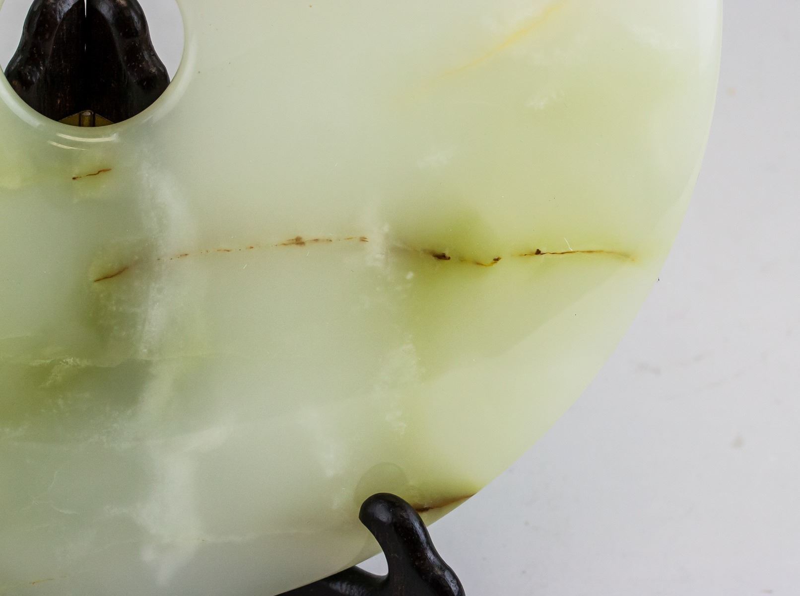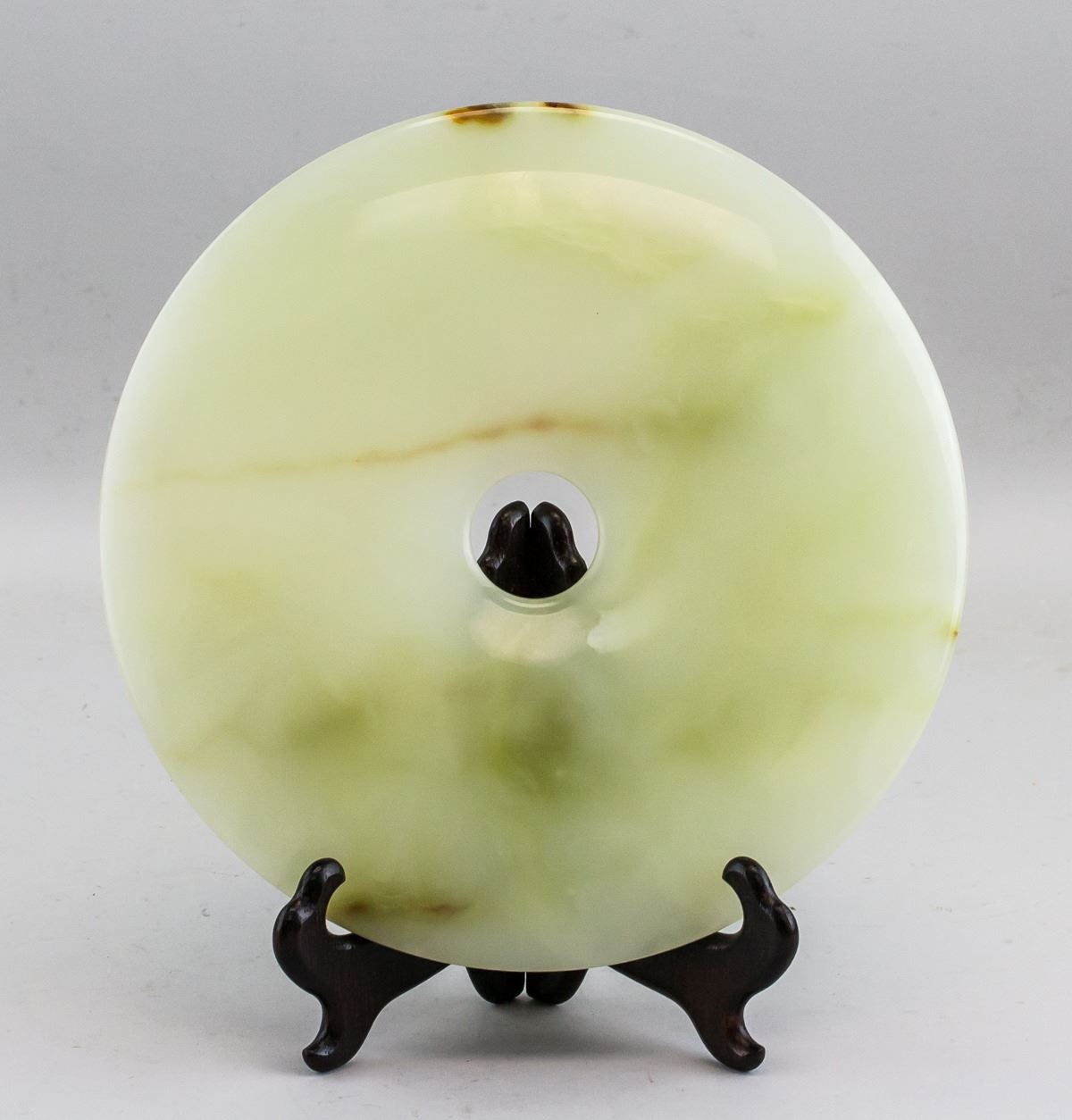 Chinese large white and green jade carved Bi disk. Of round shape with a hole in middle. Of pale green tone with russet tinge. 1 x 25.2 cm, 2004 grams