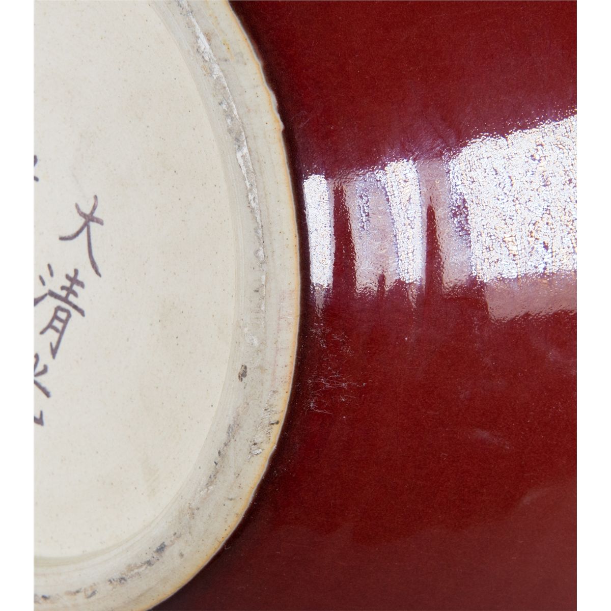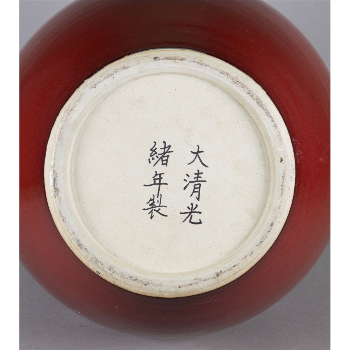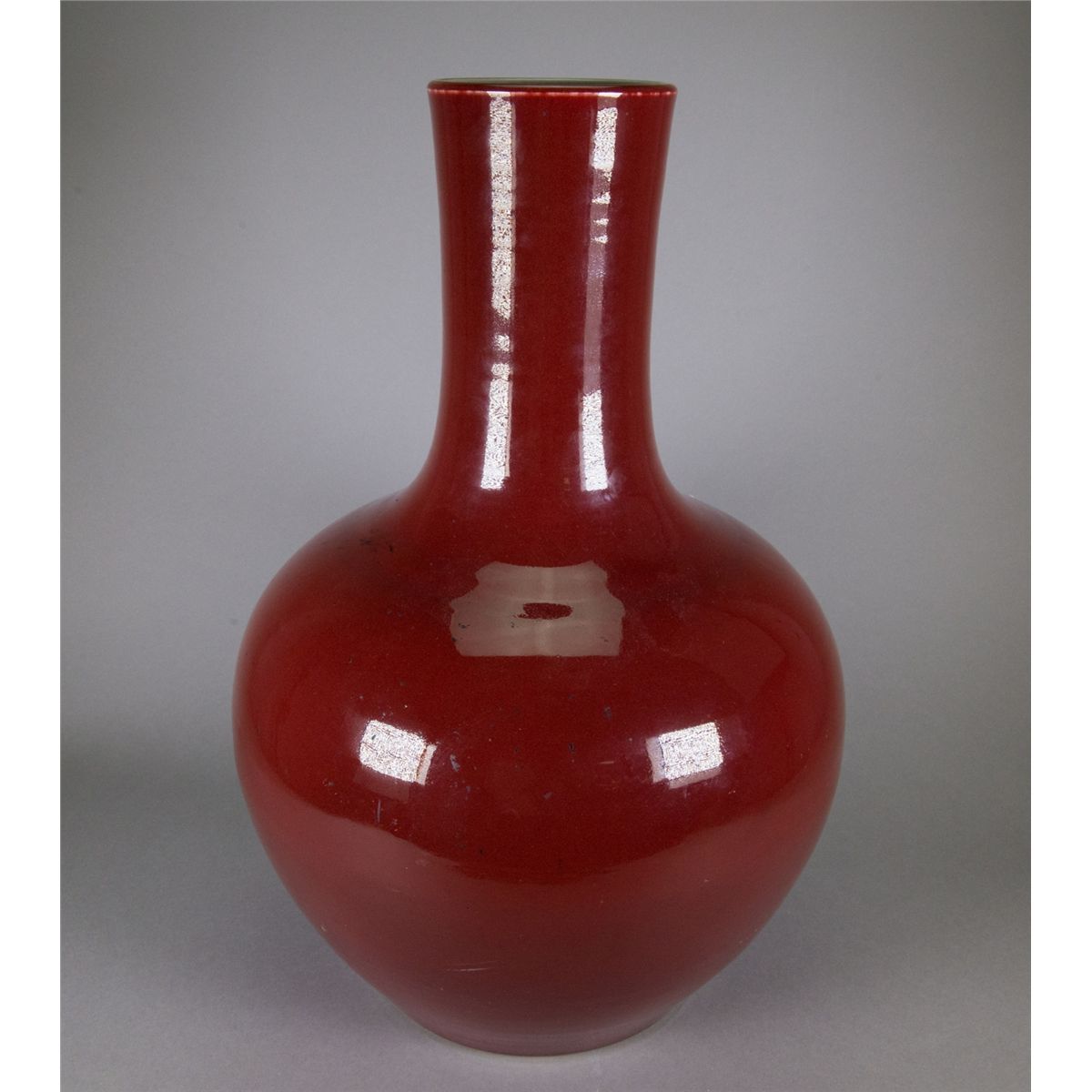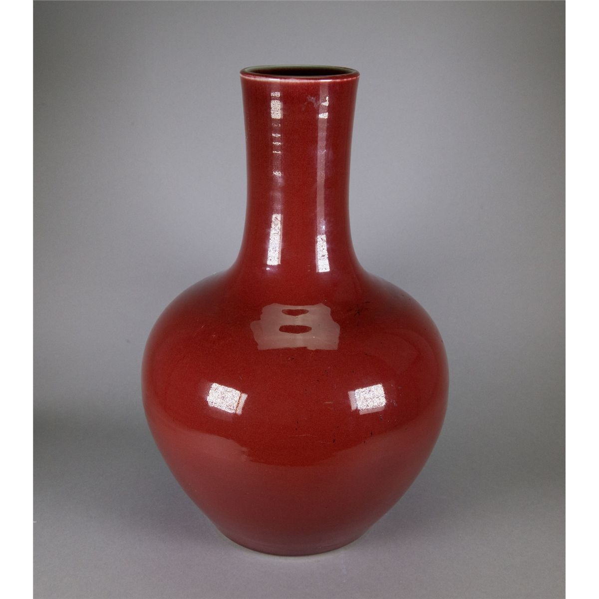 Chinese large copper red glazed porcelain vase; of globular body with long neck; six-character Qing Guangxu mark on base; H: 37 cm, D: 30 cm,