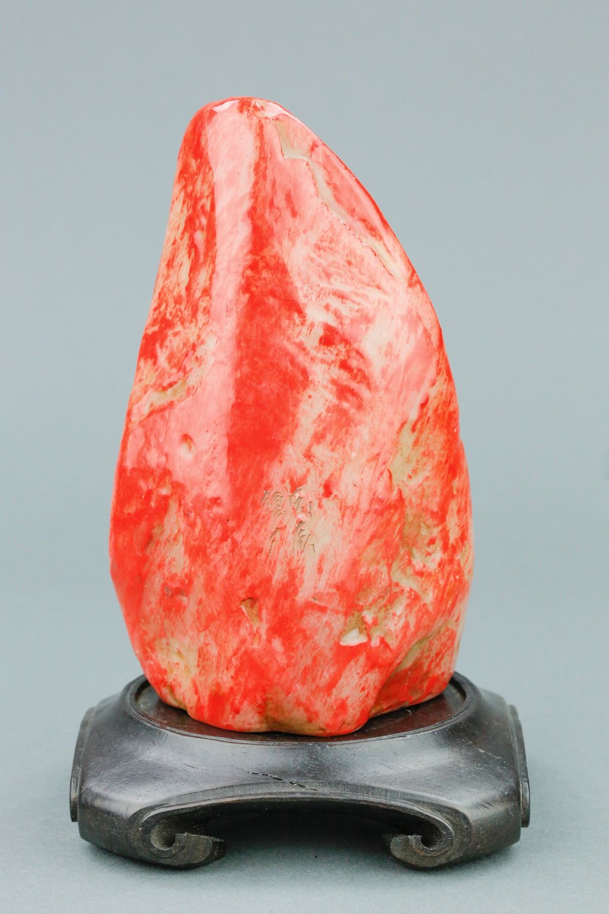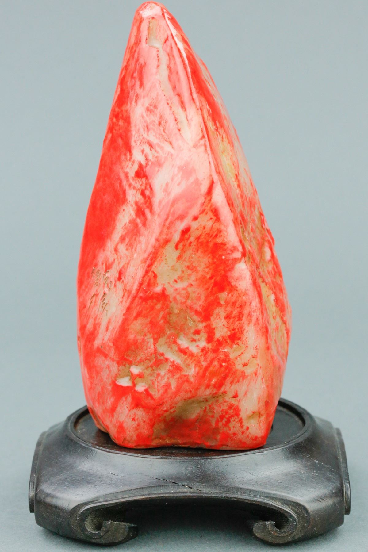 Chinese large red stone seal; of natural form; carved base; artist signature on one side; wood stand included; H: 16.5 cm, W: 8.5 cm, 1473 grams (stand included)
