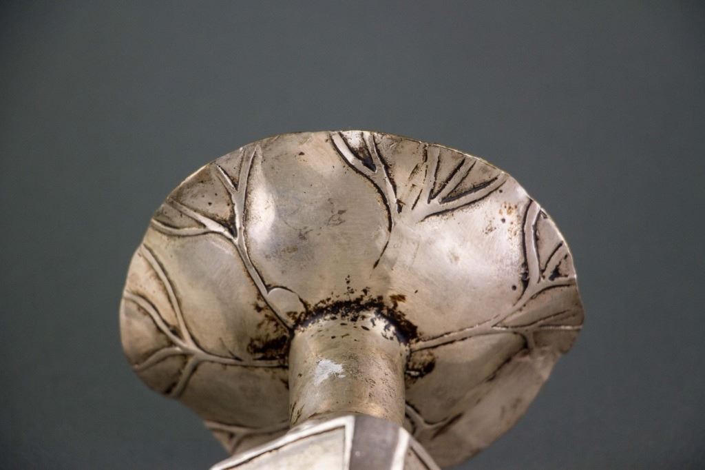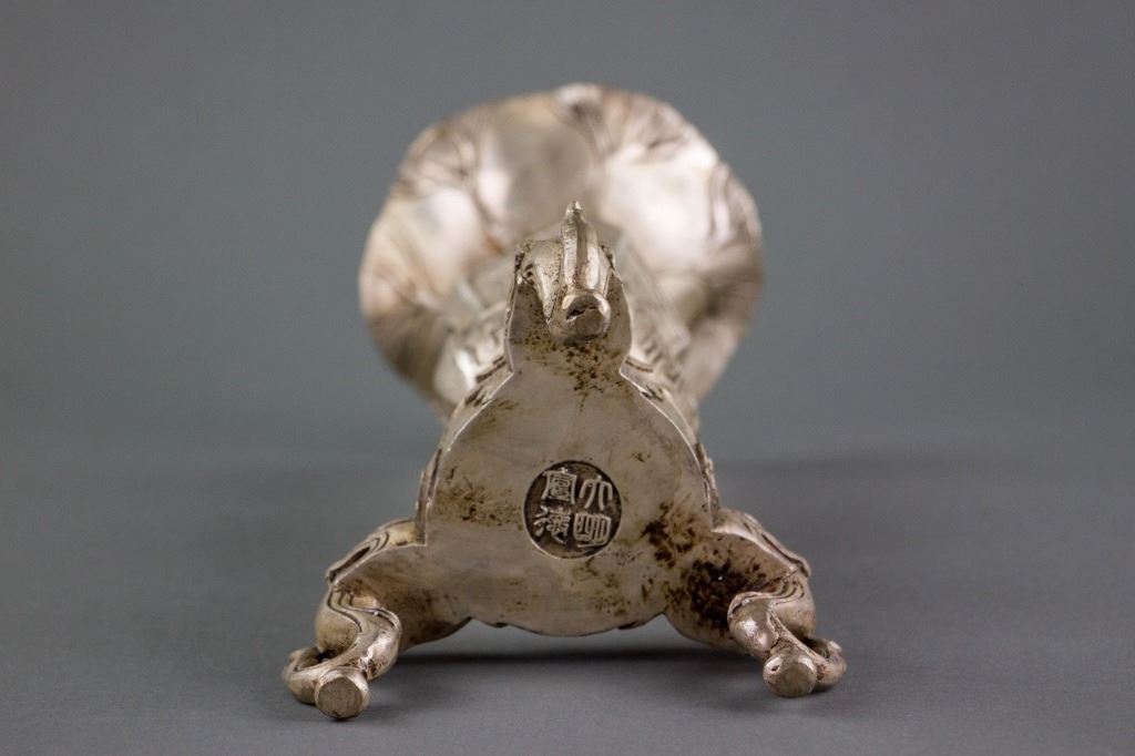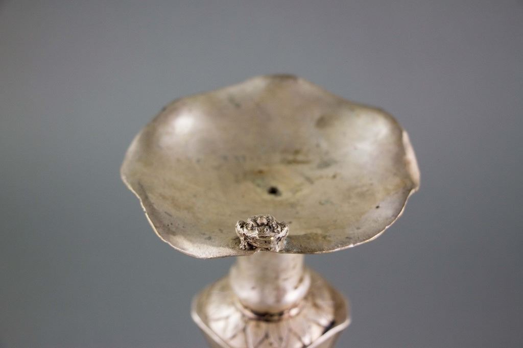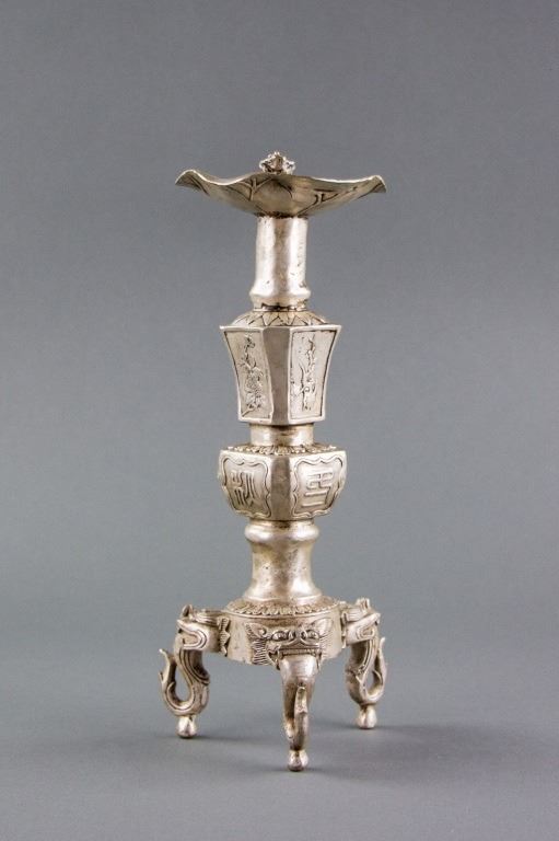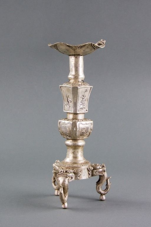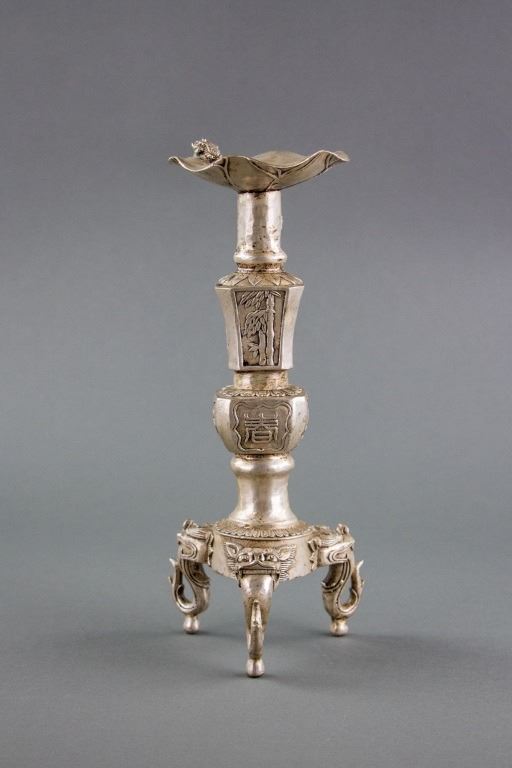 Chinese large silver candle stand; with a lotus leaf form platform; supported on three beast form legs; decorated with flower and Chinese calligraphy carving; four-character Xuande mark on base; 30 cm x 12 cm, 1206 grams