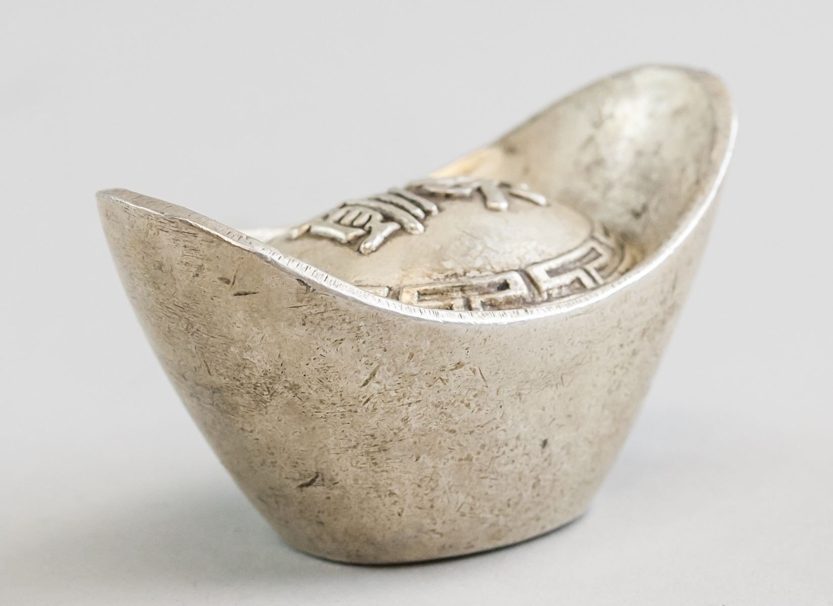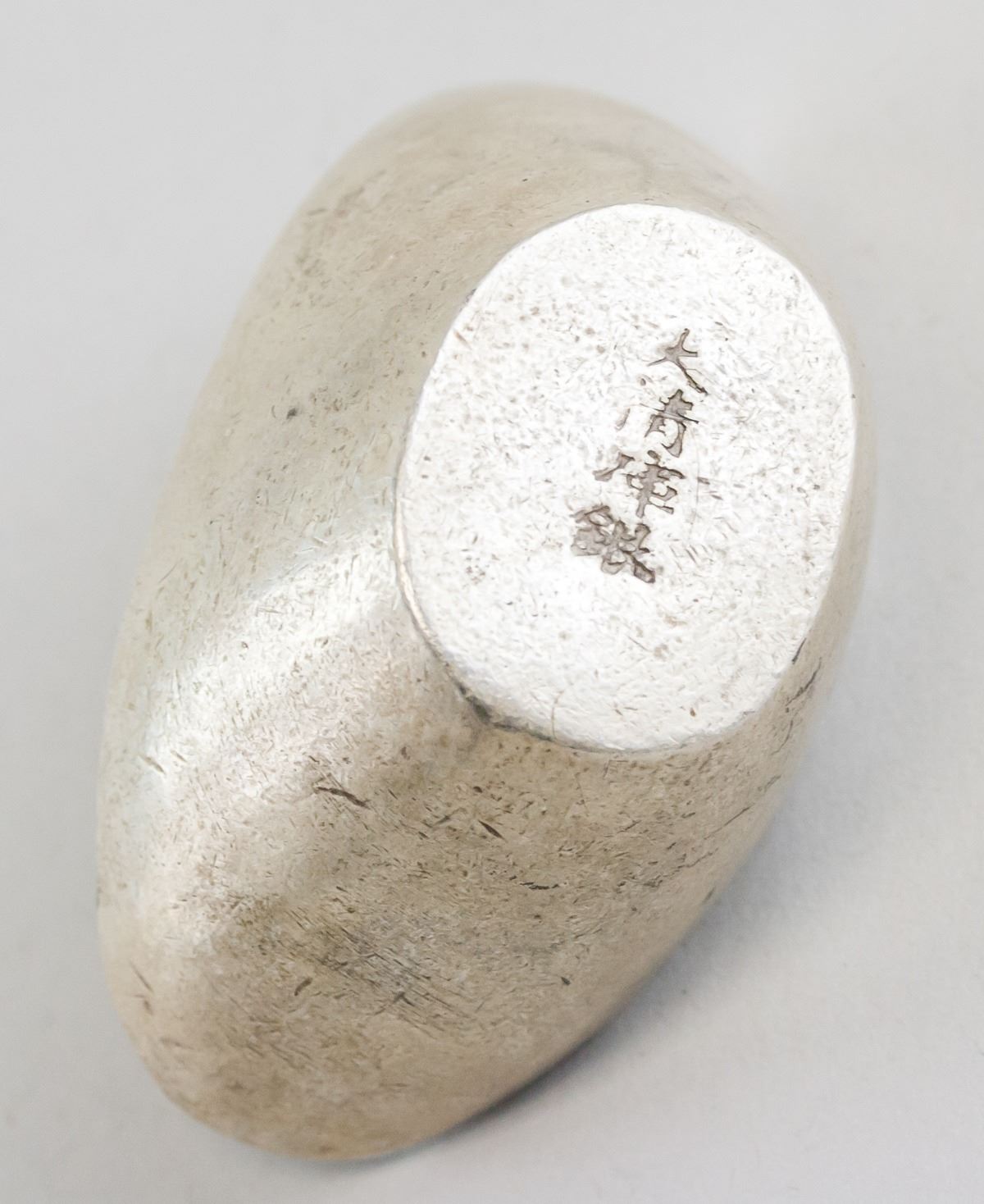 Chinese silvered ingot. Stamped with "Shun Zhi" on top. Stamped with "Da Qing Ku Yin" on base. 4 x 6 cm, 102 grams