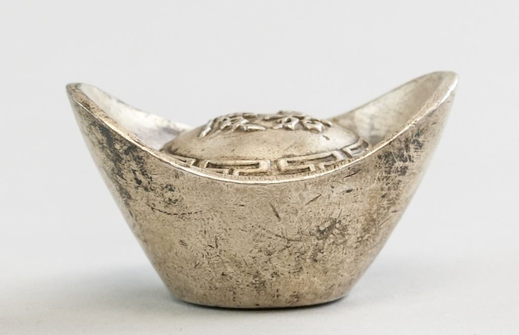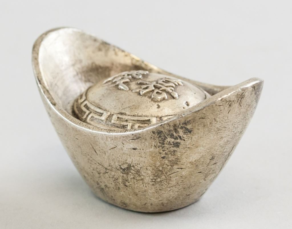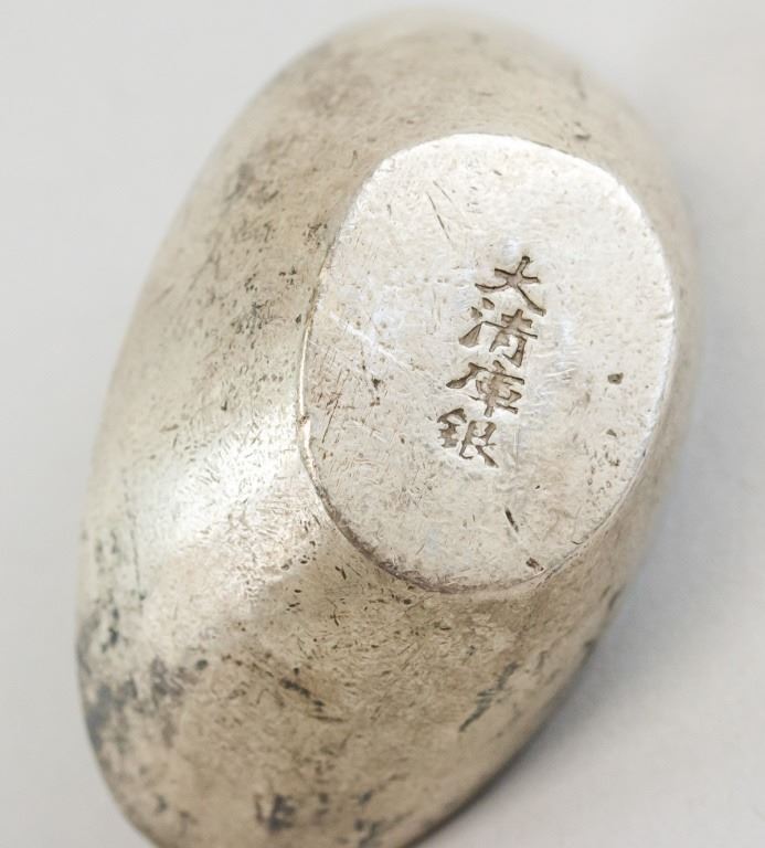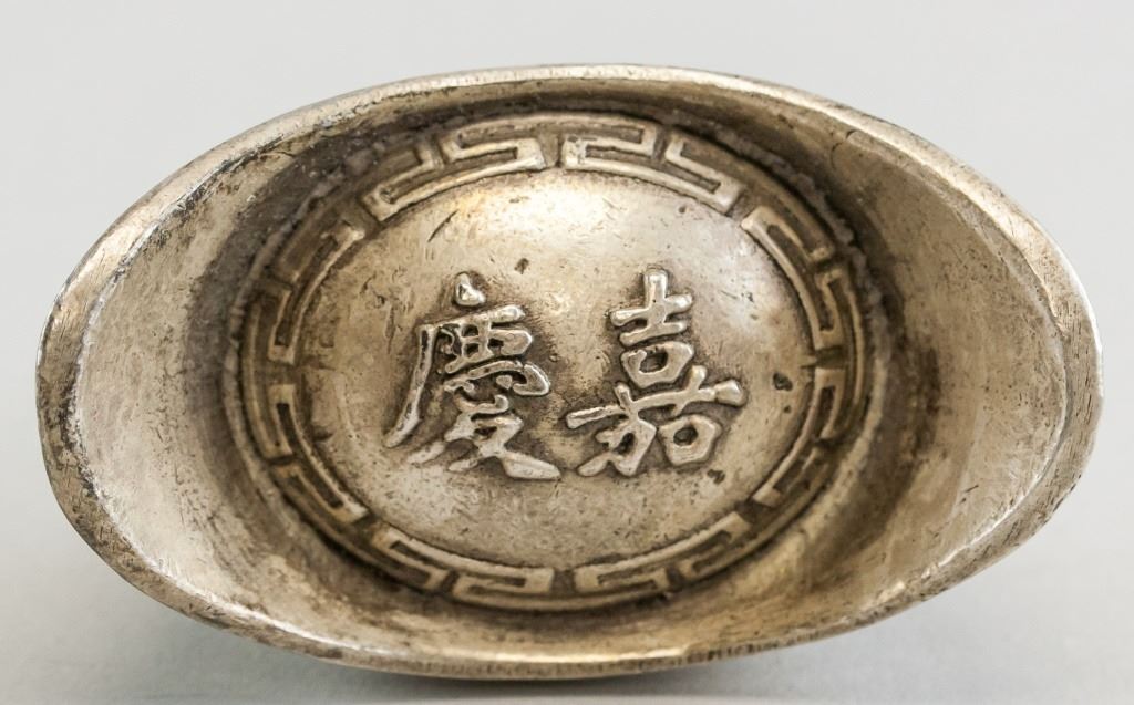 Chinese ingot. Of silver tone. Stamped with "Jia Qing" on top. "Da Qing Ku Yin" stamped on base. H: 4 cm, W: 7 cm, 268 grams.