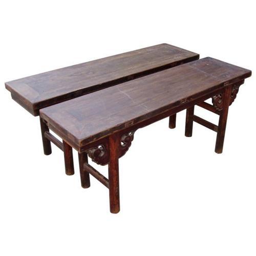 The furniture is a pair of elegant Qing dynasty's altar tables made of wood collected from Chinese countryside.A wonderful piece for a room that can hold it.At the beginning of the Qing Dynasty, furniture followed Ming patterns and styles.Qing Furniture showed its own uniqueness with the absorption of western art. It was larger in size with grandeur and pageantry.Engraving was a popular and important means of furniture decoration. The subjects range from auspicious character patterns, to geometric patterns and scenes in nature with animals, mountains and waters, flowers and grass. Color painting, especially gold painting, was widely used.Commercial symbols emerged, such as patterns concerning money and fortune.To later Qing furniture has less engraving ,instead ,inlays of stone, which catch the eye more easily than exquisite engraving, are used to tell of the luxurious lifestyle of the owner. In addition, color and gold painting become the vogue depicting the preference for gaudiness by the wealthy.
