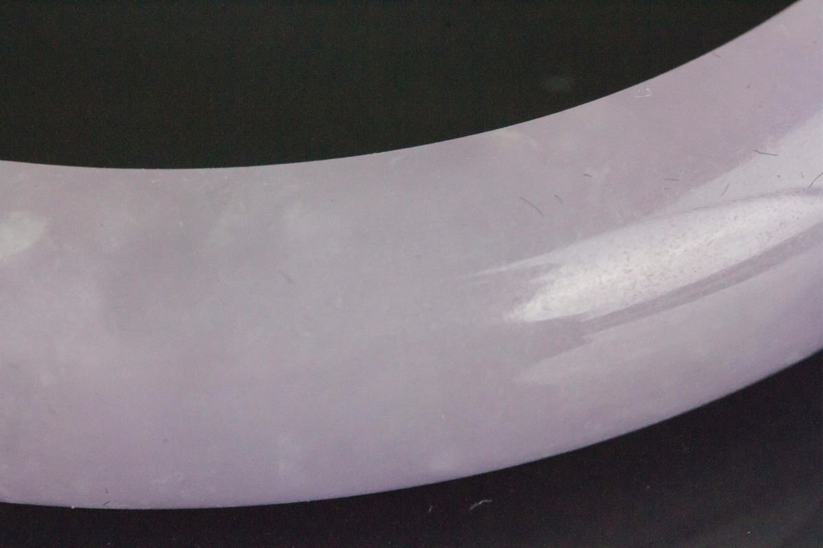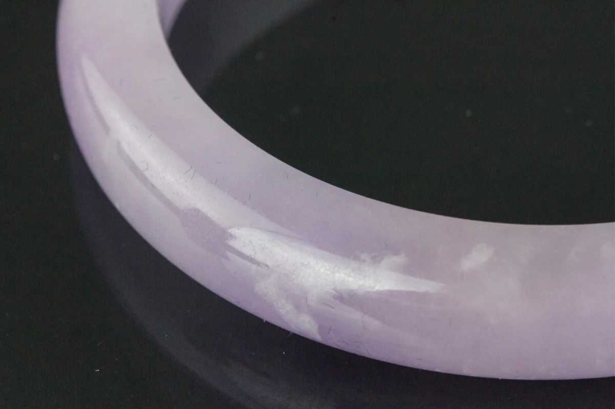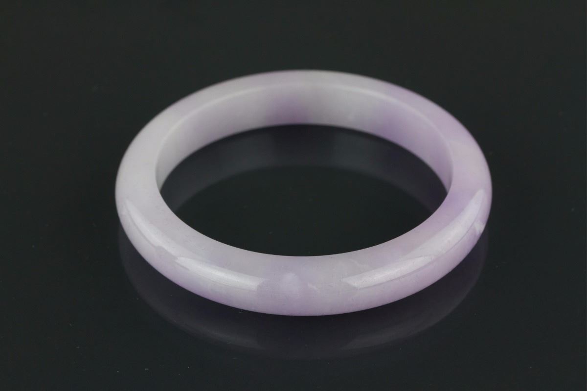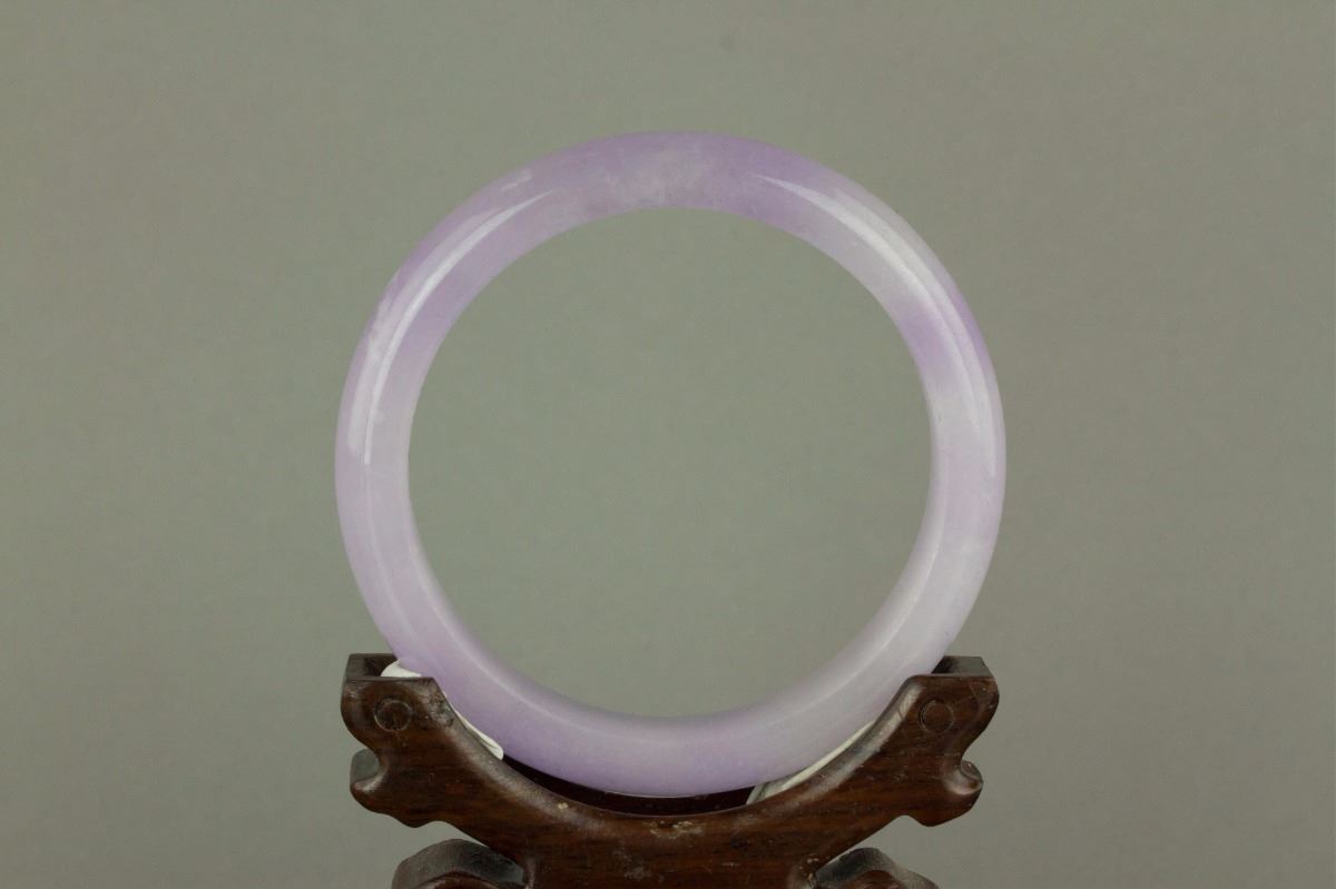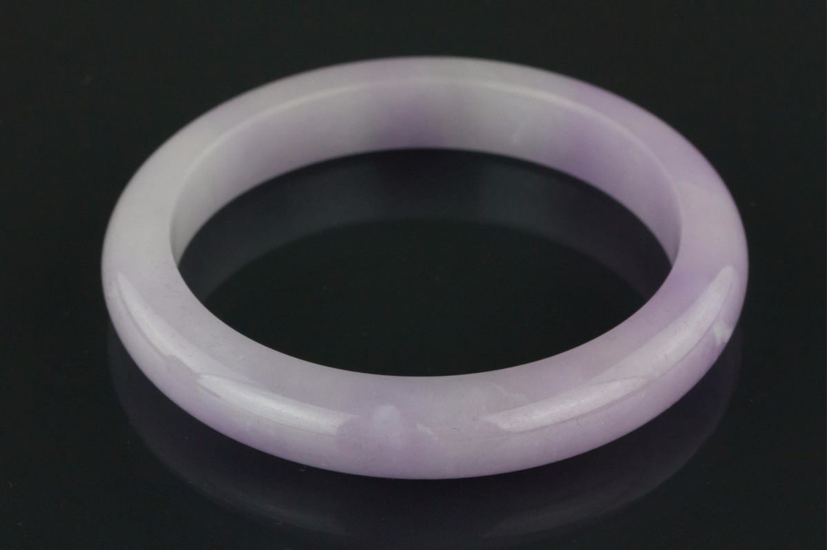 Chinese lavender jadeite bangle; rounded outside and flatten inside; D: 6.3 cm, 8 cm, 64 grams; Density: 3.22