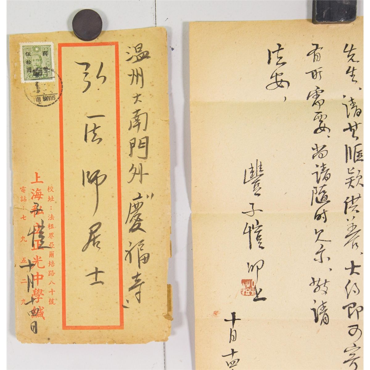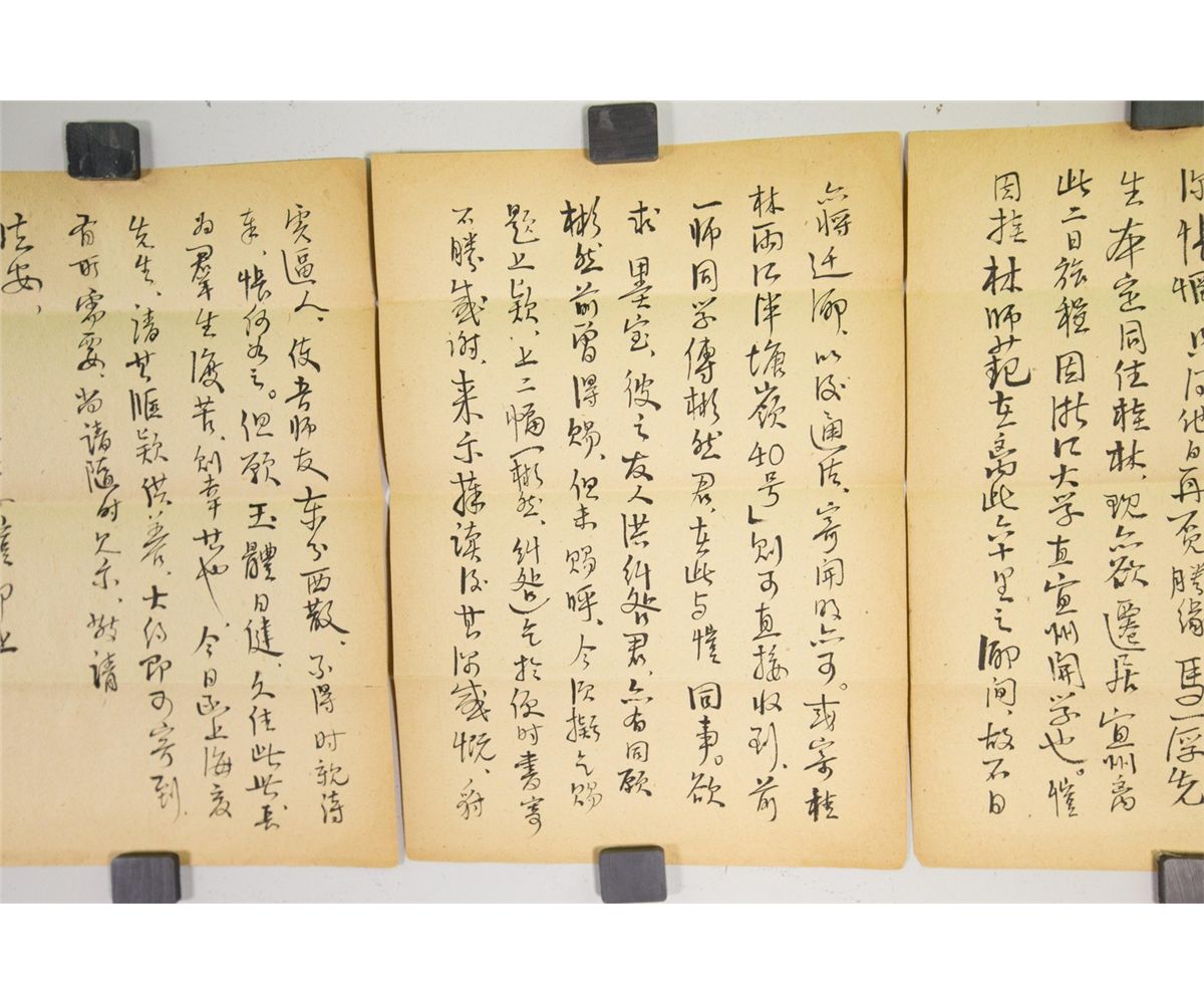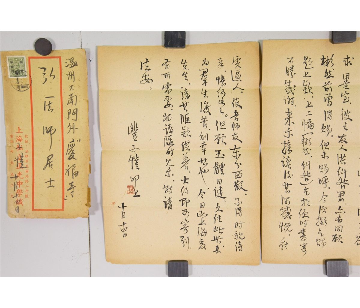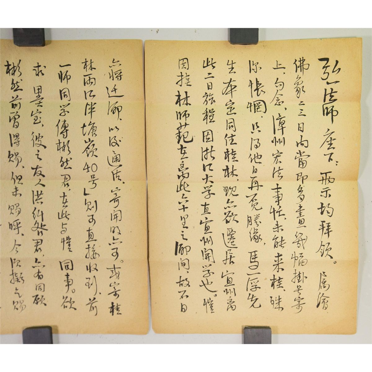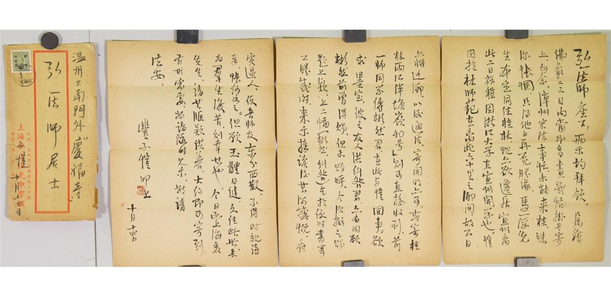 Three pages of letter to Hongyi from Feng Zikai (1898-1975); Chinese ink on paper; 20 cm x 10 cm