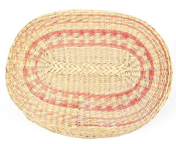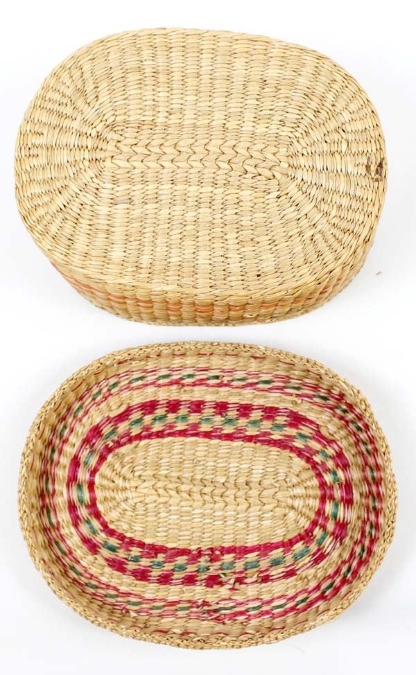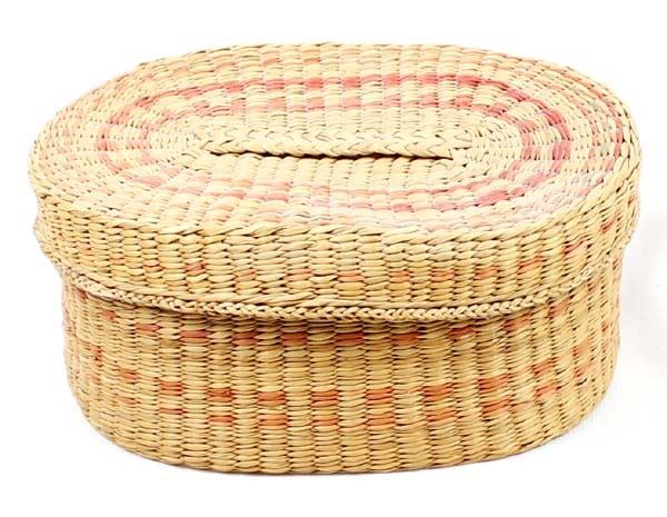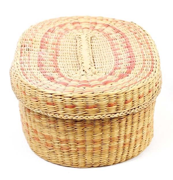Chinese Lidded Basket, measures 3.5''H x 7.5'' x 5.5''W, red and tan