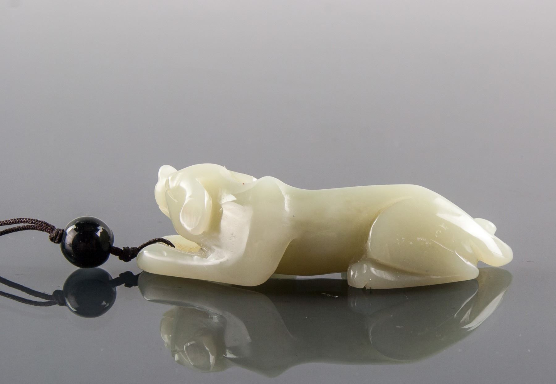 Chinese green jade carved toggle; carved in a crouching dog form; of light green tone; pieced for suspension; 2.4 cm x 8.3 cm, 68 grams, Density: 2.91