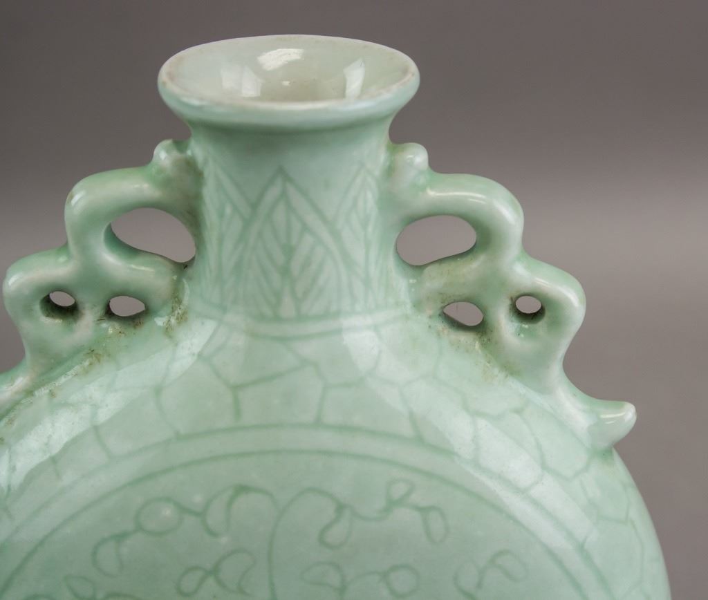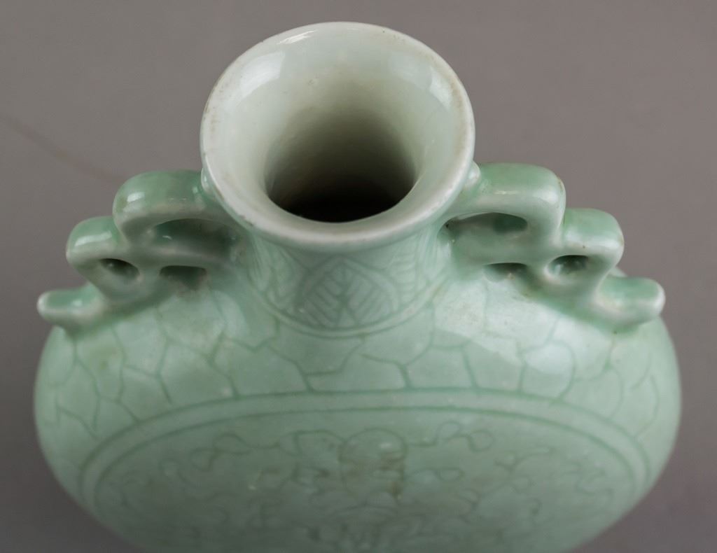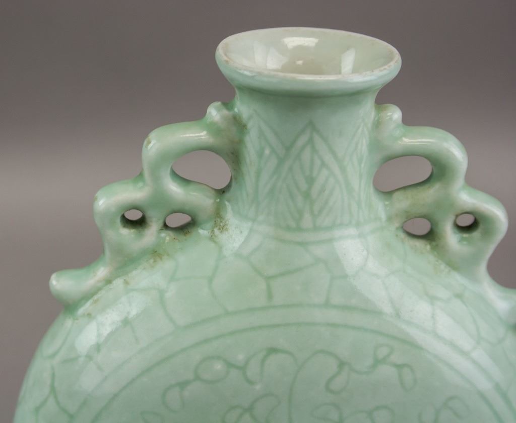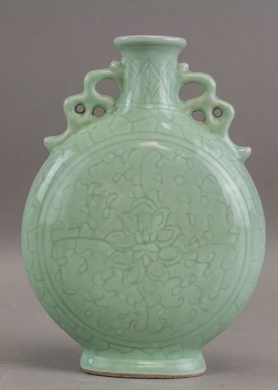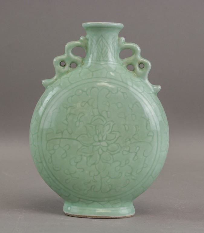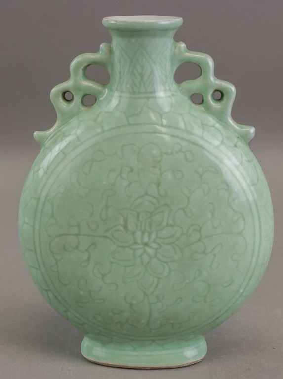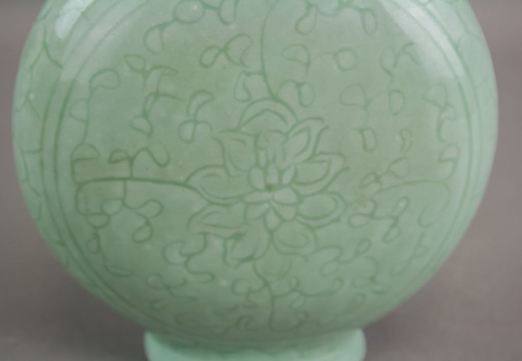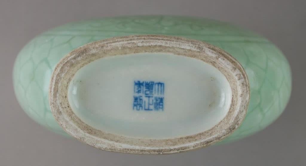 Chinese porcelain flask vase. Of light green tone. With small round opening and short neck. With flat round body, resting on short foot rim. With small decorative handles on the shoulders. Six character Qing dynasty Yongzheng mark on base. 18 x 9 cm. 279 grams.