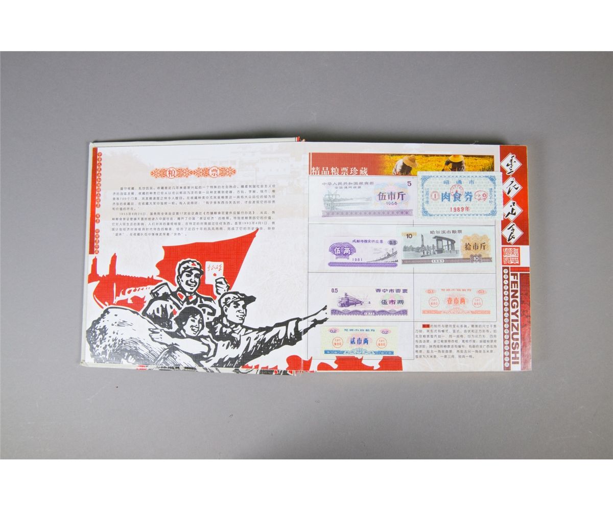 Chinese limited edition book of food stamps; featuring a variety of stamps which could be redeemed for food, cloth and other necessities of life in China from 1950s to 1990s; 22 cm x 22 cm