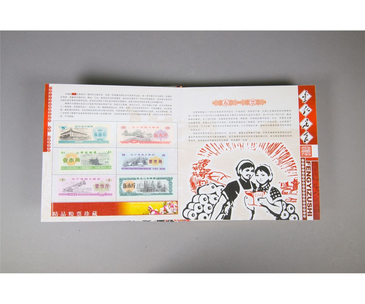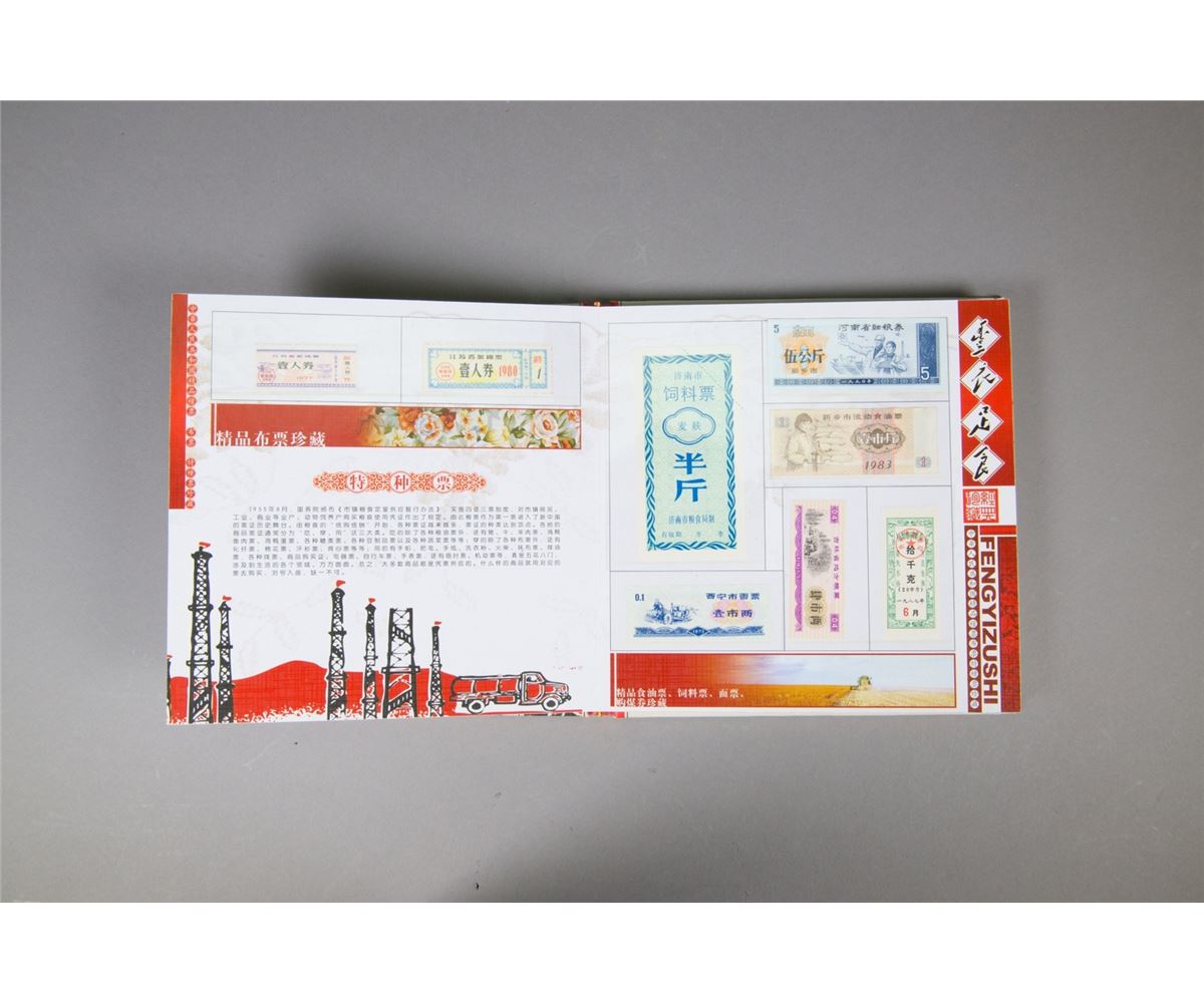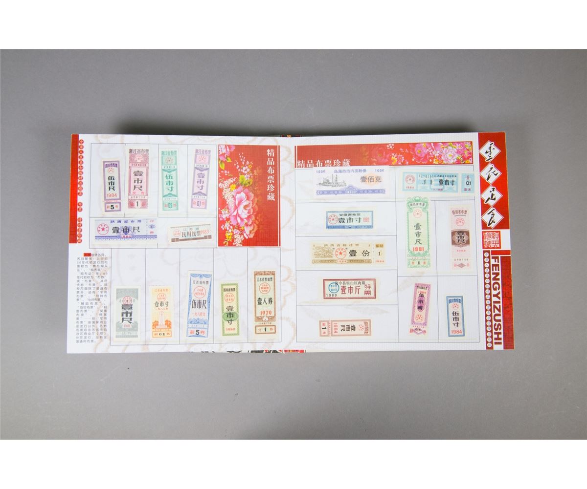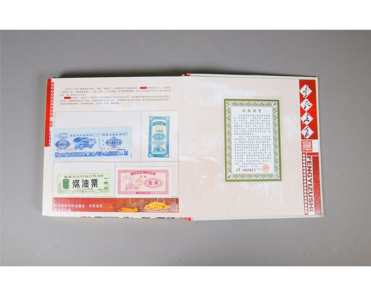 Chinese limited edition book of food stamps; featuring a variety of stamps which could be redeemed for food, cloth and other necessities of life in China from 1950s to 1990s; 22 cm x 22 cm