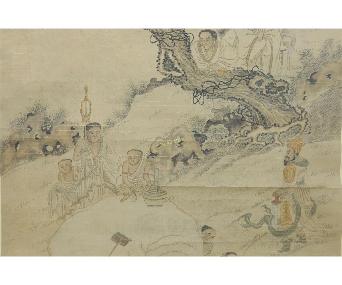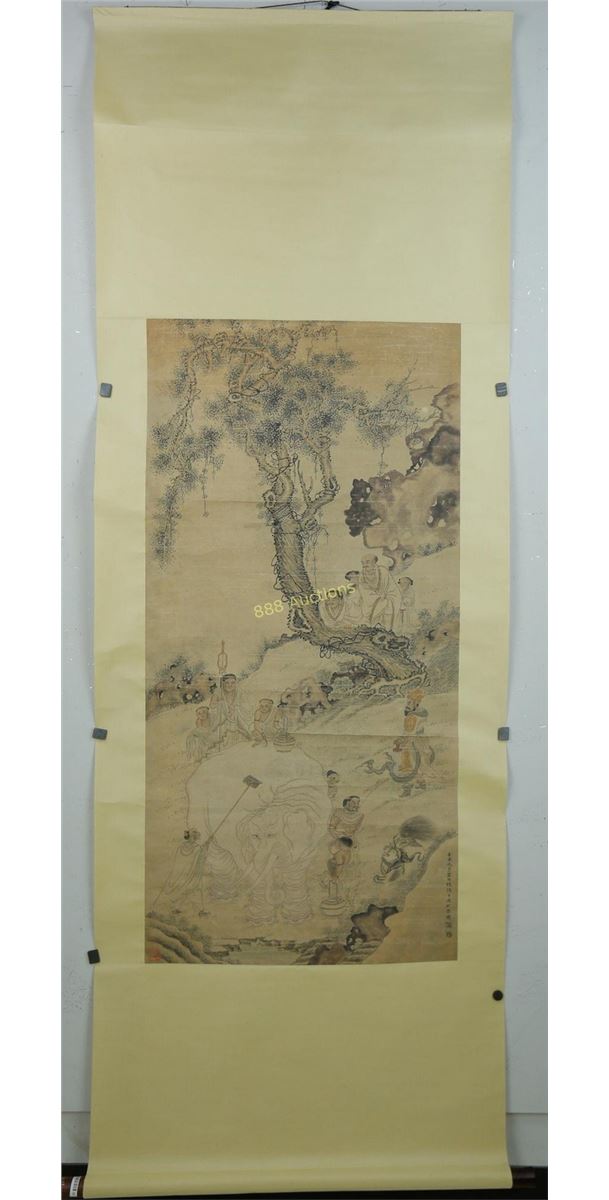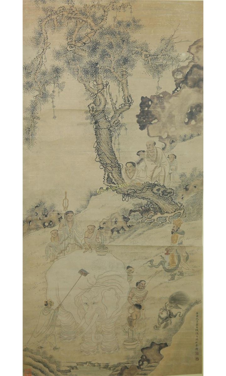 Chinese Lohan and elephant, hanging scroll, Chinese ink and watercolour on paper, signed and sealed Wu Bin. 125 cm x 60 cm.