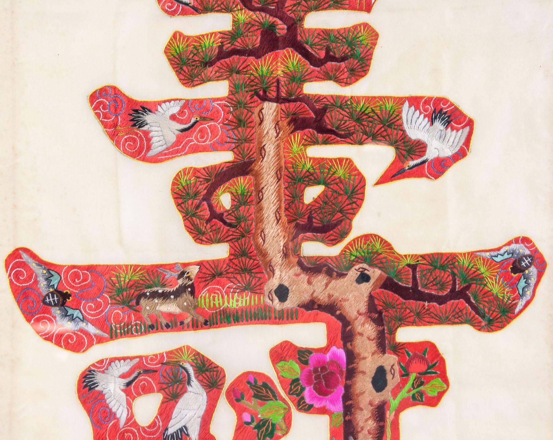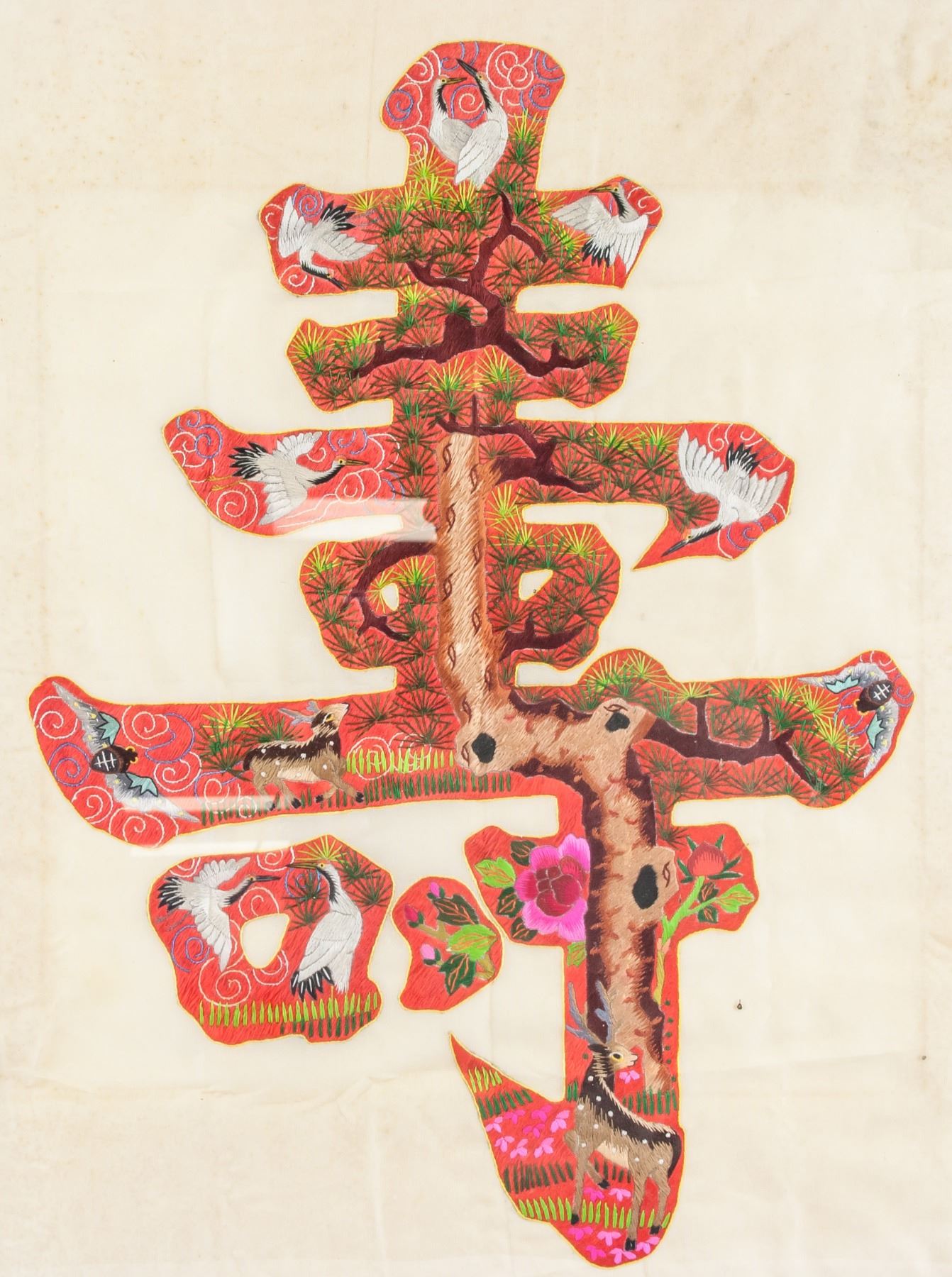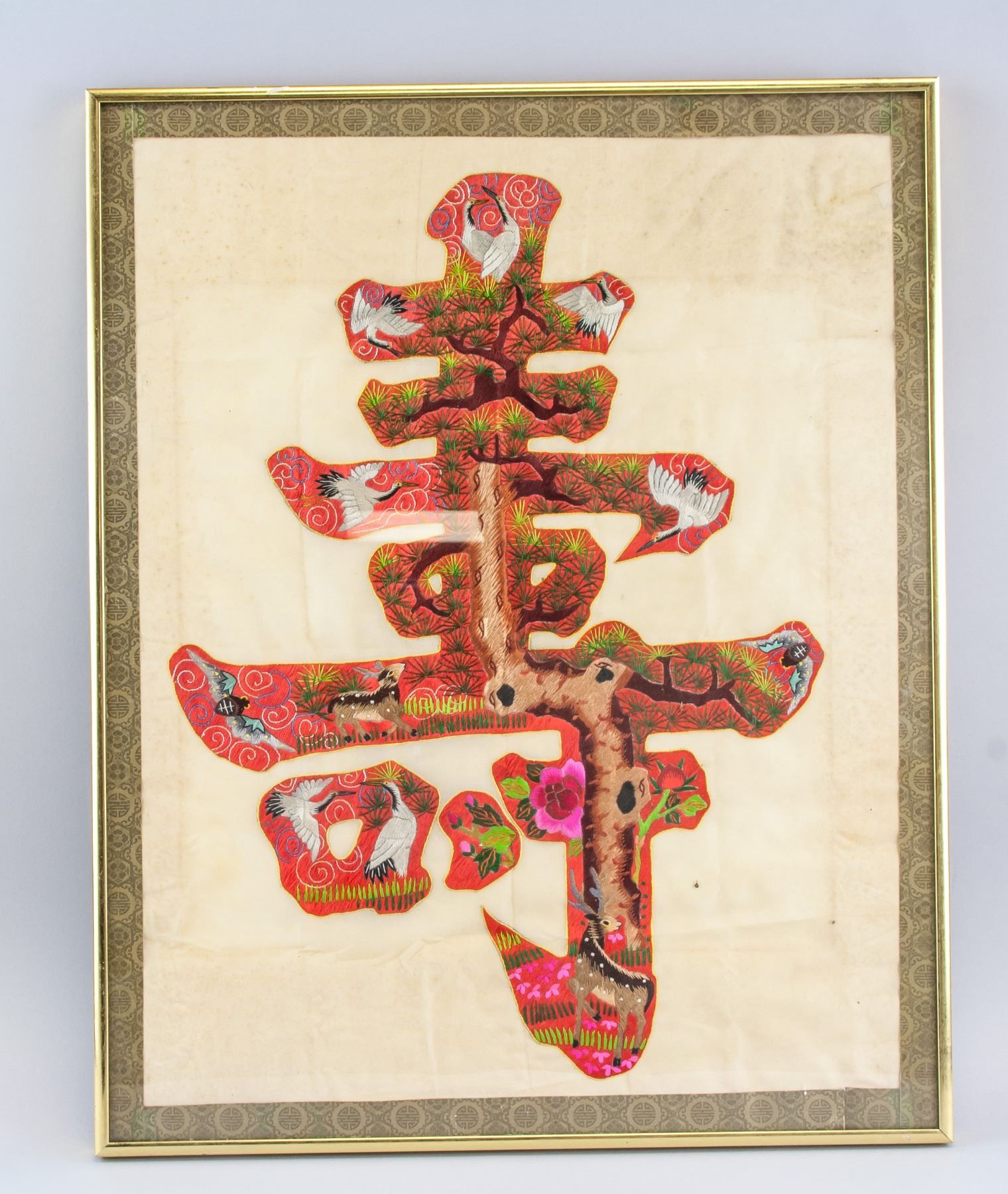 Chinese embroidery panel; of Shou (longevity) character filled with cranes, bat, deer and pine tree; framed; 46 cm x 36.5 cm