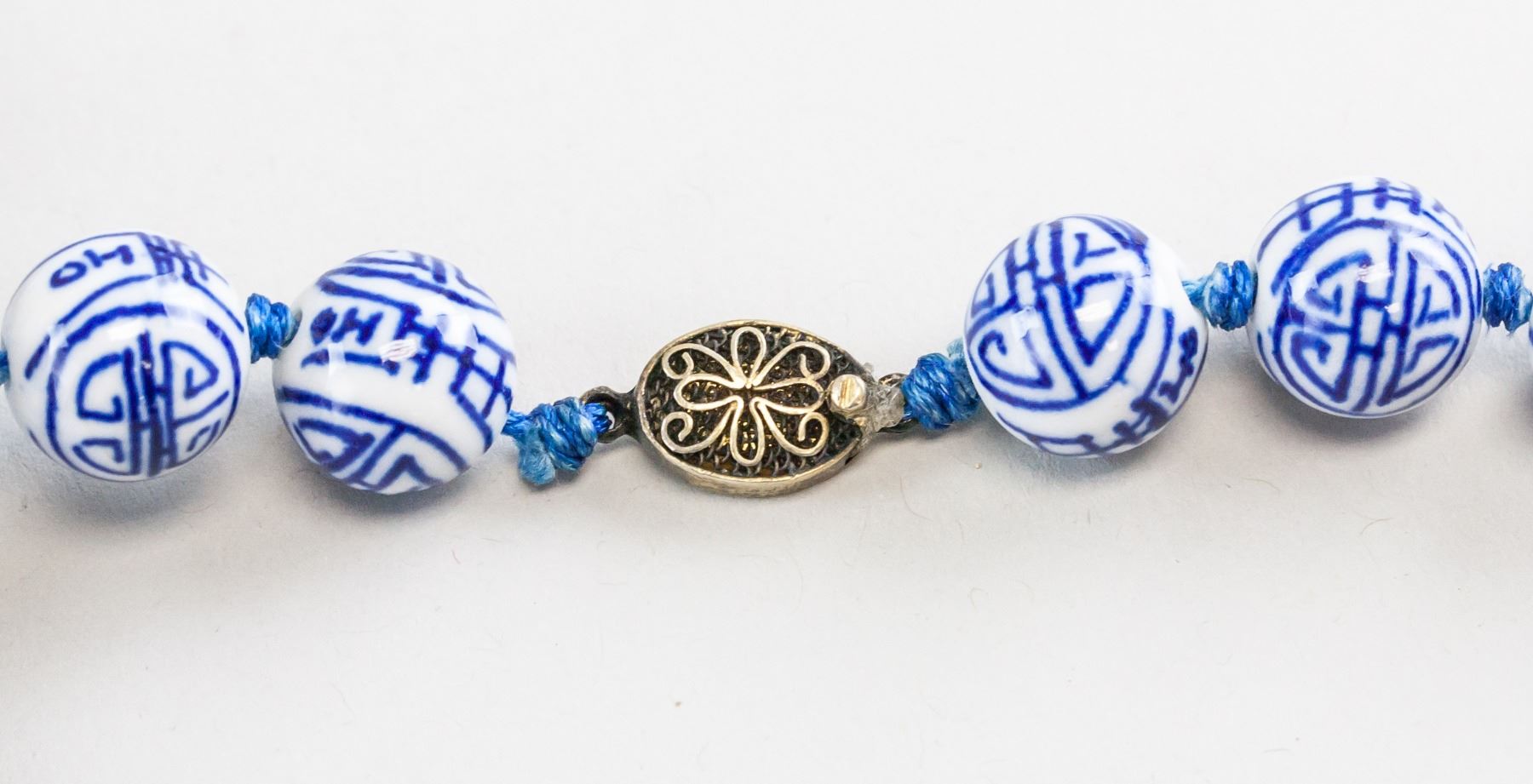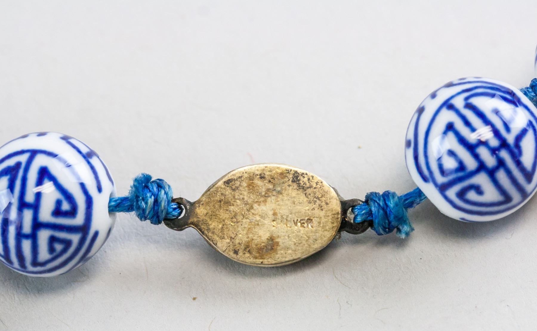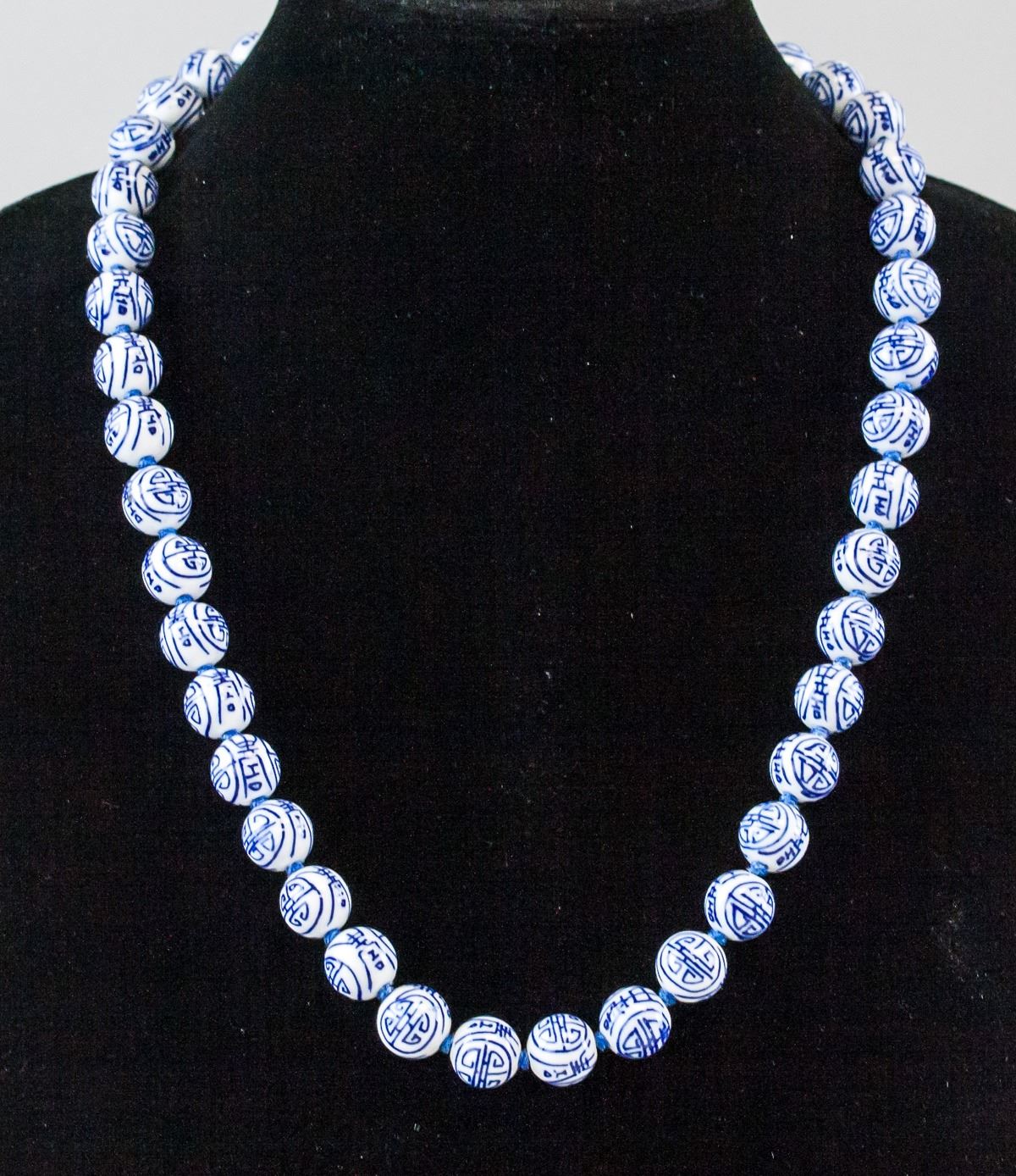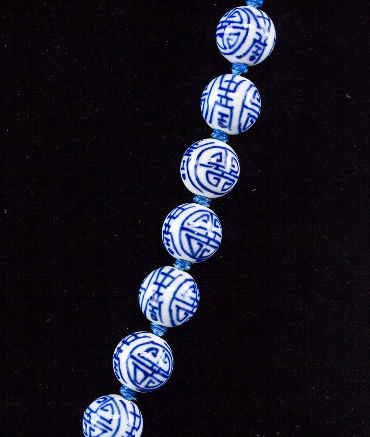 Chinese porcelain bead necklace. Of blue and white tone with longevity characters. Diameter: 21 cm, 105 grams.