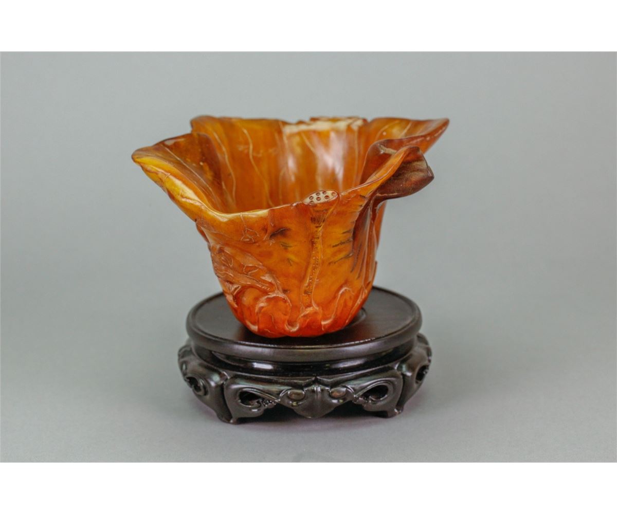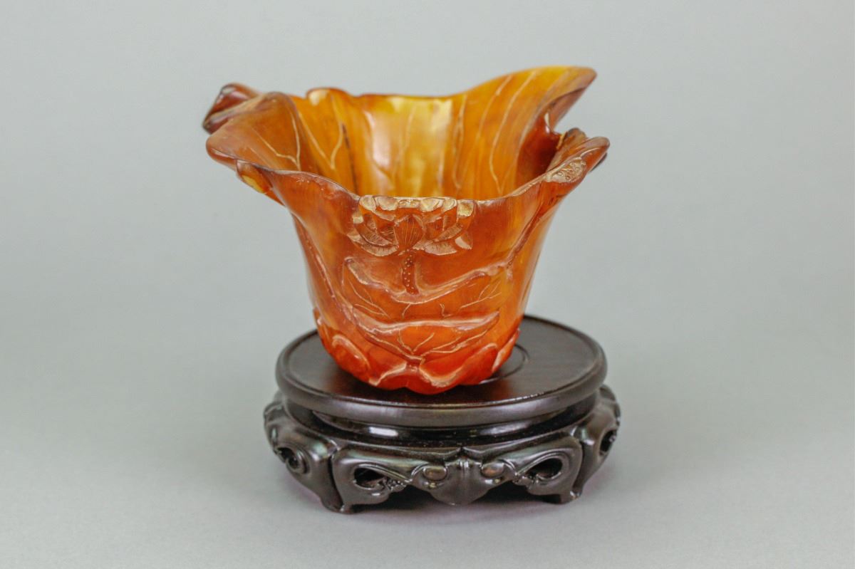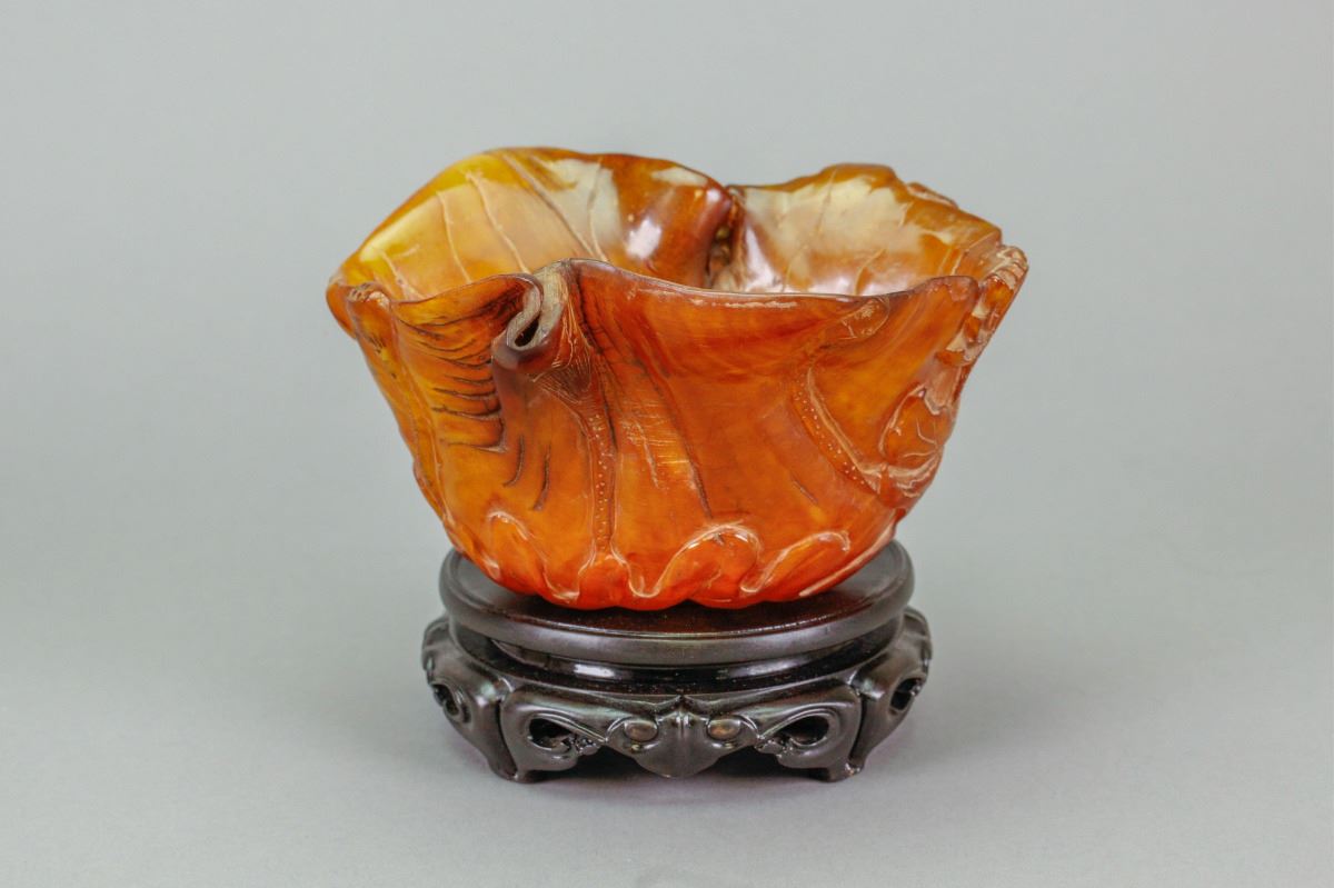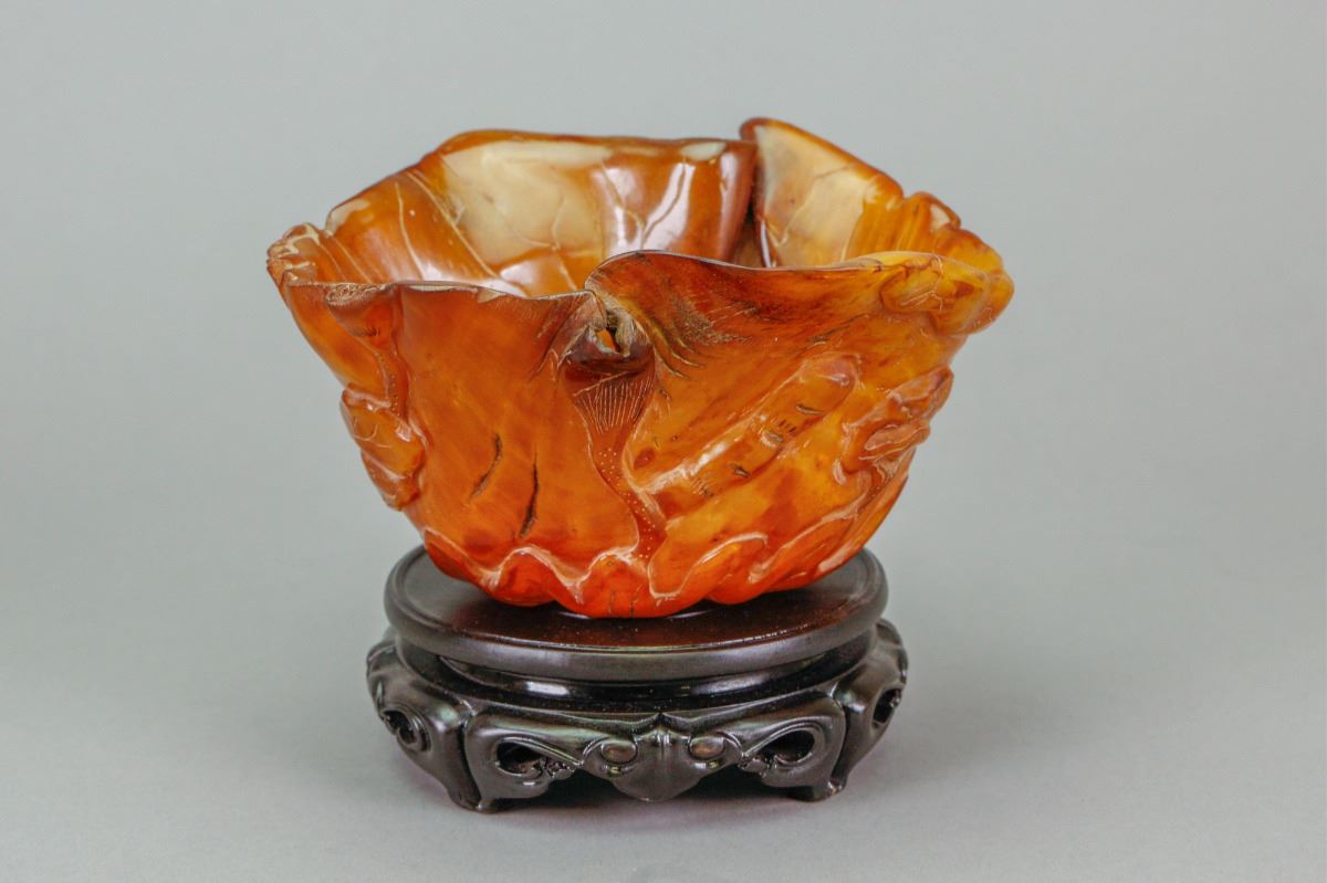 Chinese horn carved bowl; of lotus leaf form; featuring low-relief carvings of lotus on body; custom wood stand included; H: 8 cm, W: 19 cm, 191 grams