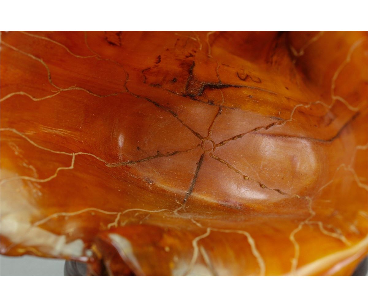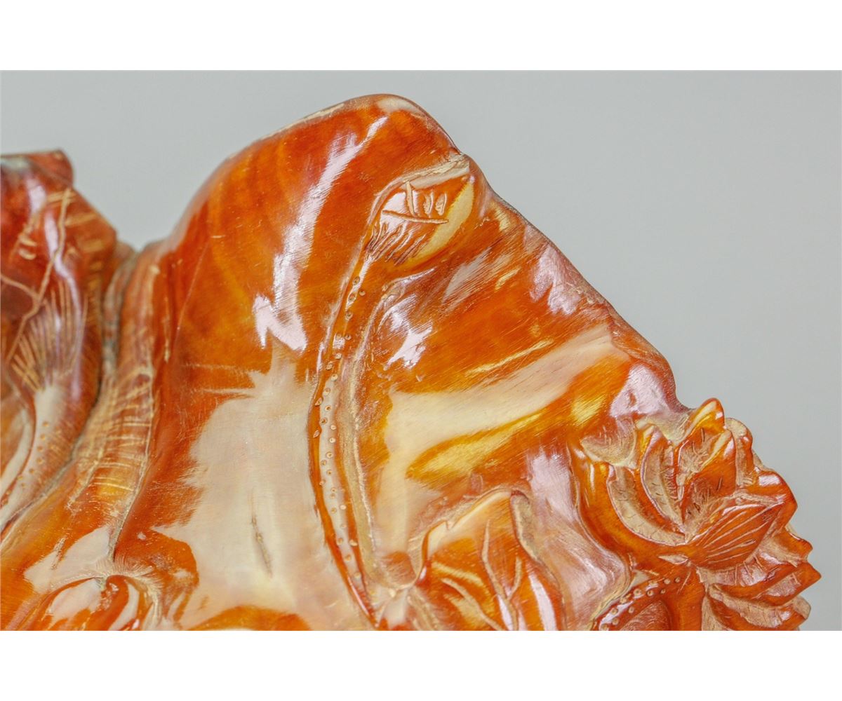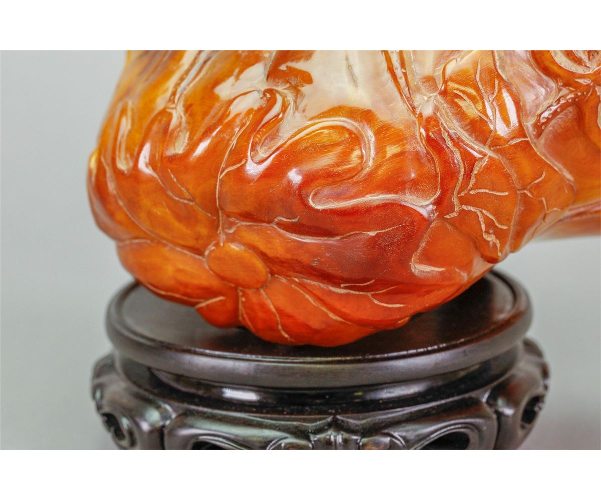 Chinese horn carved bowl; of lotus leaf form; featuring low-relief carvings of lotus on body; custom wood stand included; H: 8 cm, W: 19 cm, 191 grams