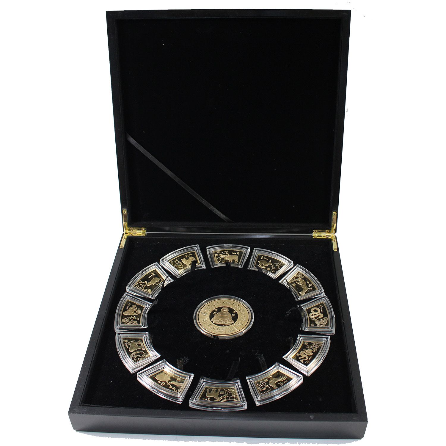 *Chinese Lunar Calendar 13-piece 24k Gold-plated Copper Medallion set. This set features a large round Medallion depicting a portrait of Buddha surrounded by the 12 Animal Signs of the Chinese Calendar on the reverse; the obverse features a Yin & Yang Motif and the Chinese character for all 12 Lunar animals, written in Chinese calligraphy. The 12 fan-shaped medals are arranged around the large round Buddha Medallion. (Outer box is lightly worn & capsules have light to moderate scratches)