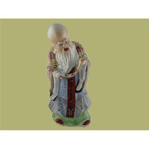 A wonderful figure of a Chinese man reading a scroll with very nice hand painted coloring. Mouth is slightly apart showing life-like teeth. Chinese markings on the bottom. Measures 10" tall and in excellent condition.