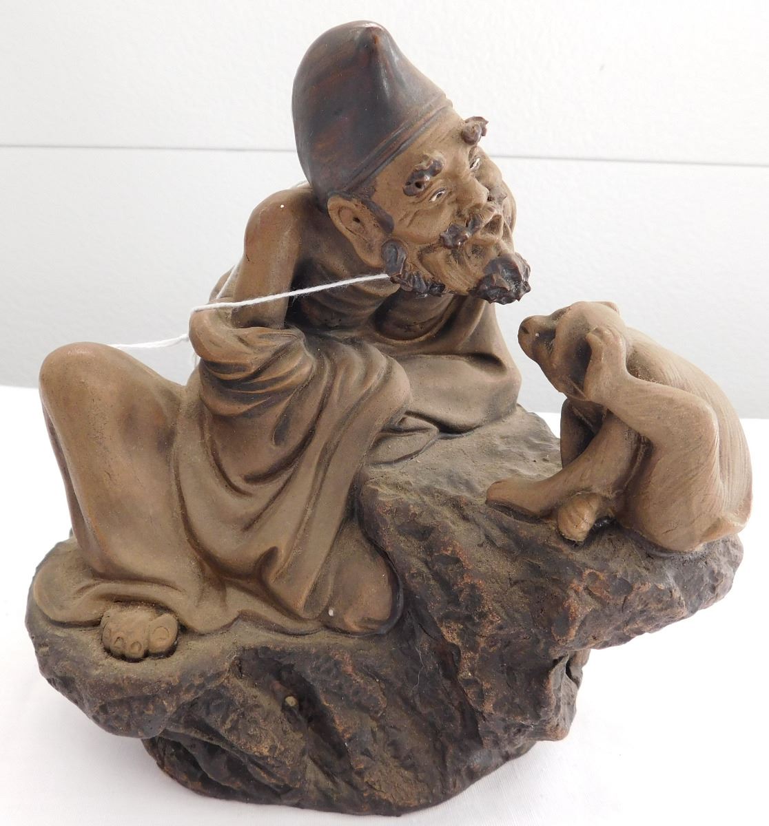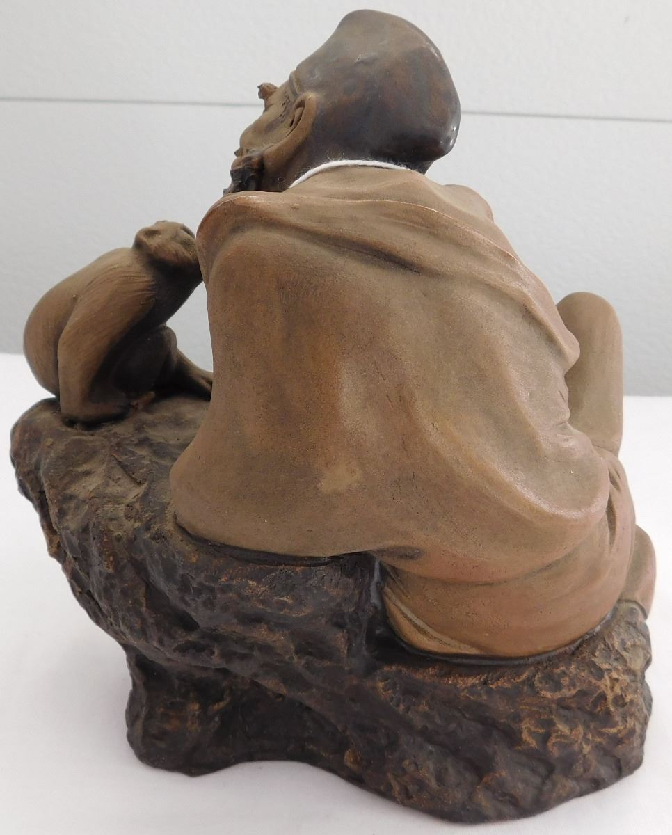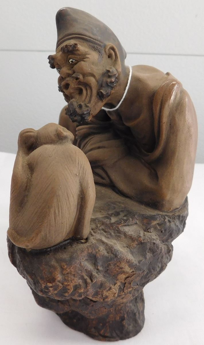 Chinese Man With Monkey, early 20th century item. Made of clay and paint, this item measures 7" x 6". China. Man staring at monkey. Condition: Good, see images. Shipping: $26.50, requires double box.