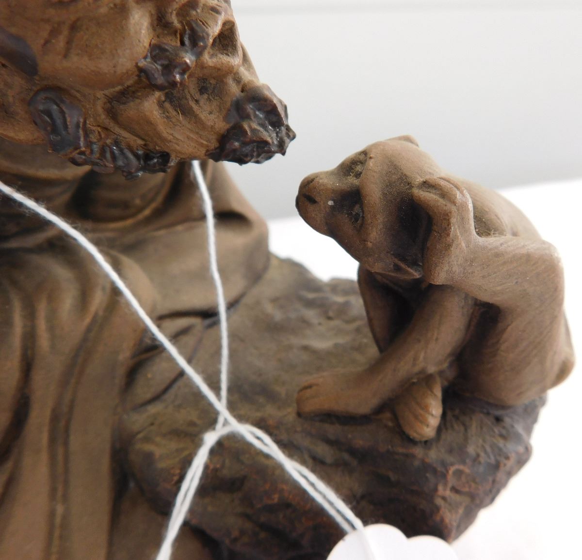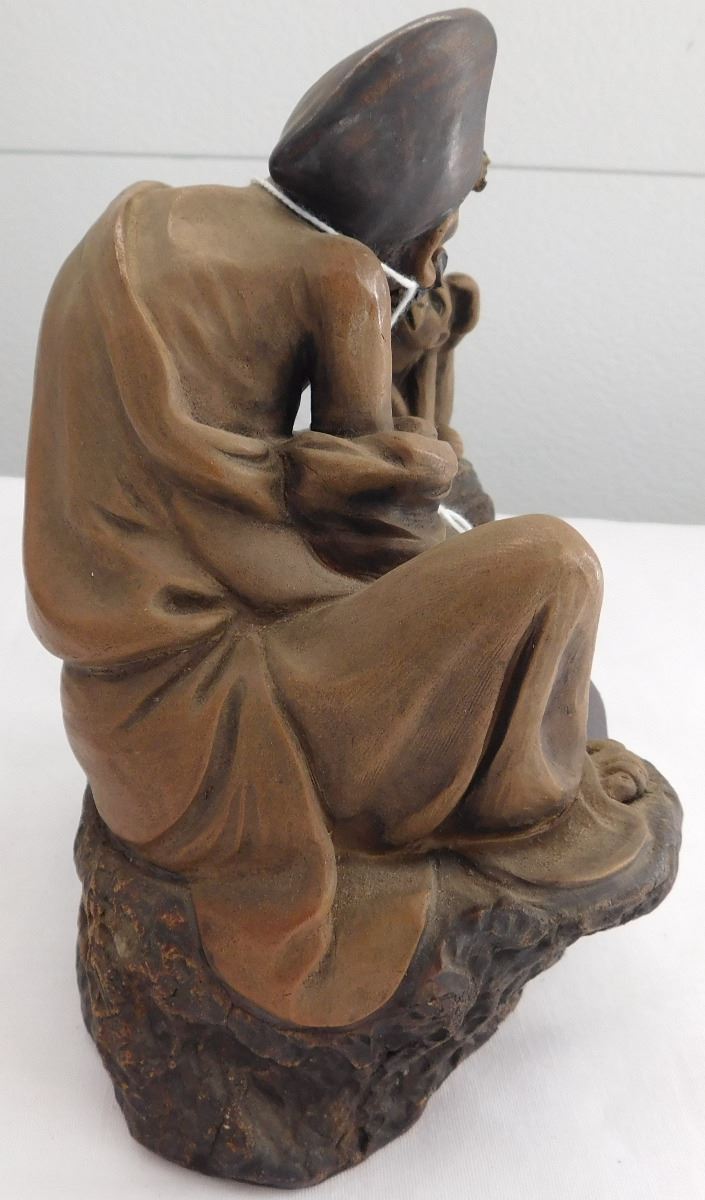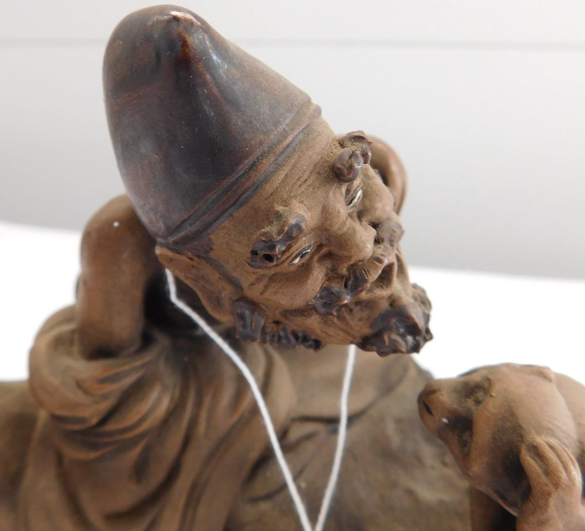 Chinese Man With Monkey, early 20th century item. Made of clay and paint, this item measures 7" x 6". China. Man staring at monkey. Condition: Good, see images. Shipping: $26.50, requires double box.