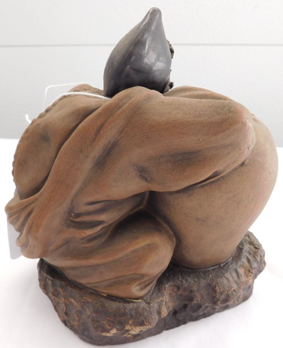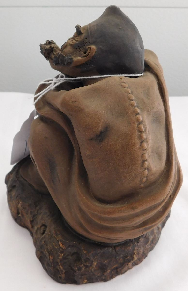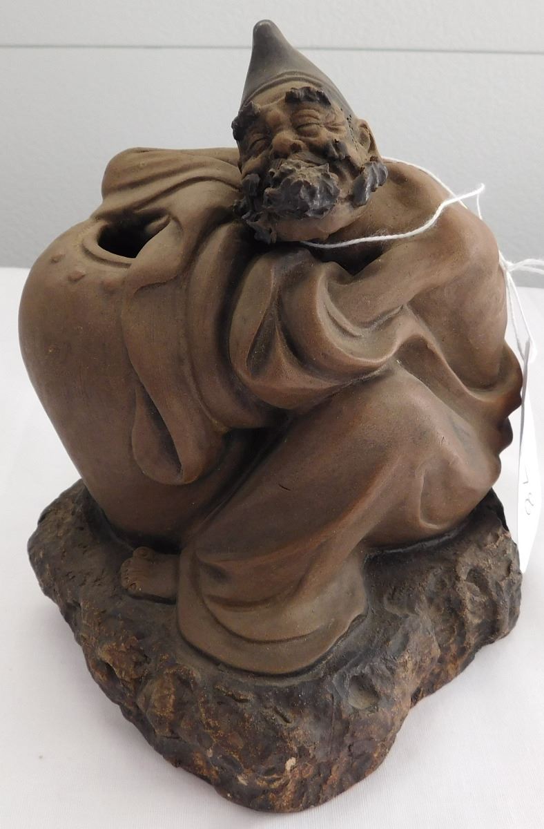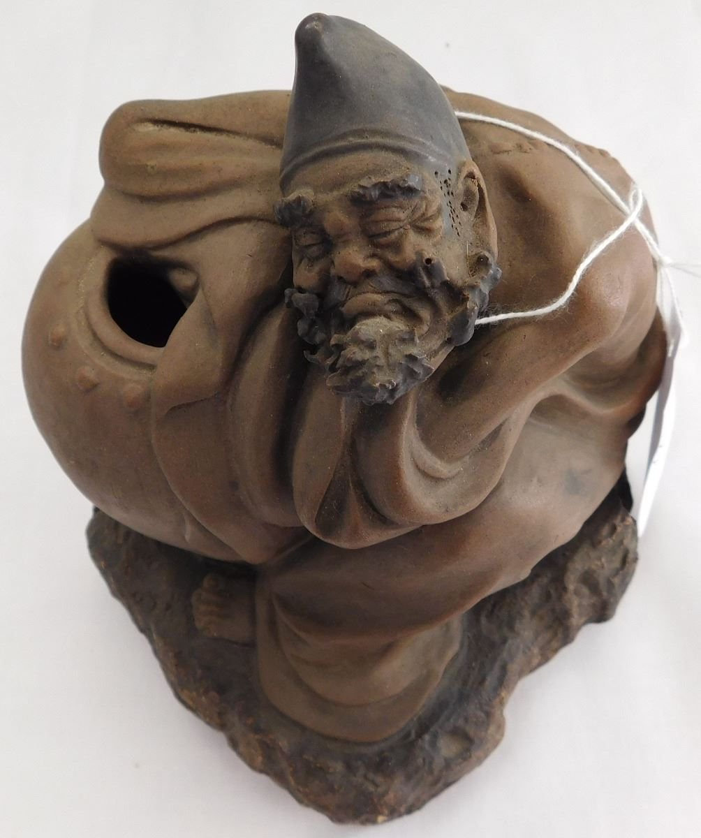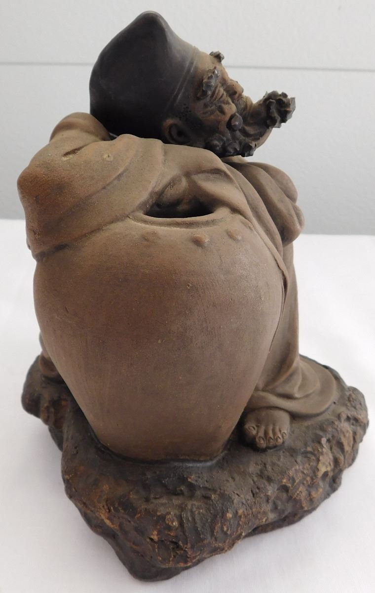 Chinese Man with Large Pot, early 20th century item. Made of clay and paint, this item measures 7" x 6". China. Appears happy man with a large pot, maybe booze! Marked on inside bottom. Condition: Good, see images. Shipping: $26.50, requires double box.