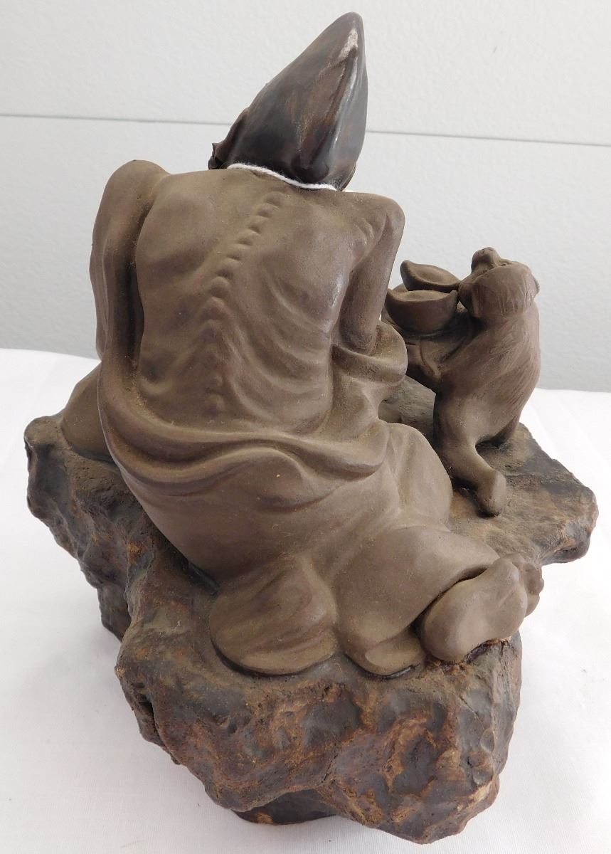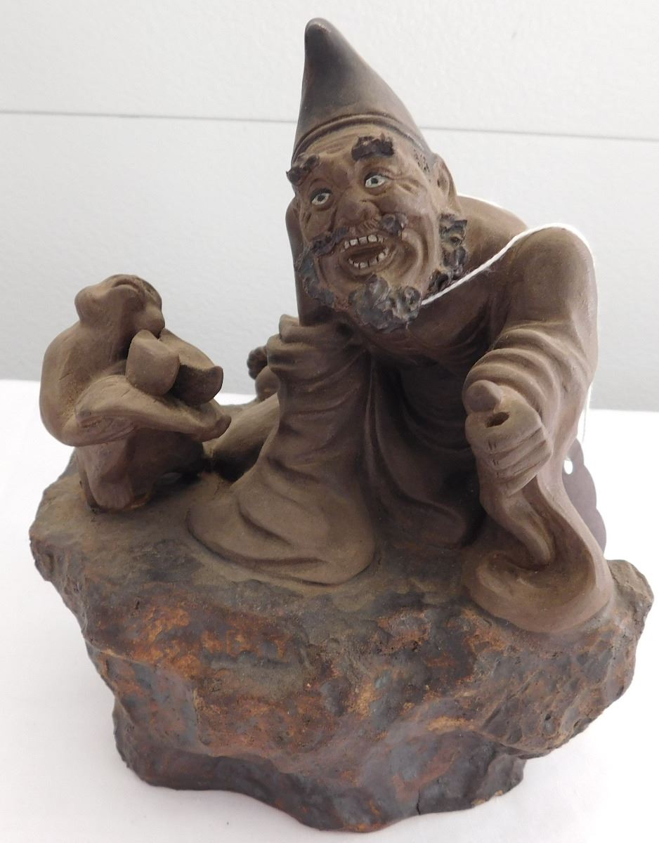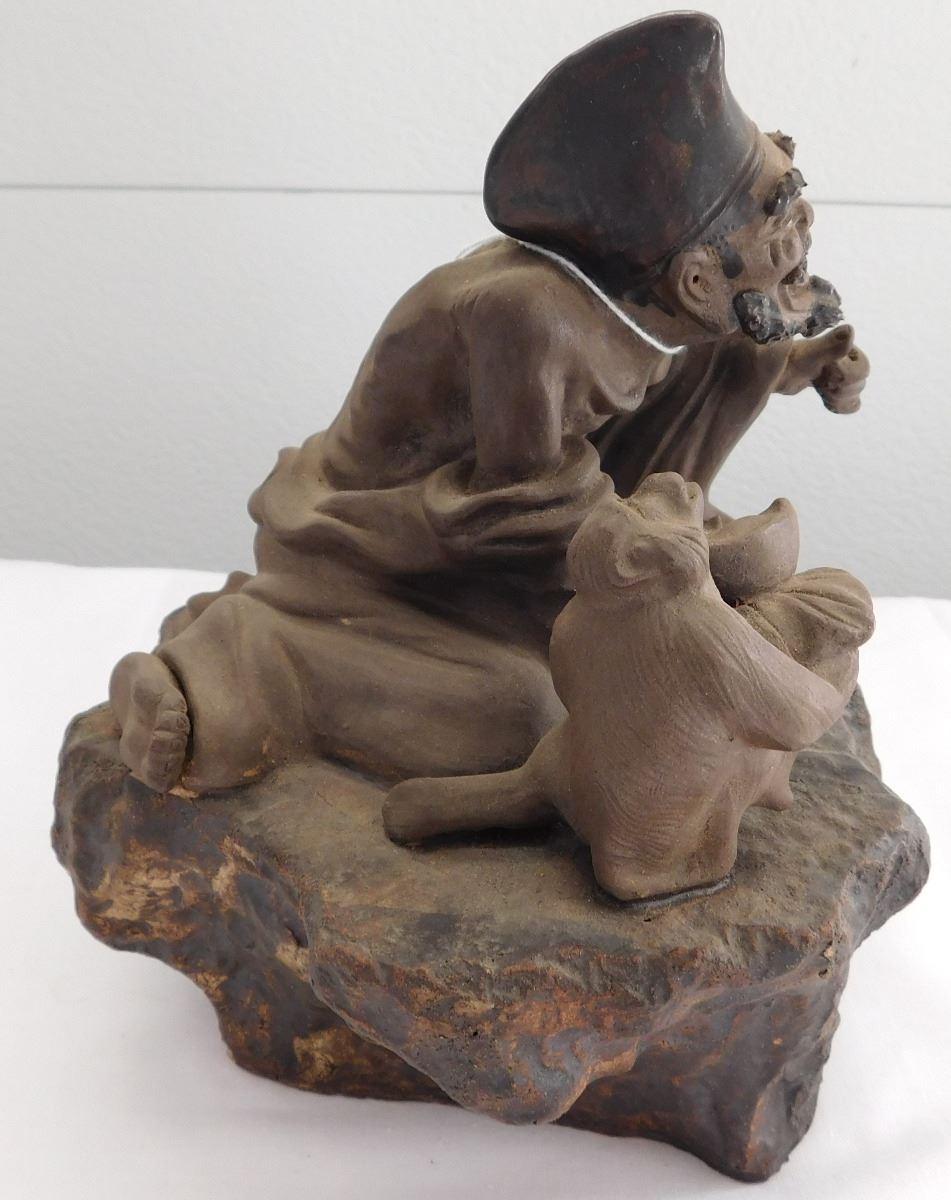 Chinese Man with Monkey, circa early 20th century. Made from clay and paint, item measures 7 x 6 inches. China. The man has monkey and bowl. Marked on inside bottom. Condition: Good, see images. Shipping: $24.50, requires double-box.