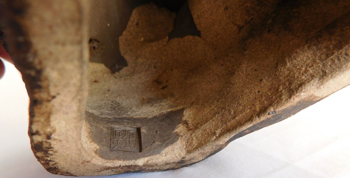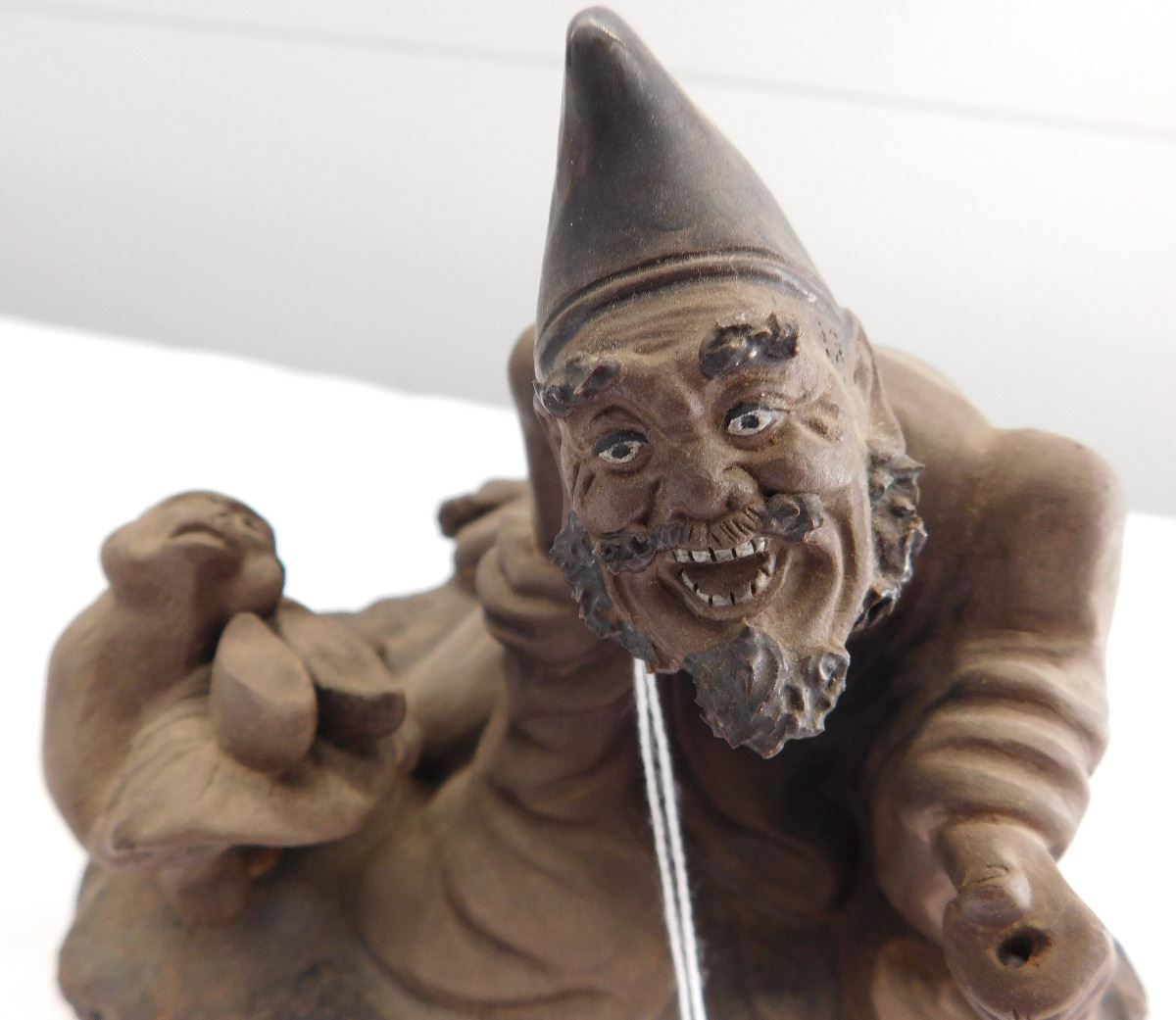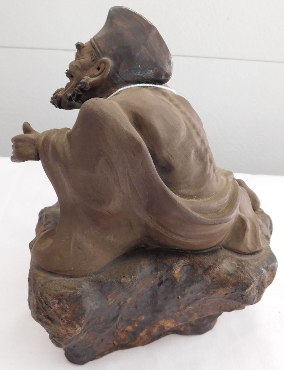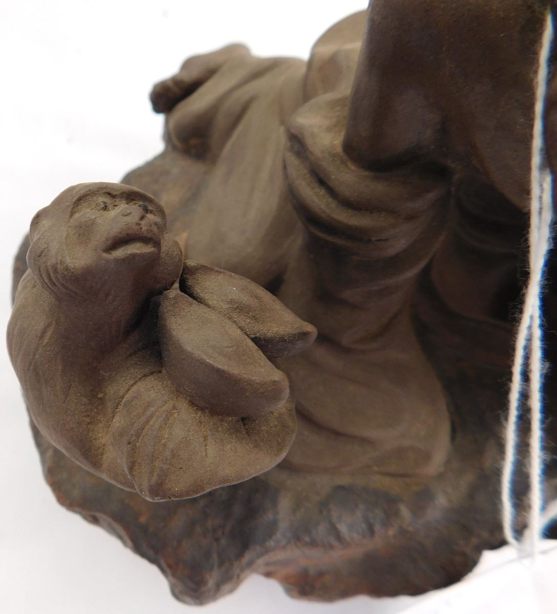 Chinese Man with Monkey, circa early 20th century. Made from clay and paint, item measures 7 x 6 inches. China. The man has monkey and bowl. Marked on inside bottom. Condition: Good, see images. Shipping: $24.50, requires double-box.