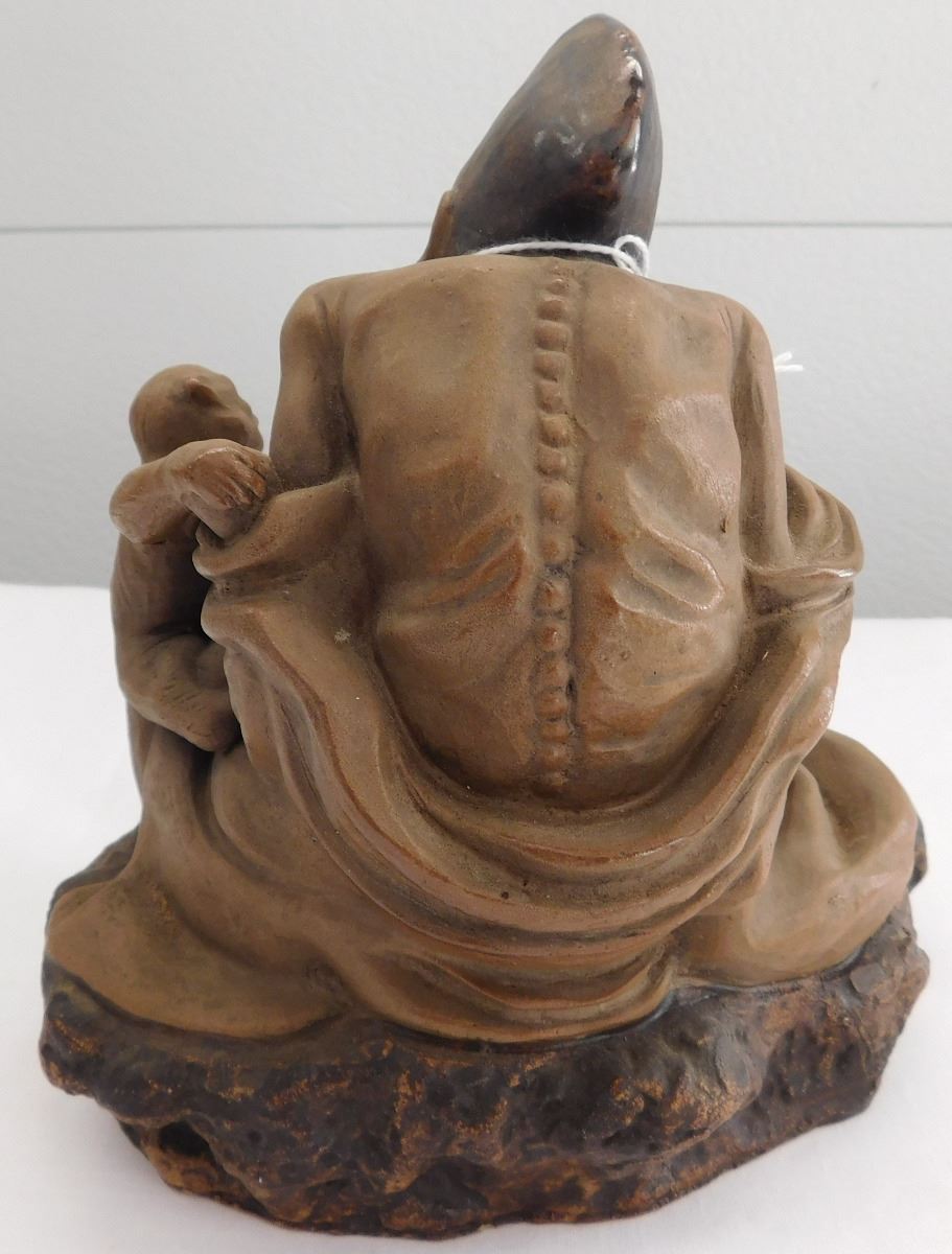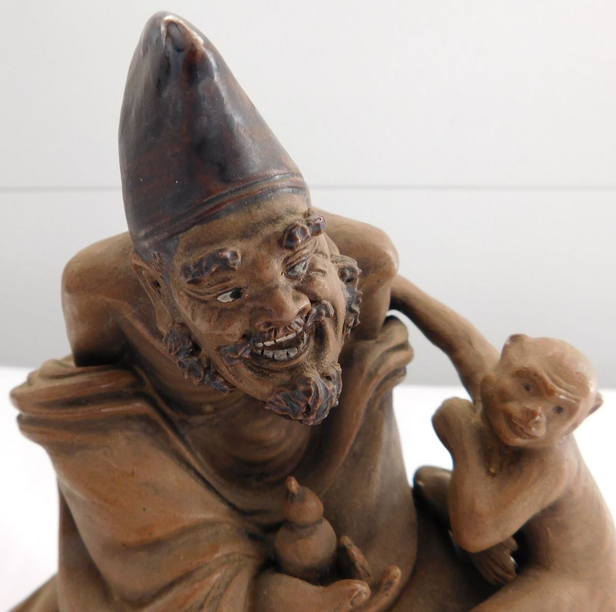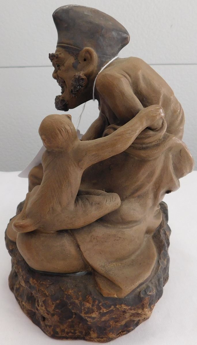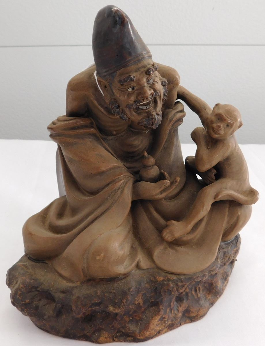 Chinese Man with Monkey, circa early 20th century. Made from clay and paint, item measures 7" x 6". China. Marked on inside bottom. Man with monkey and bottle. Condition: Good, see images. Shipping: $26.50, requires double box.