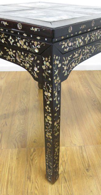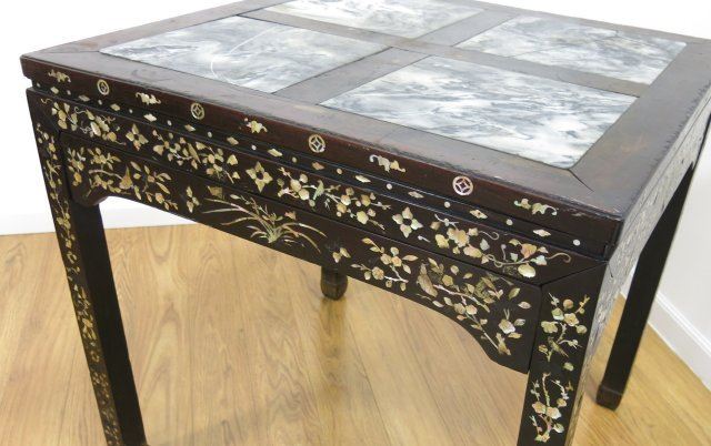 Mother of pearl inlay. Floral & bird design. Approx. 30" x 30" x 30". From a private NYC estate. 1 marble square cracked on surface.