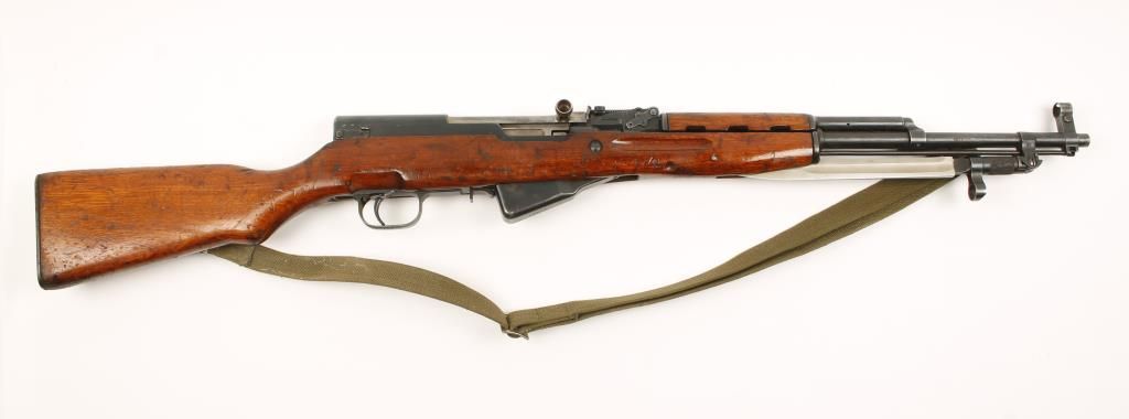 Chinese made semi auto military rifle with 20-1/2" barrel. Blued finish, oil finished wood stock, hooded front sight graduated rear sight to 1,000 meters, 10 shot fixed magazine, blade bayonet and canvas sling. All numbers matching including stock. Very good bore and action. Import marked. Condition: Good overall showing high point wear and dings and bruising in wood. *Curio & Relic Firearm*
