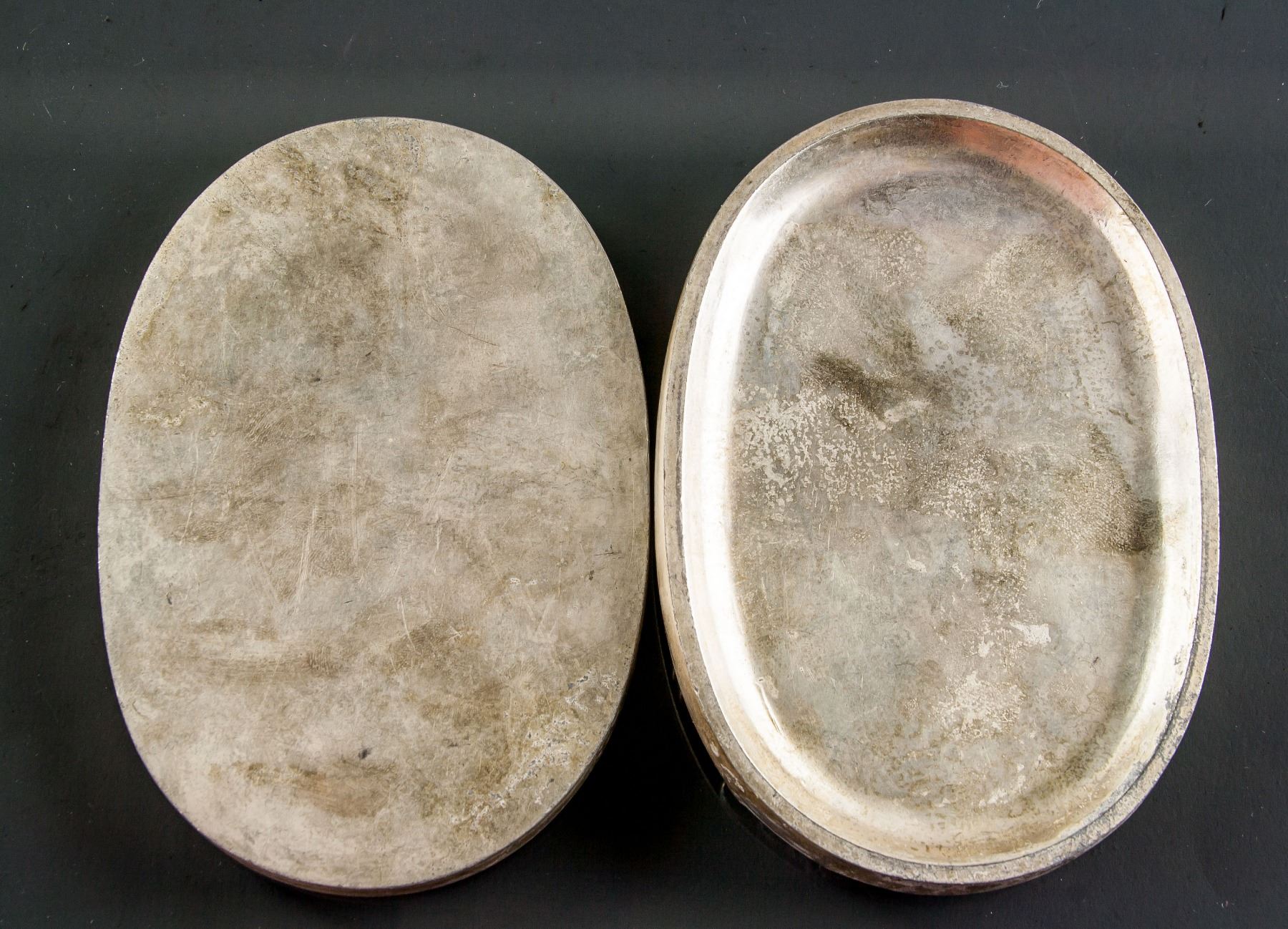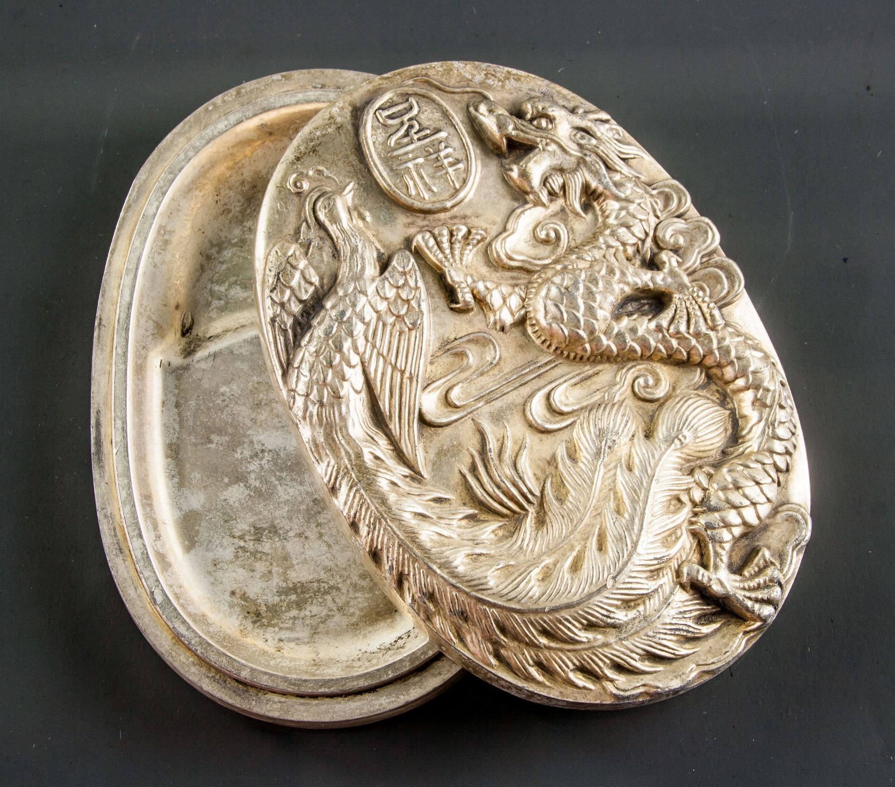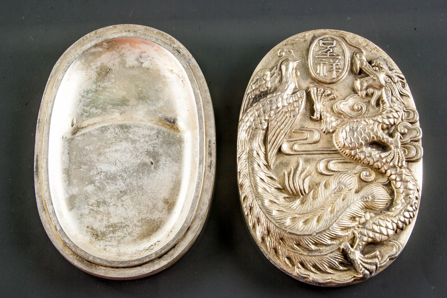 Chinese metal ink stone, carved with dragon and phoenix (Long Feng Cheng Xiang), 13. x 9.5 x 3 cm, 1169 grams