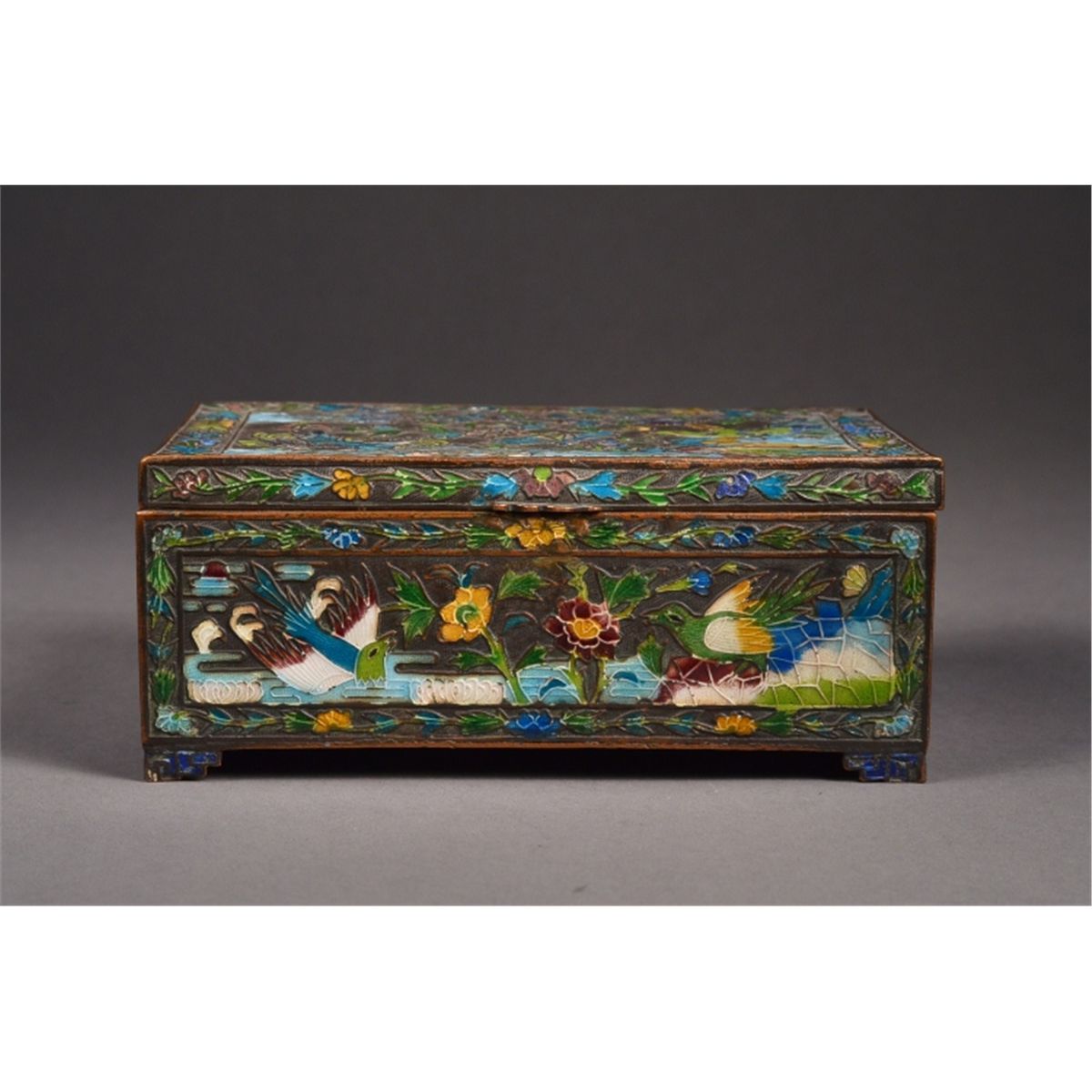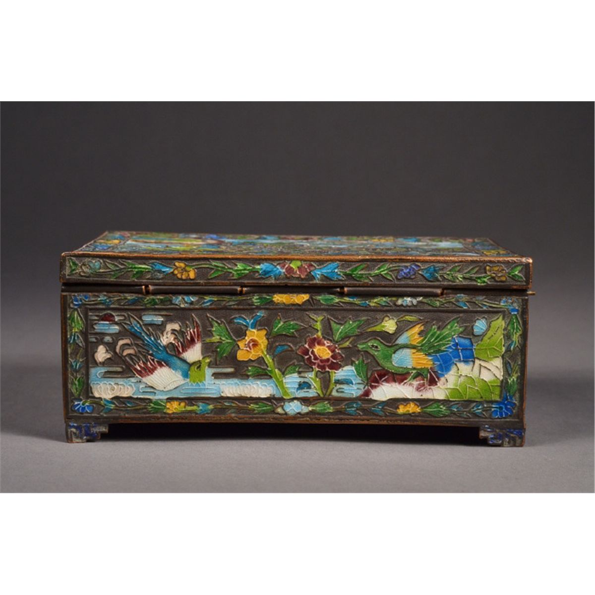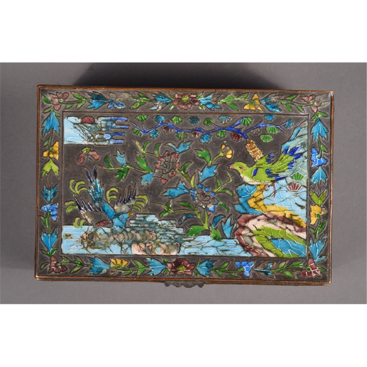 Chinese metal jewelry box with enameled exterior and lined with wood on the interior; of rectangular form: with floral and bird motif; stamped 'CHINA' on base; 5 1/4" long, 3 3/8" wide, 2 1/4" tall