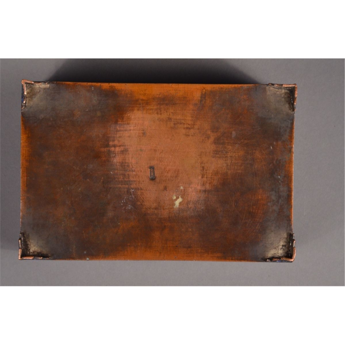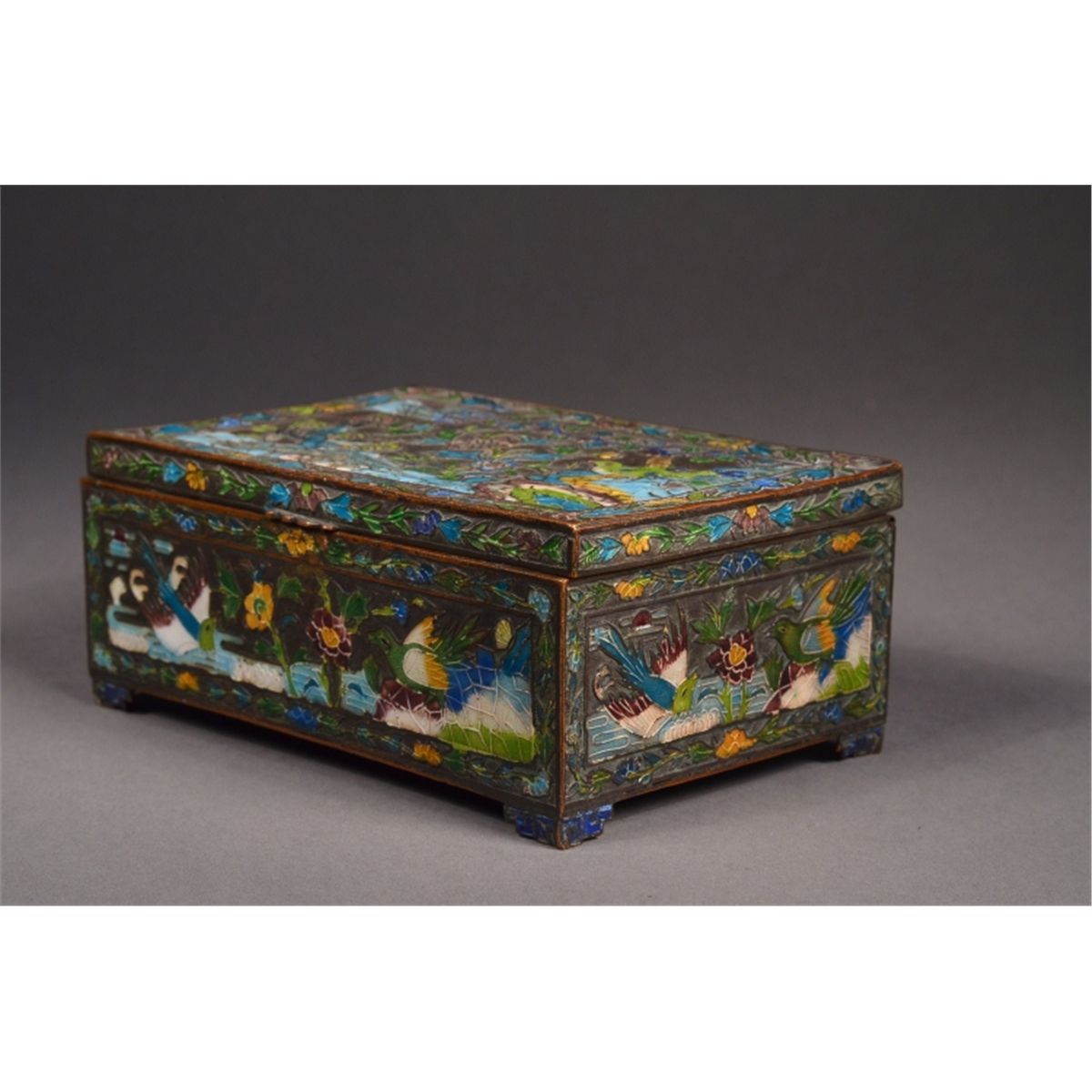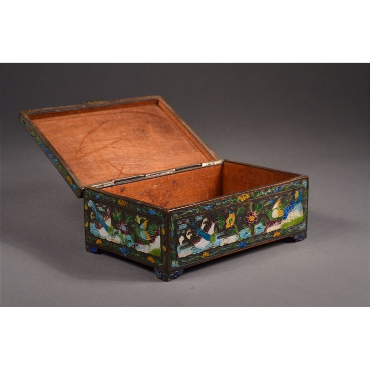Chinese metal jewelry box with enameled exterior and lined with wood on the interior; of rectangular form: with floral and bird motif; stamped 'CHINA' on base; 5 1/4" long, 3 3/8" wide, 2 1/4" tall