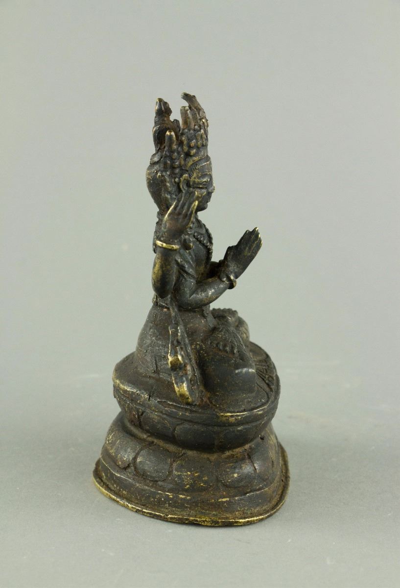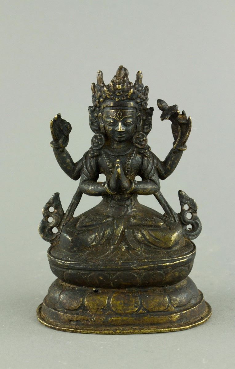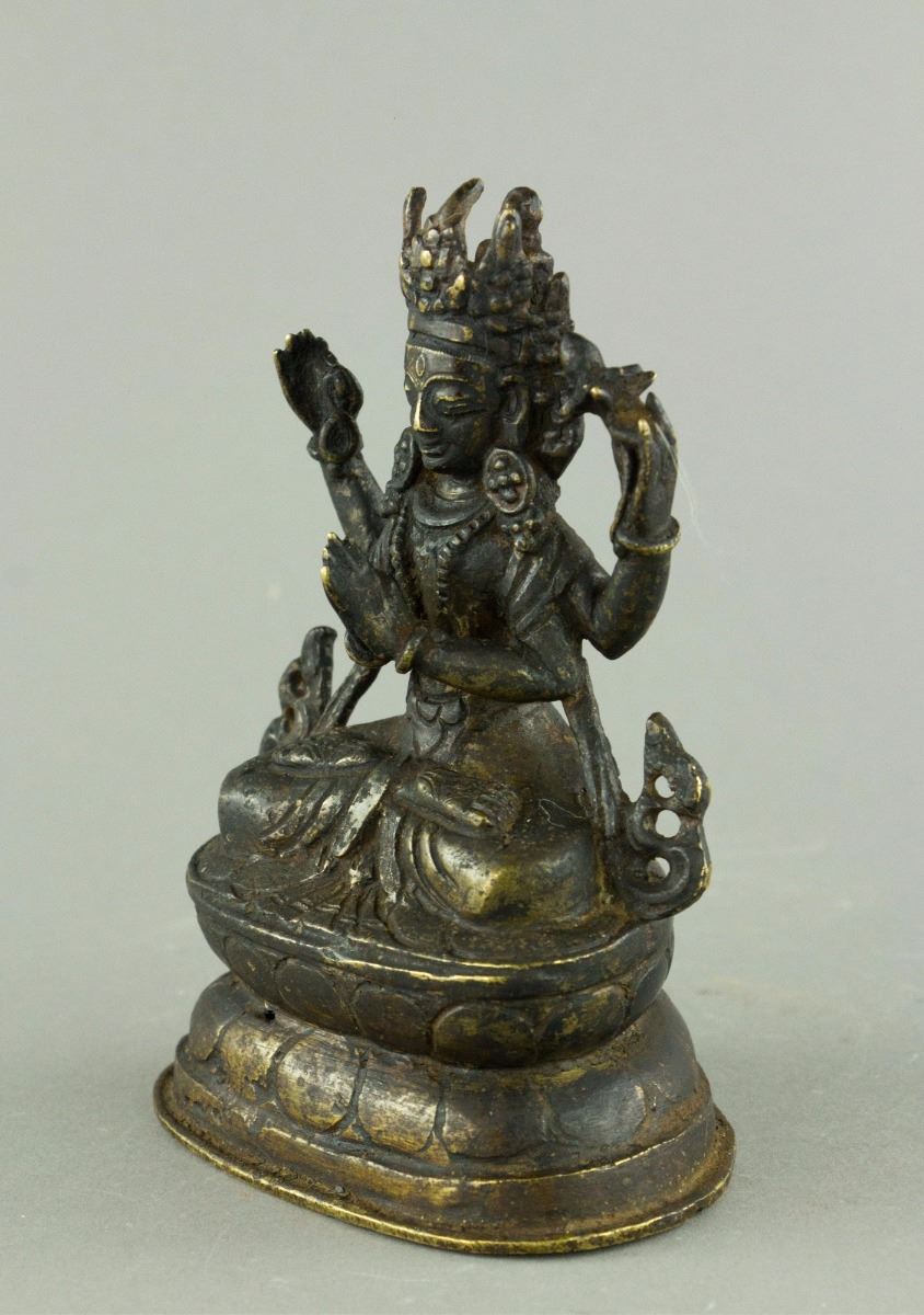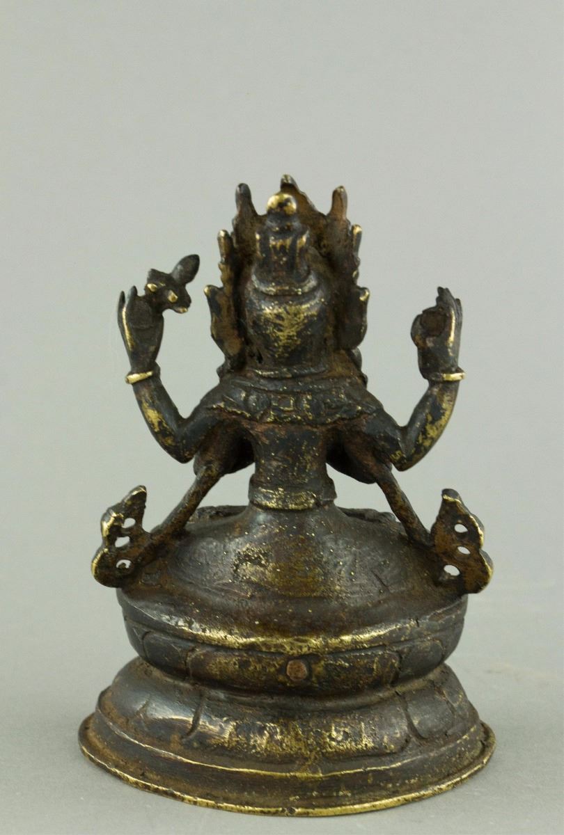 Chinese Ming bronze cast figure; depicting four-armed Buddha on lotus plinth; each of the arm holding an ritual item; H: 13 cm, L: 10 cm, 553 grams