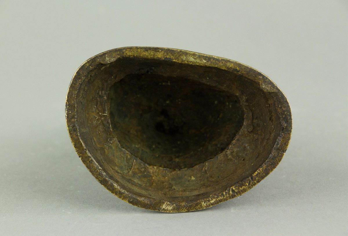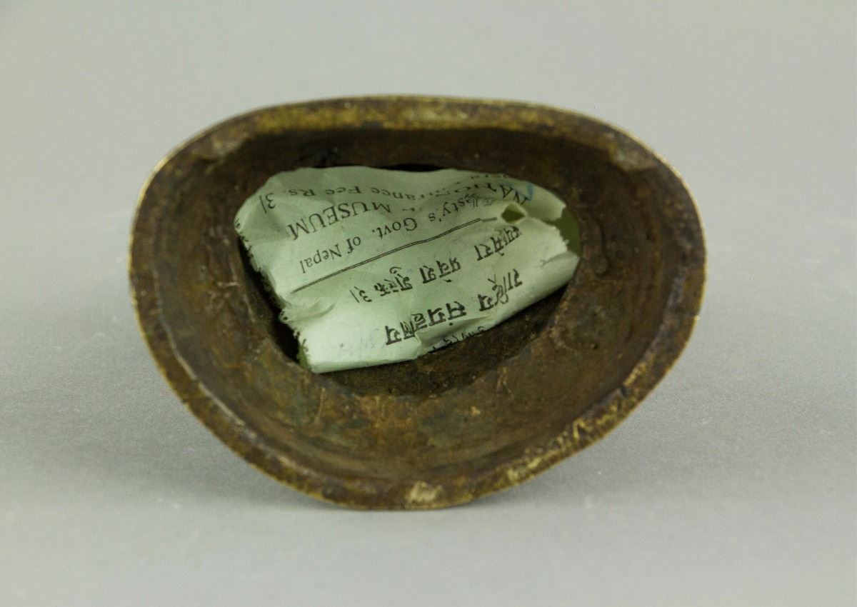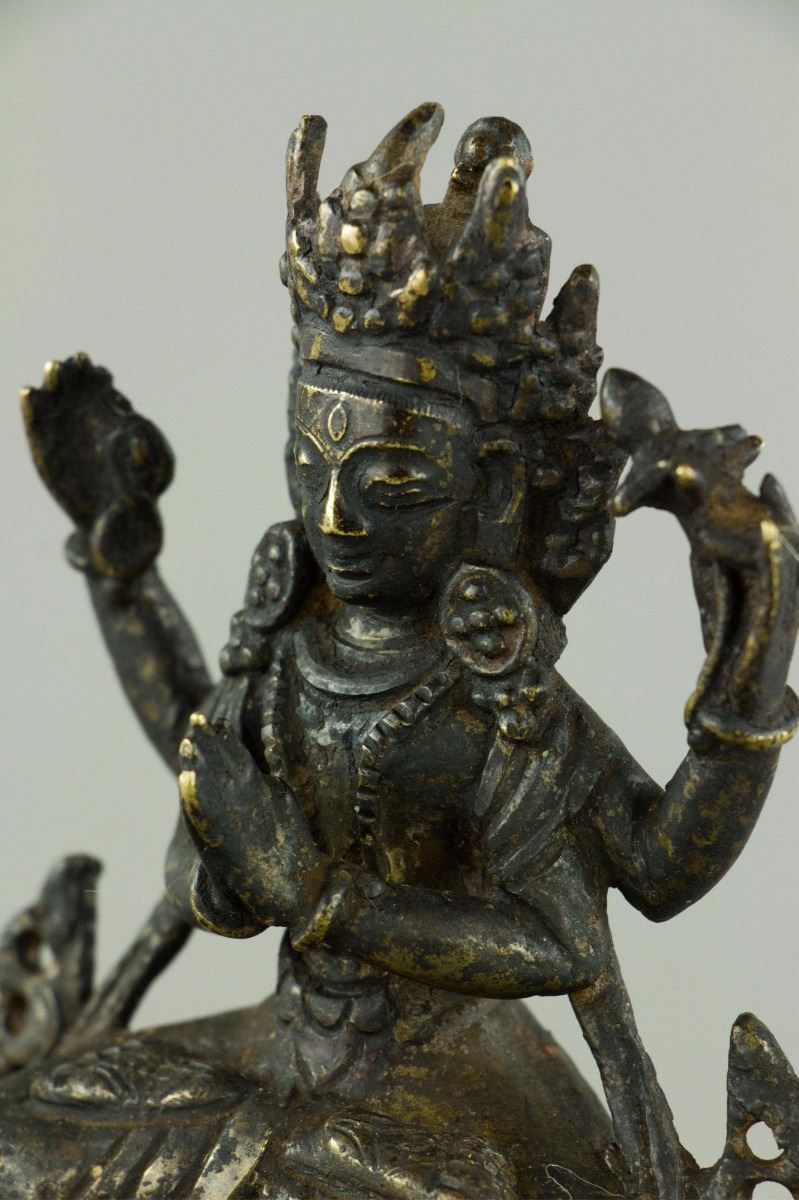 Chinese Ming bronze cast figure; depicting four-armed Buddha on lotus plinth; each of the arm holding an ritual item; H: 13 cm, L: 10 cm, 553 grams