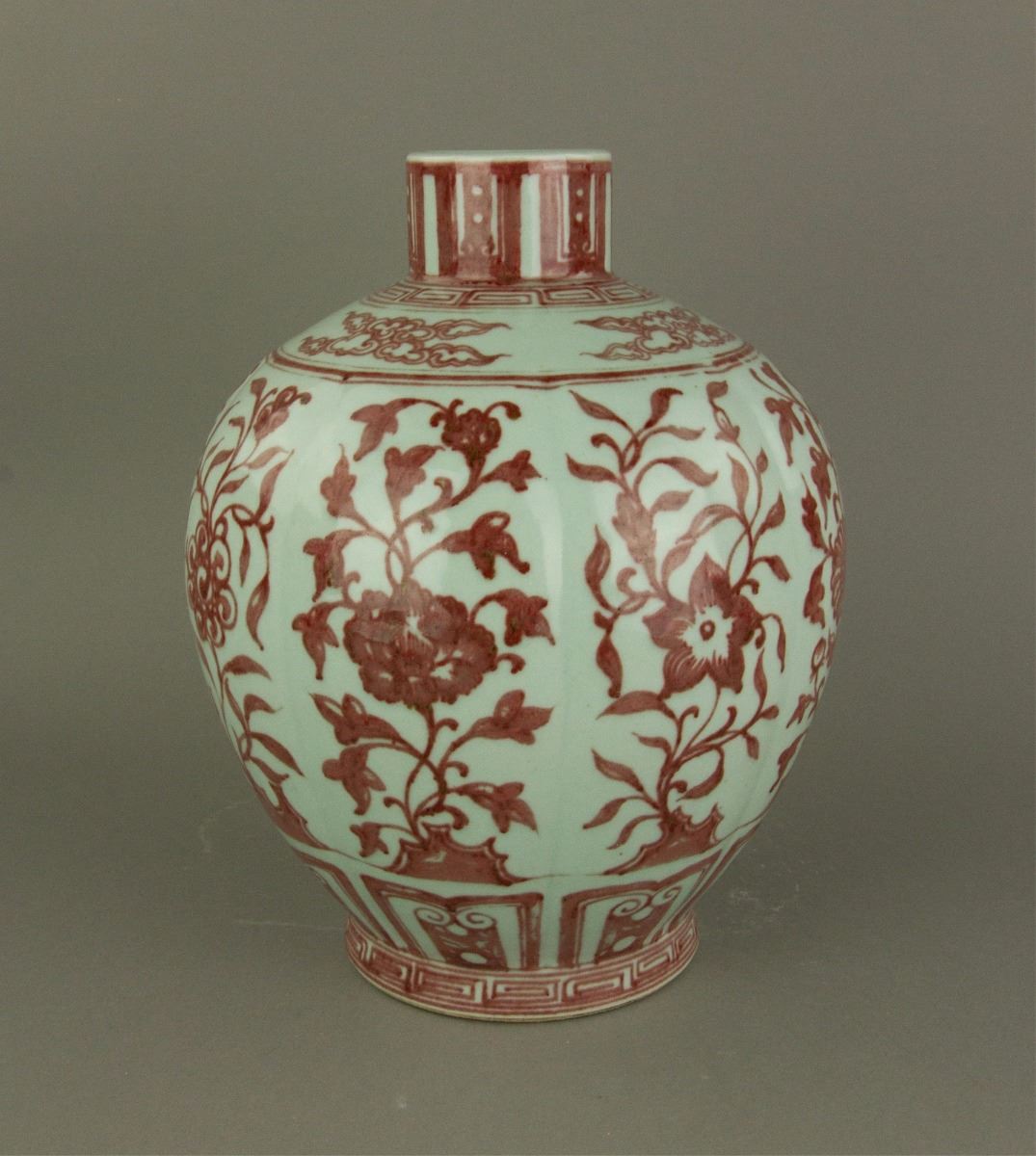 Chinese copper red glazed porcelain vase; Ming period; of eight-lobed oval body with a short cylindrical mouth; painted with various floral branches; unglazed base; H: 26 cm, D: 19 cm, 2784 grams