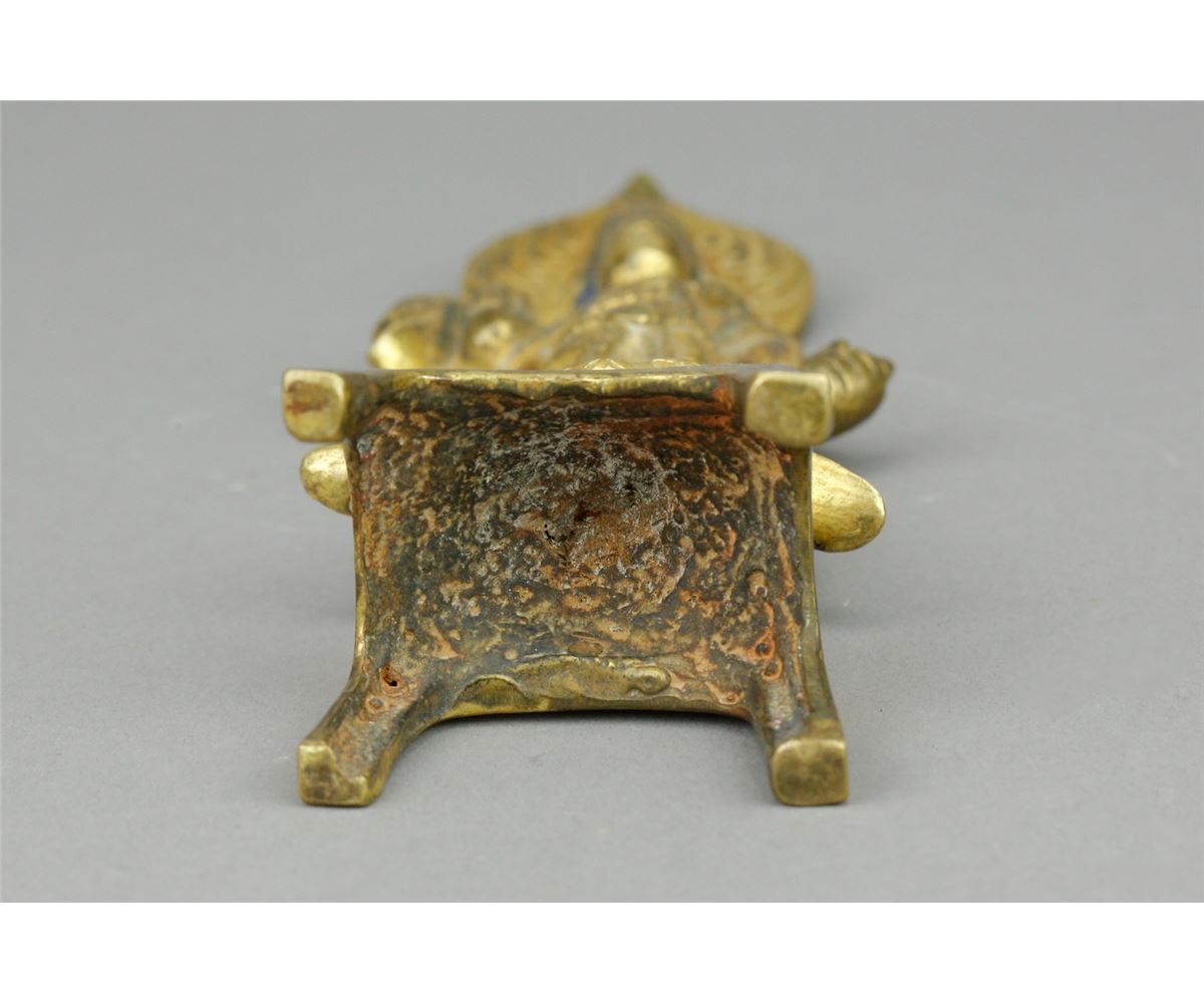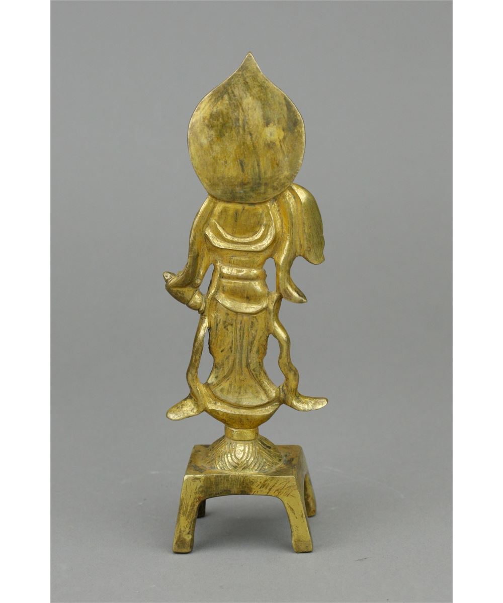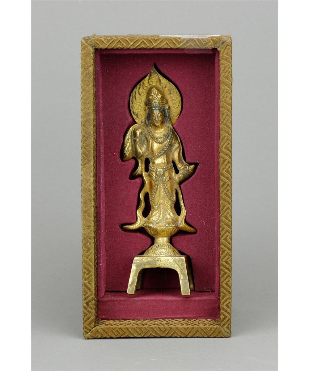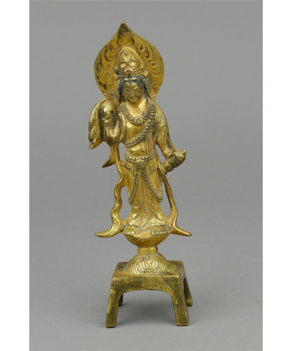 Chinese gilt Buddha with stand; supported on four-legged stand; featuring standing Buddha wearing robe and cape; with glory behind his head; covered by gilt paint on whole body; Ming period 16th to 17th century; custom made box included; H: 18.5 cm, W: 6 cm, 216 grams