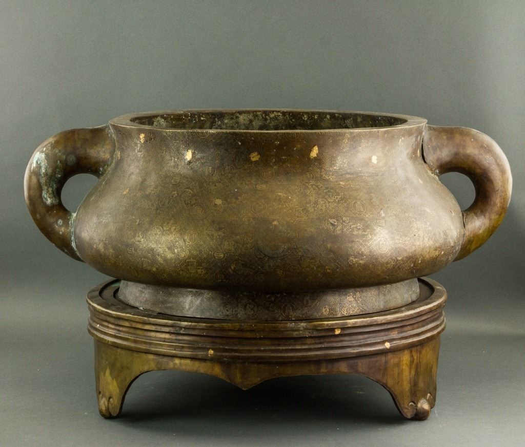 Chinese large bronze censer; gold gilded with geometric and auspicious pattern decoration exterior body; with tripod stands; six-character Xuande marks on base; extremely rare; H: 43 cm, W: 70 cm, 52.25 kg