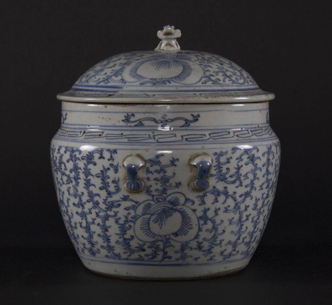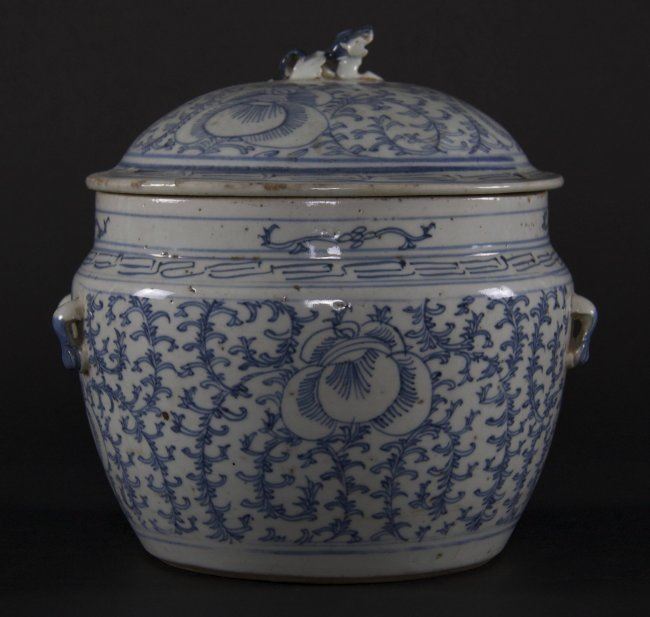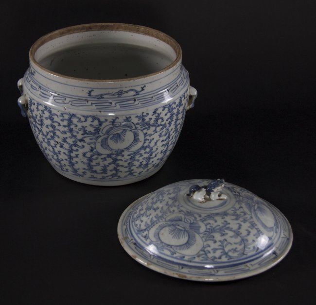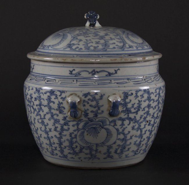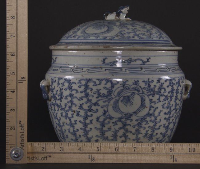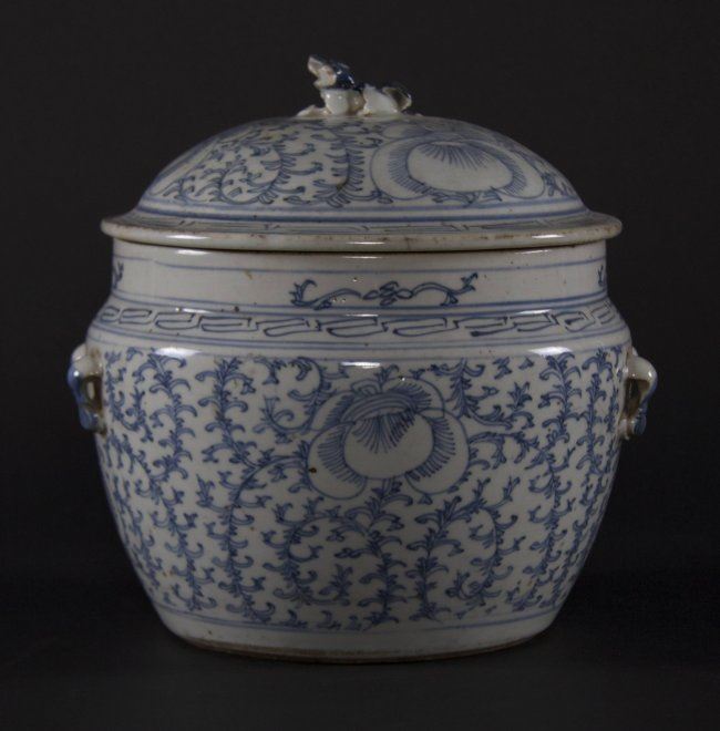 Chinese Ming OR early Qing Dynasty blue and white porcelain jar with foo lion lid handle and floral decorations throughout. Blue and white porcelain is contrived using the color blue, usually from cobalt oxide, to create designs on shaped clean, white clay that is then covered in a layer of transparent glaze and baked in a kiln at high temperatures. Traces of blue and white wares are found beginning in the Tang dynasty (618-907) but it was not until the Yuan dynasty (1271-1368) that the art reached perfection. During the Ming (1368-1644) and Qing (1644-1911) dynasties, the blue and white ware industry became increasingly important because at this time, blue and white porcelain was not only known within the borders of China, it was also welcomed in the international trade market. The peak of Chinese ceramic production was seen in the reigns of Kangxi (1661-1722), Yongzheng (1722-1735), and Qianlong (1735-1796) during which improvement was seen in almost all ceramic types, including the blue and white wares, polychrome wares, etc. The improved enamel glazes of early Qing Dynasty being fired at a higher temperature also acquired a more brilliant look than those of the Ming Dynasty. (Size: See second photo for measurement.) Photos are part of the description representing the condition report. Pangaea Auctions urges Bidder's to view all attached photos.