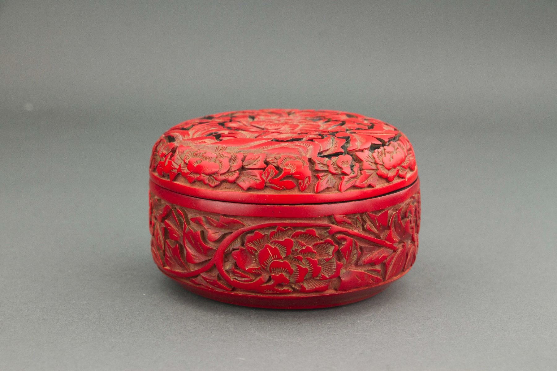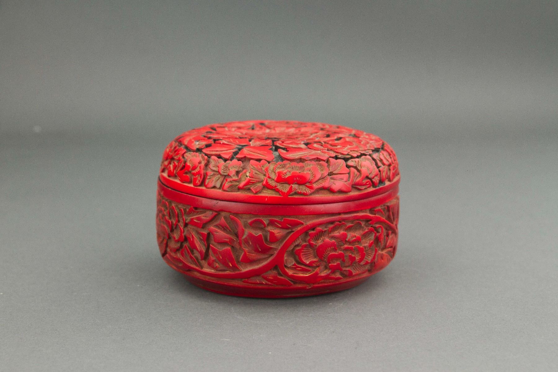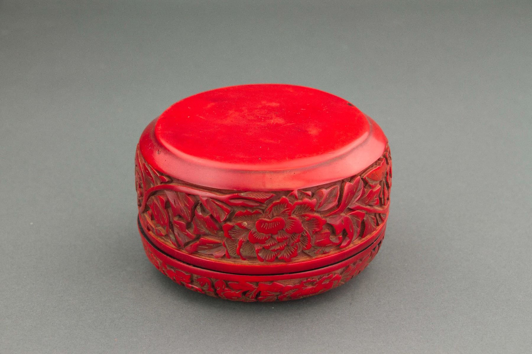 Chinese red lacquer box; of compressed cylinder shape body with cover; body and cover with low relief leafy and floral pattern carving; Ming period; H: 7 cm, D: 12 cm, 309 grams