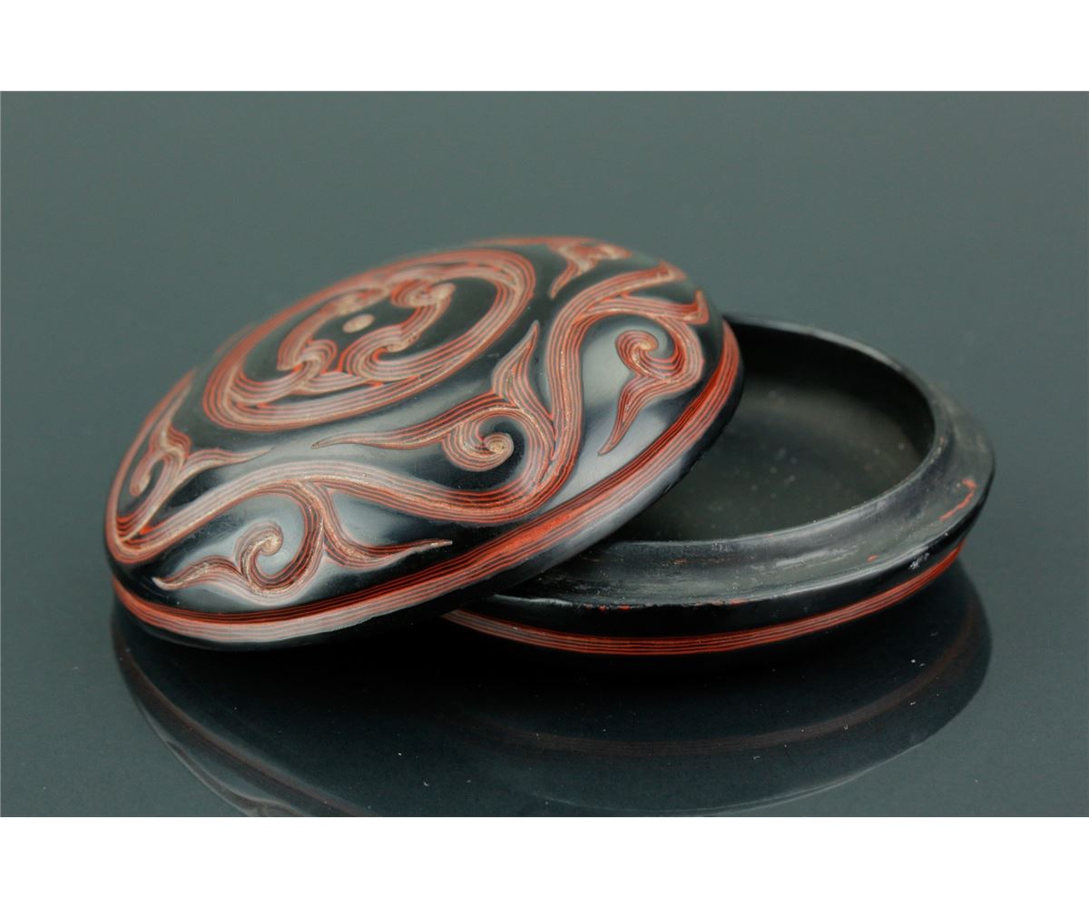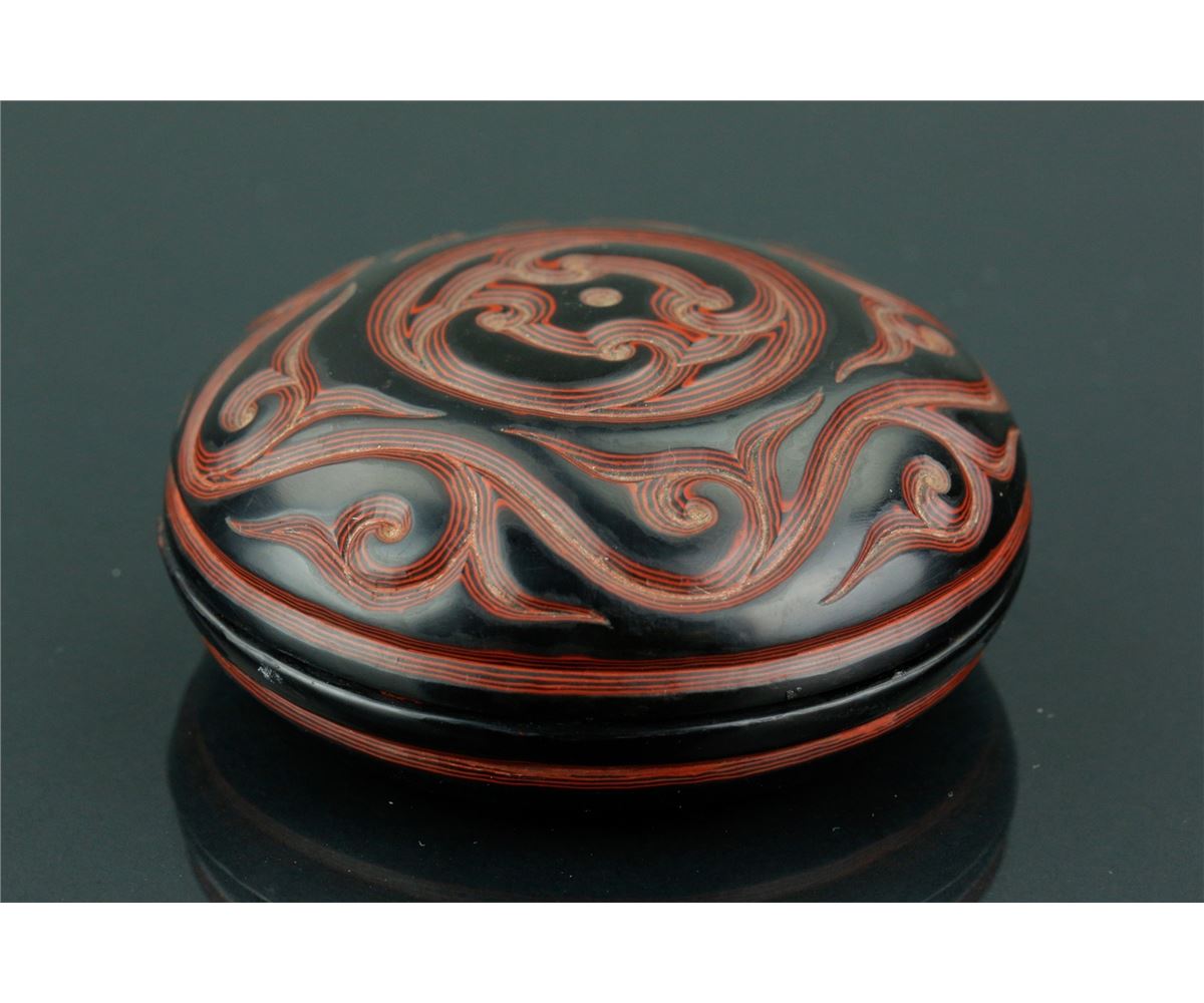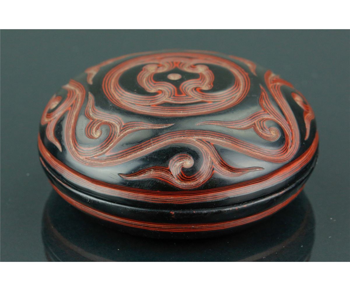 Chinese Ming style cosmetic case; featuring red lacquer drawing of archaistic scrollwork on black lacquer ground; four-character Ming Xuande mark on base; H: 2.5 cm, D: 8 cm, 56 grams