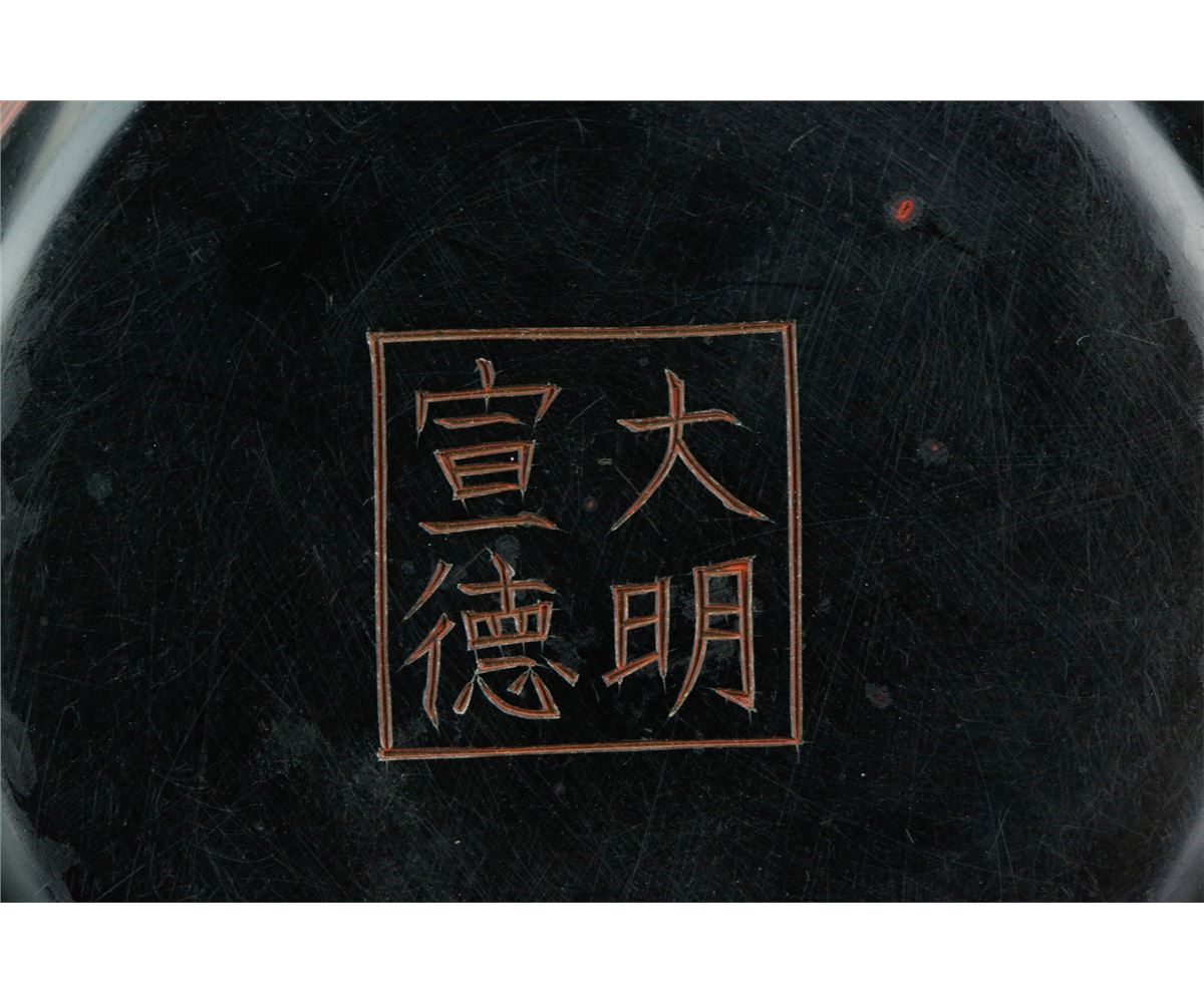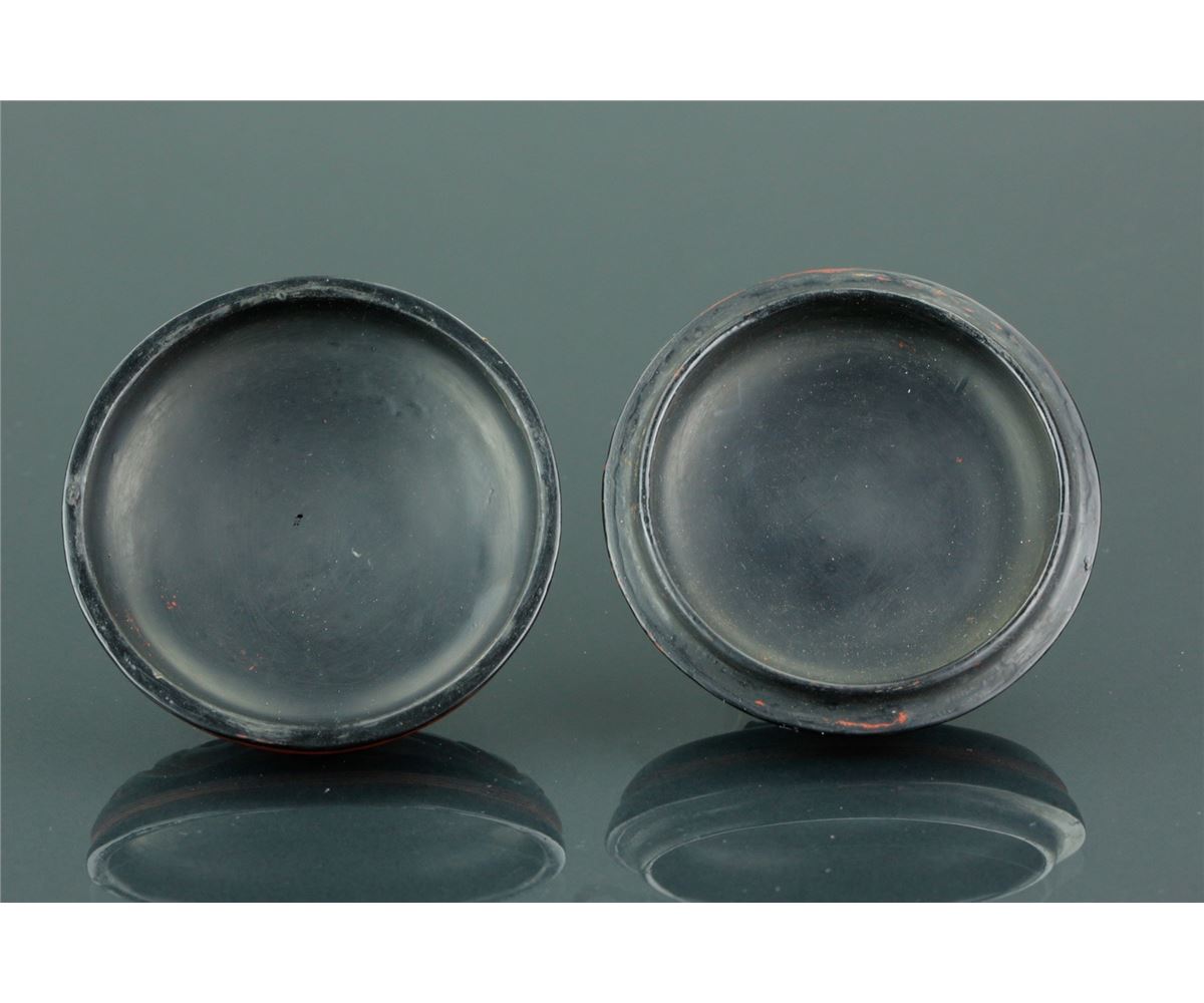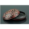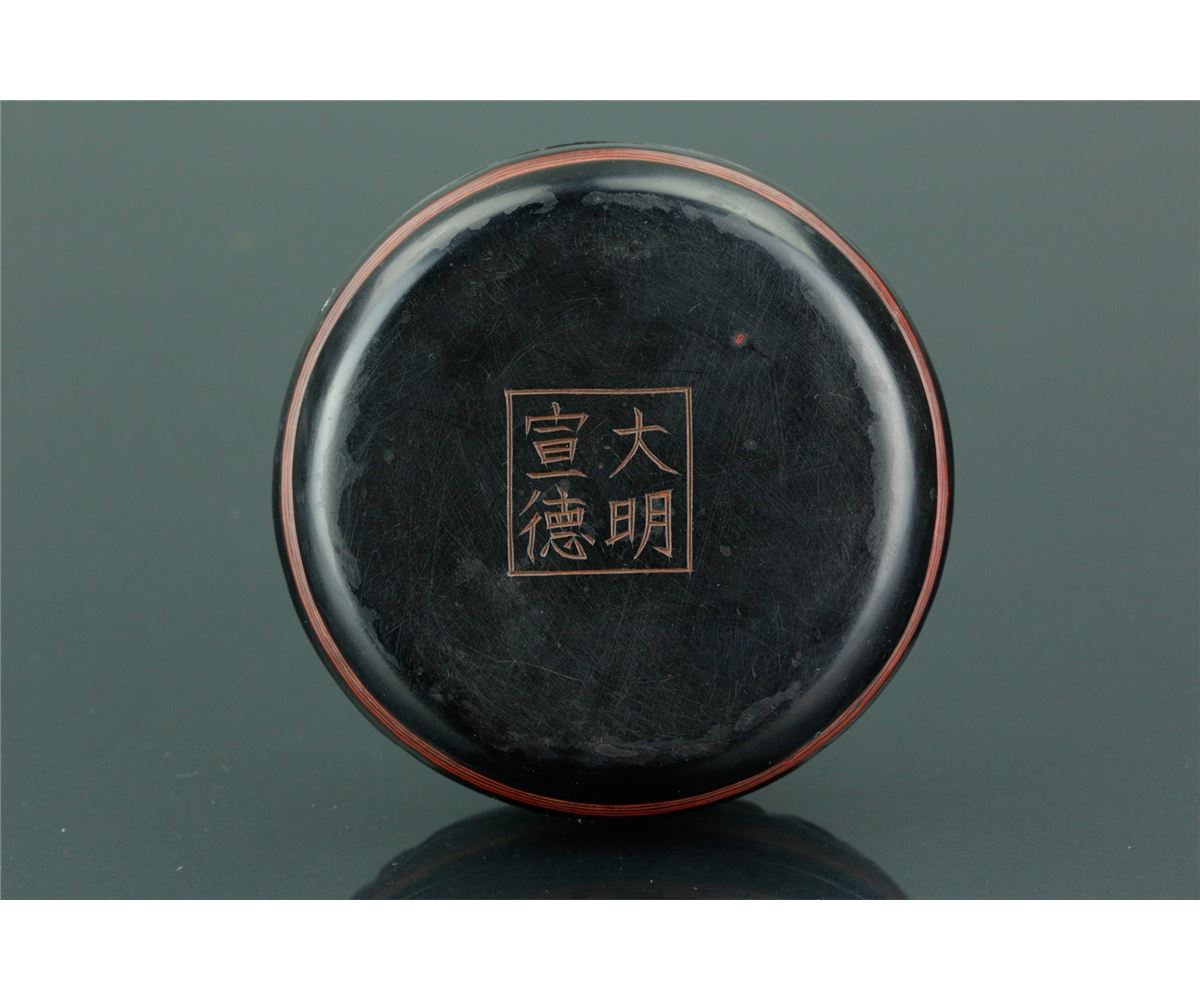 Chinese Ming style cosmetic case; featuring red lacquer drawing of archaistic scrollwork on black lacquer ground; four-character Ming Xuande mark on base; H: 2.5 cm, D: 8 cm, 56 grams