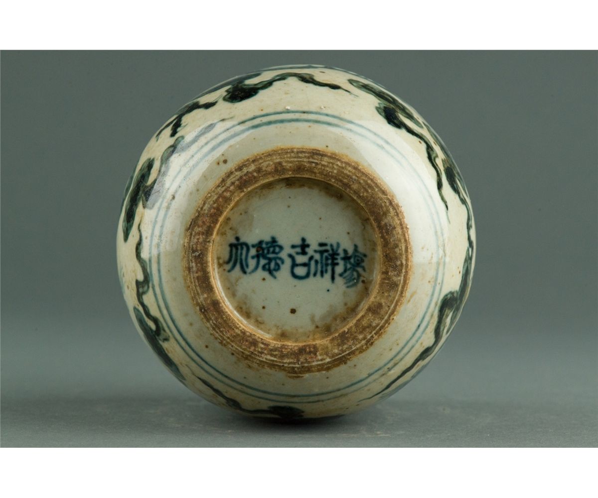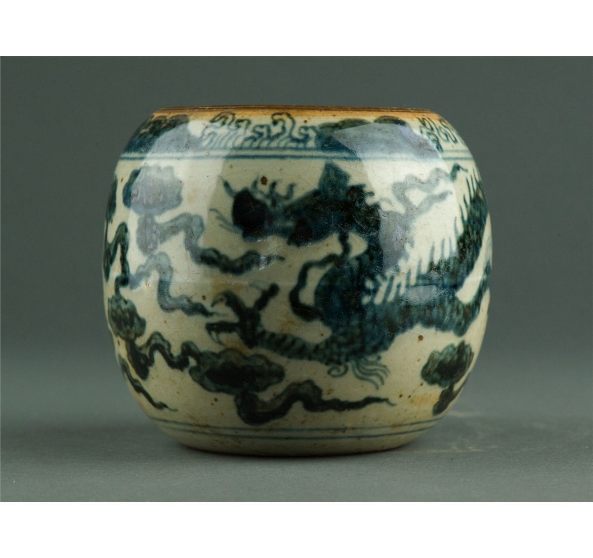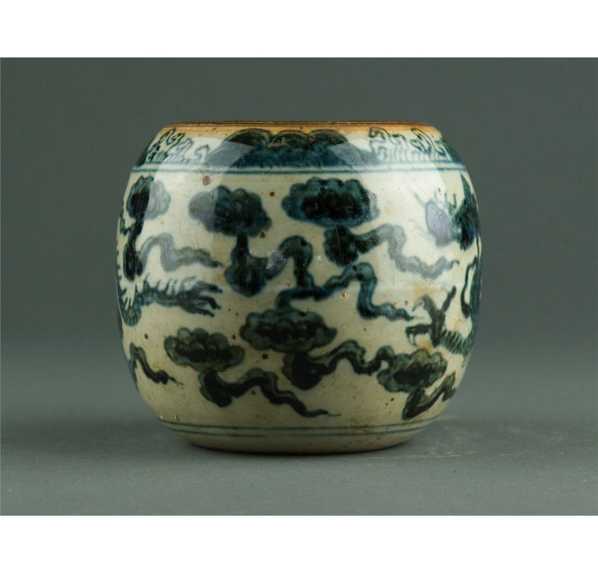 Chinese Ming style porcelain ginger jar, of drum form, decorated with dragons and clouds. Bottom marked five characters. H: 11 cm, D: 7 cm, 543 grams.